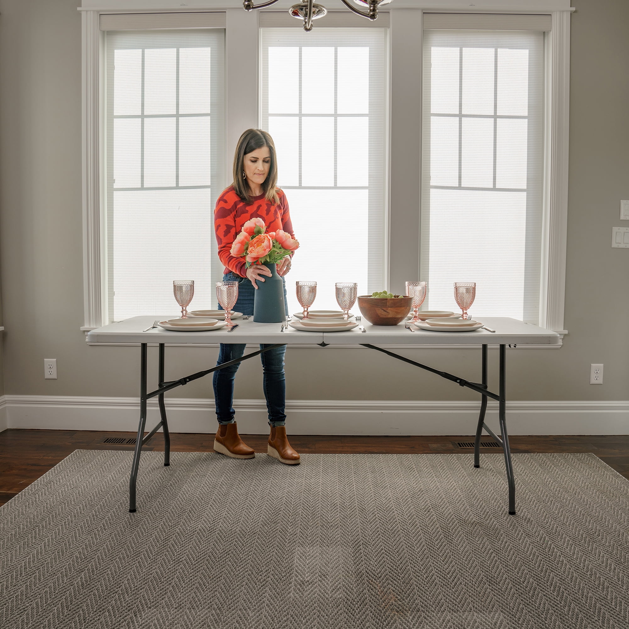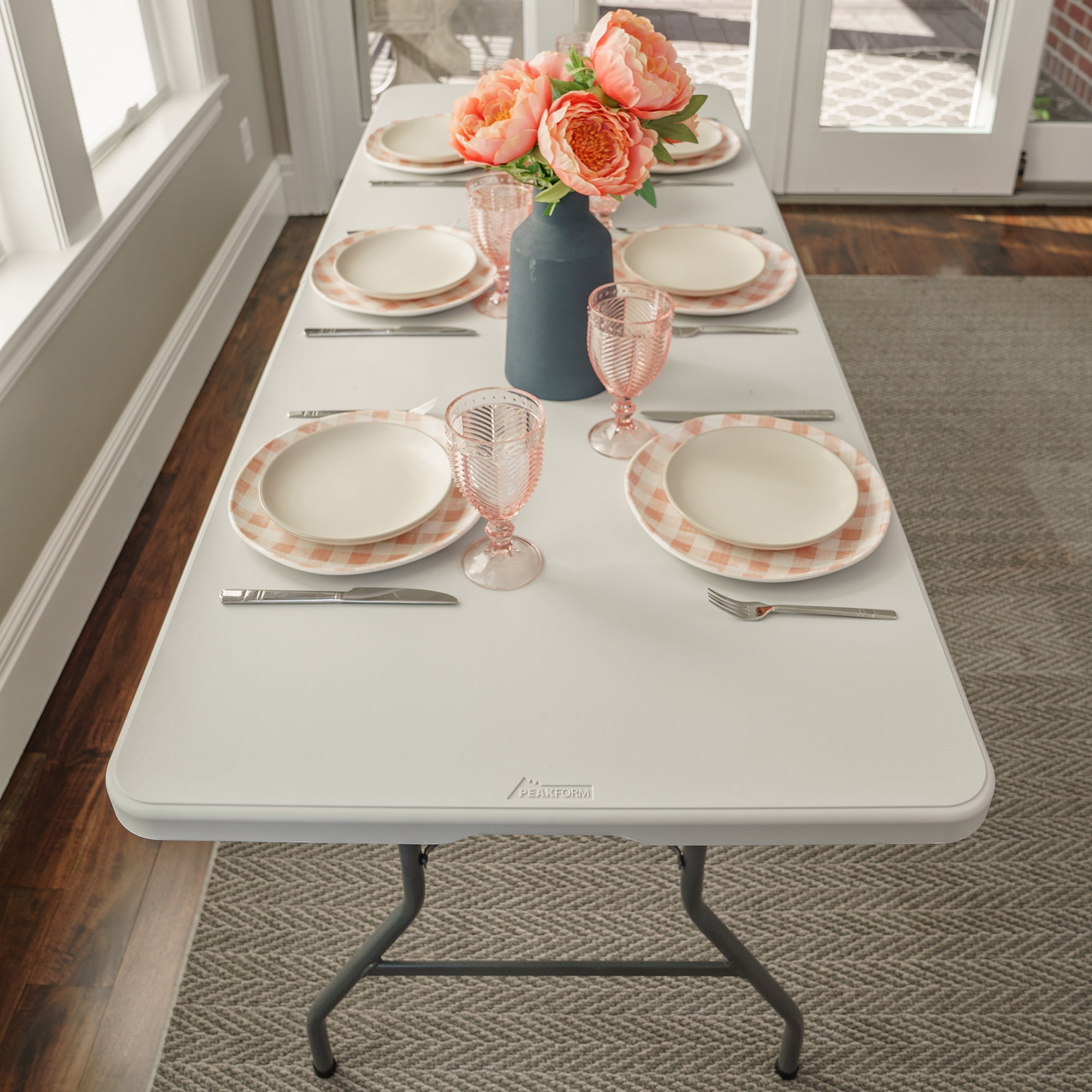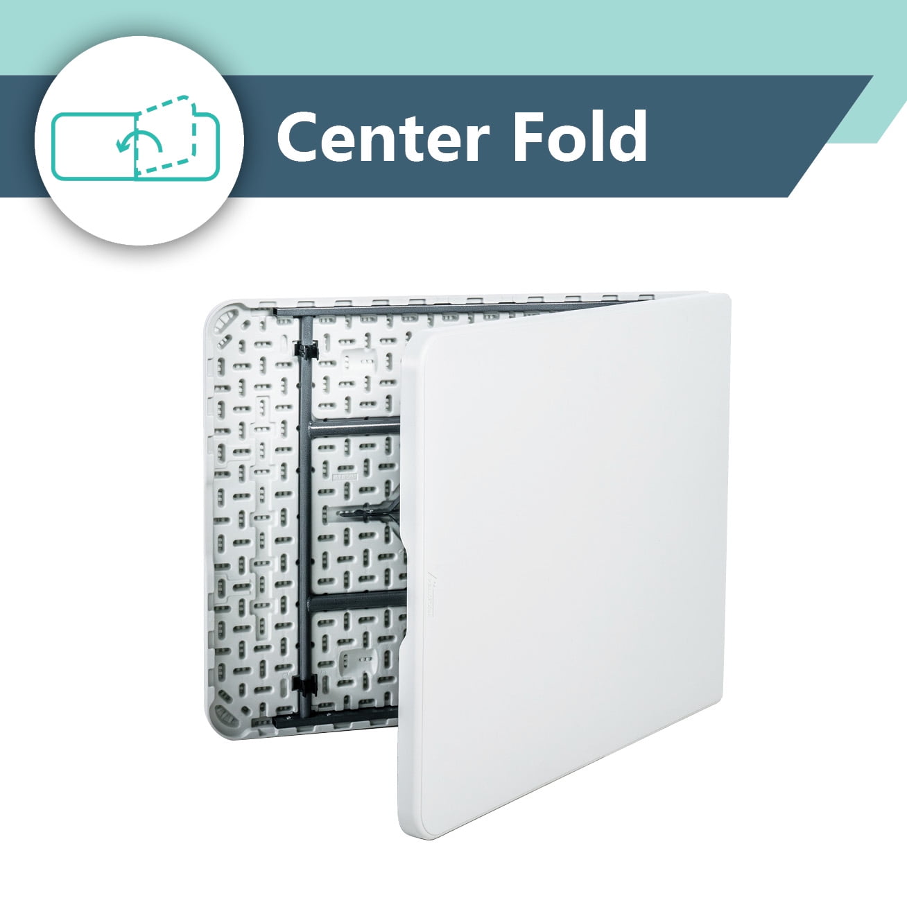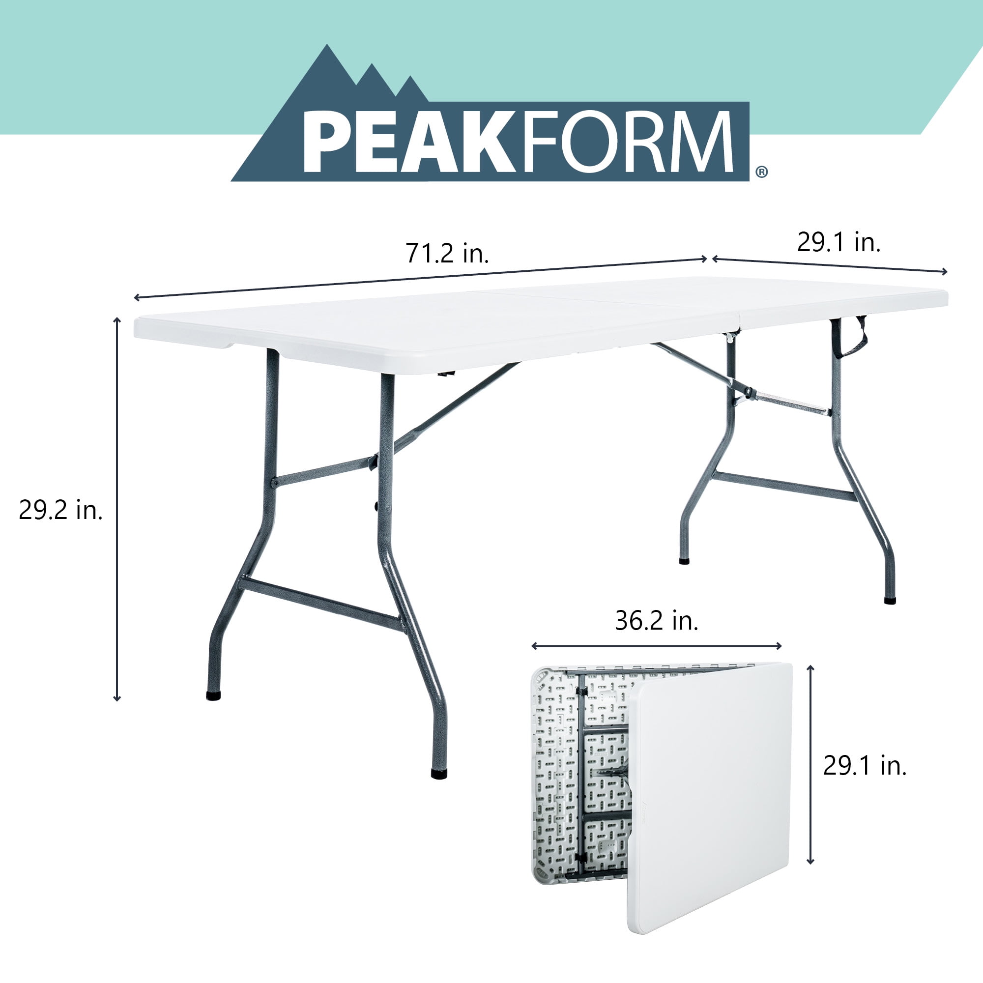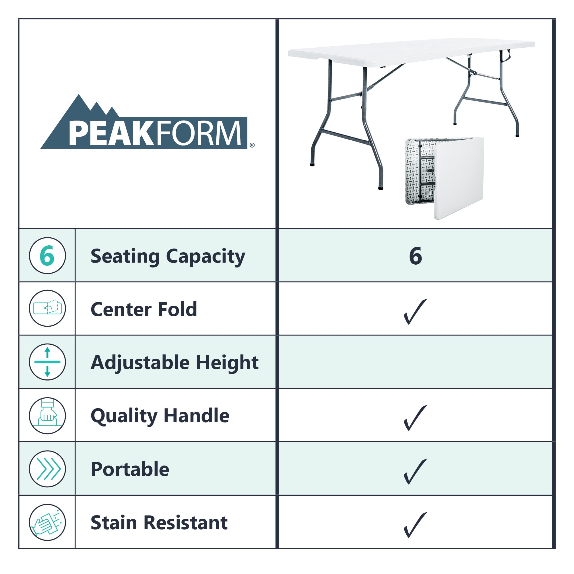 Become the ultimate host and impress your guests during every visit. Whether you need more seating space for a family dinner or birthday party, the Peak form 6-Foot Centerfold Table is a great option for every occasion. Carry the table with ease and quickly set up anywhere around your home with the lightweight build and foldable design. Maintain a great-looking table for years with the easy-to-clean tabletop. After every use, storage is a breeze with the space-saving bi-fold design. Make any gathering a seamless hosting experience with the 6-Foot Centerfold Table.