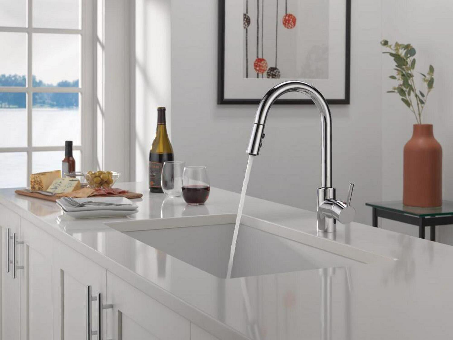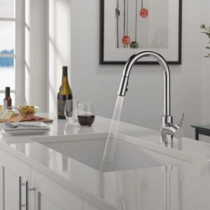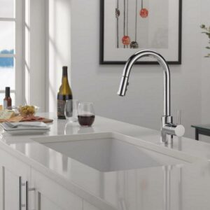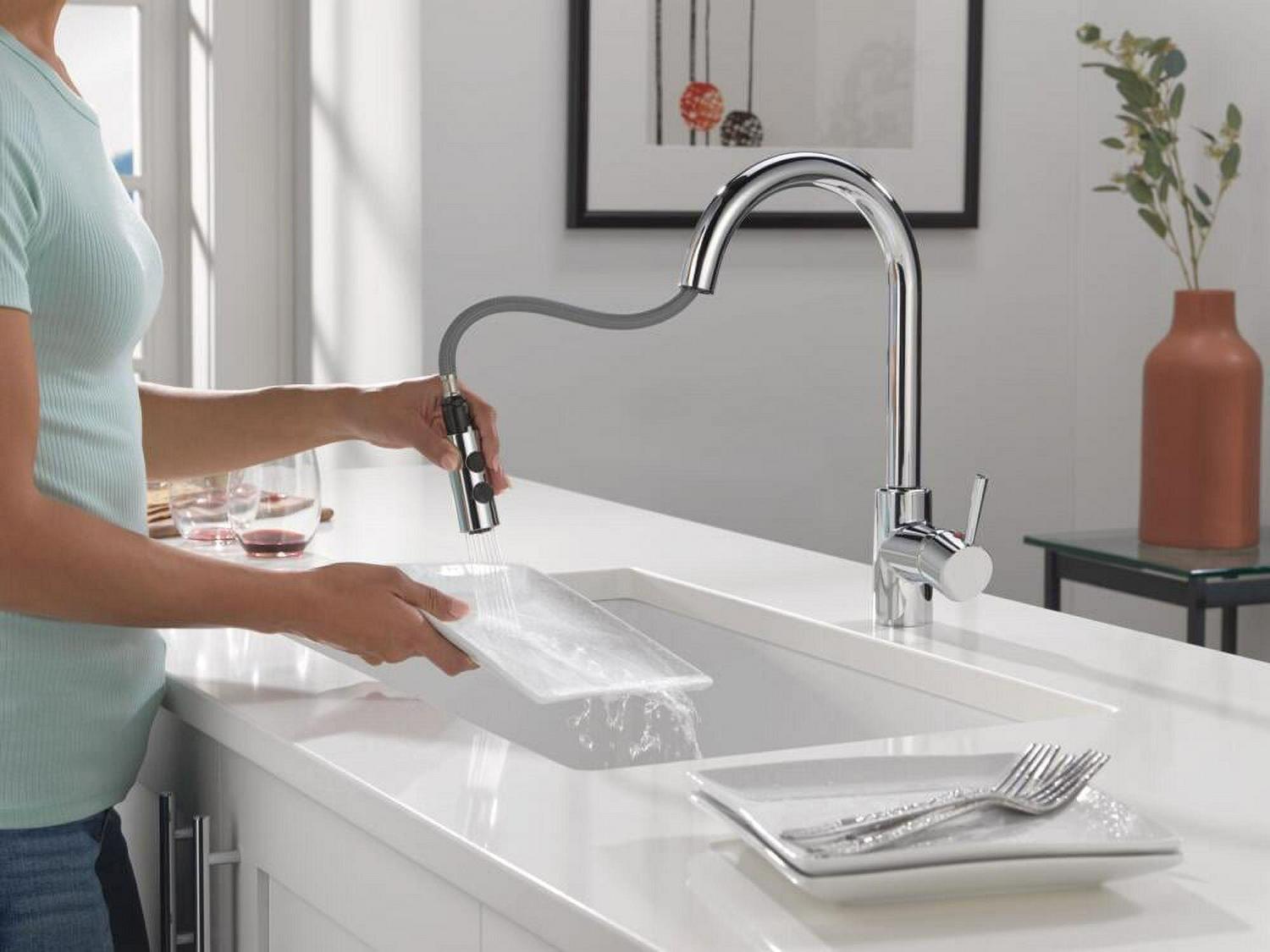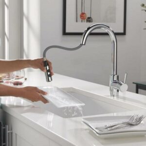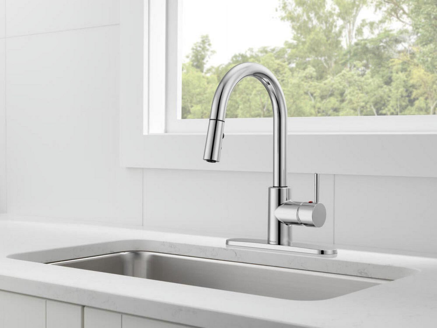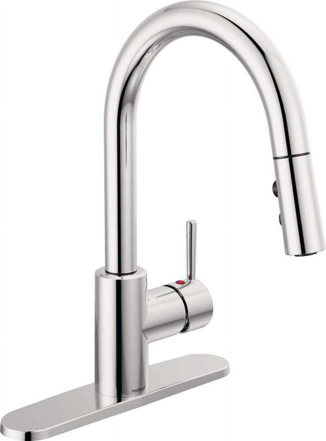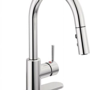 Single Handle Pull-down Kitchen Faucet fits 1 or 3 hold installation and is ADA compliant. This comes with an optional deck plate included for the 3-hole, 8″ installation. Two-function sprayer; aerated stream and spray. The high-arc, gooseneck design swivels 360 degrees with a 20″ retractable hose for added convenience during everything kitchen tasks. Peerless faucets are backed by our Lifetime Limited Warranty.