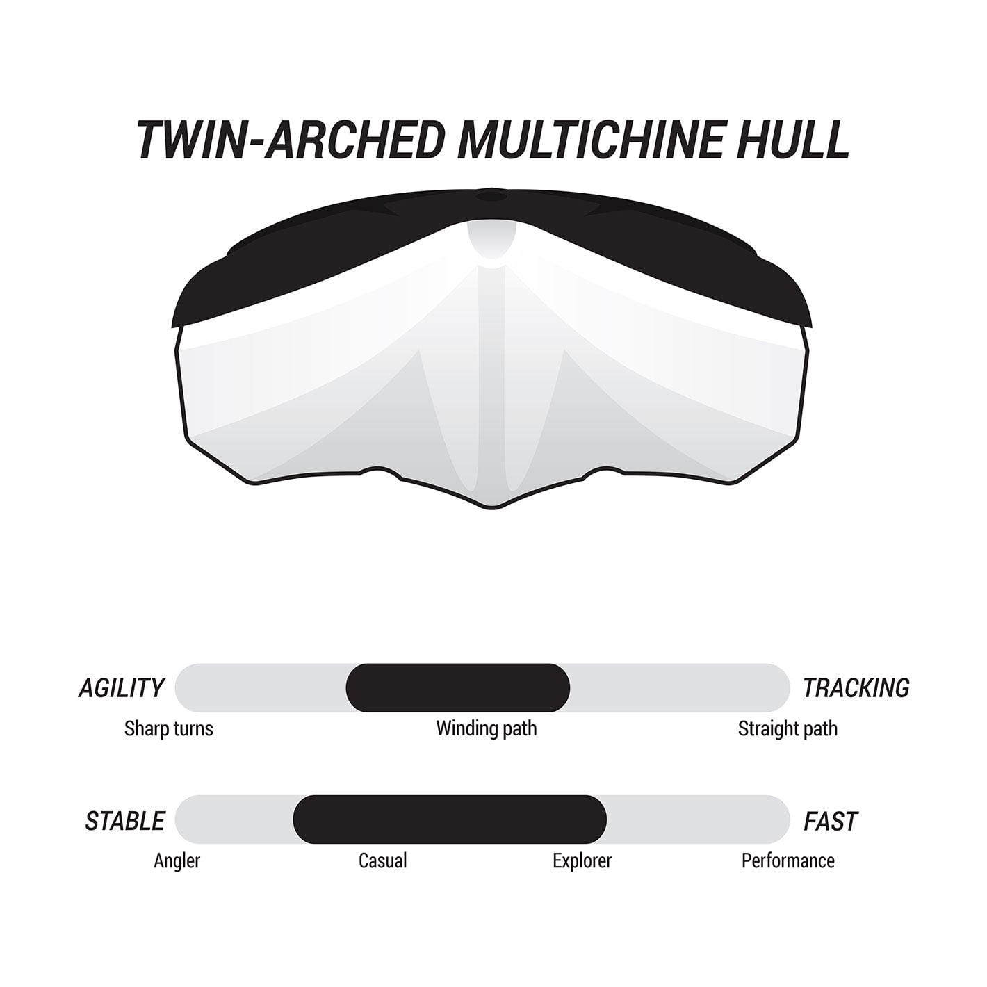– Twin-arched multi-chine hull: Feel ultra stable with a trademark hull design that increases contact surface on the water to keep you safe and confident.