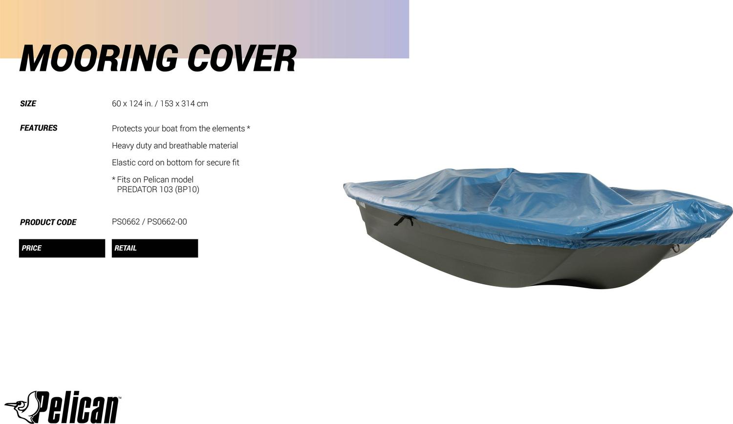 Want more time to fish A mooring cover is all you need to protect your fishing boat from the elements. This cover is made of heavy-duty and breathable material and has an elastic cord on the bottom for a secure fit. It fits on the Pelican Predator 103 fishing boat.