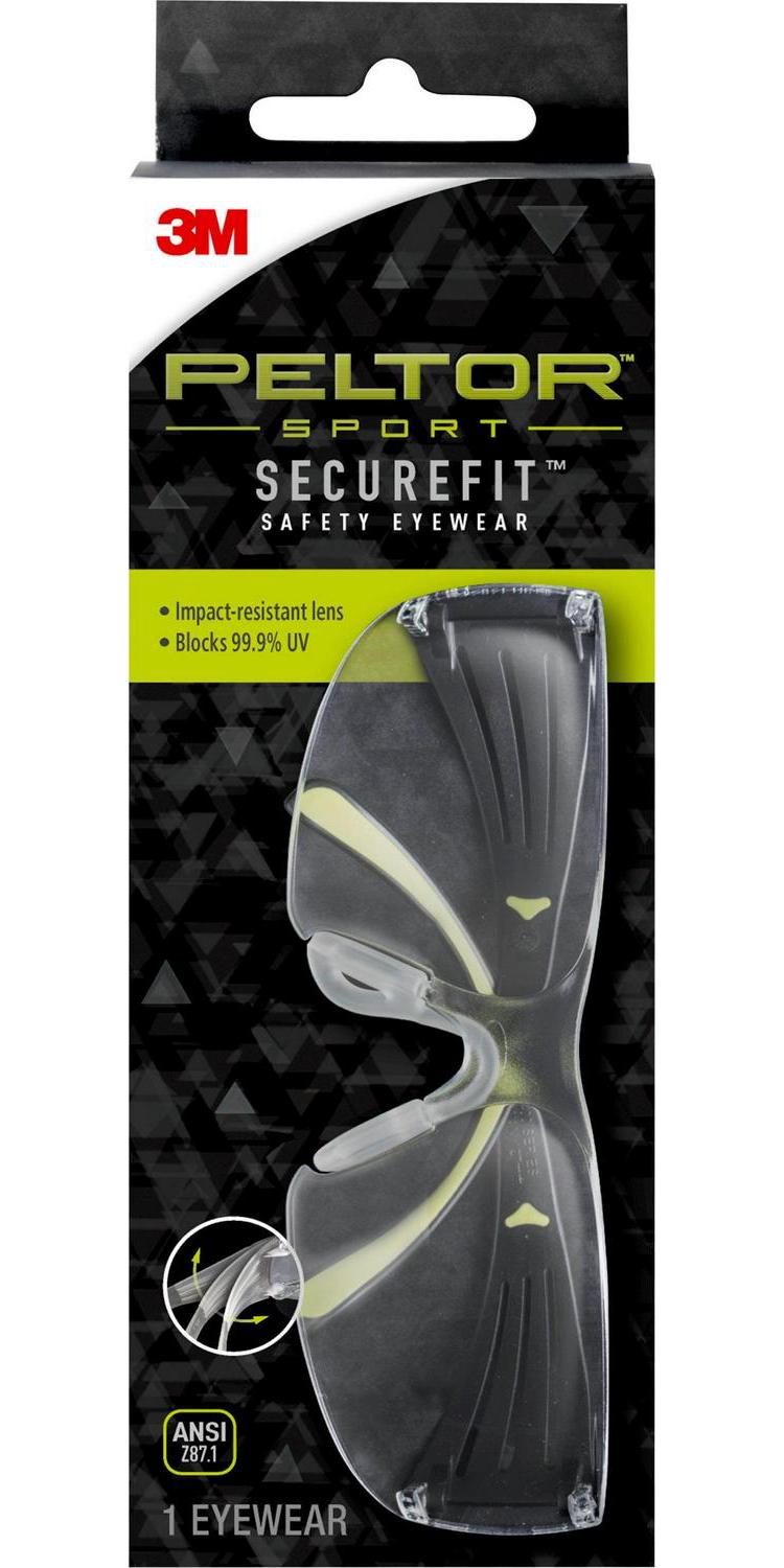 The 3M Peltor Sport Tactical 300 has a targeted NRR of 24 dB for passive sound protection. Suppresses gunshot noise and amplifies low sounds using proprietary 3M technologies. Dynamic Suppression Time measures the energy in gunshot noise and automatically sets suppression time for reduced echoes and increased comfort. Clear Voice Tracking Technology seeks voice amongst the noise to improve speech intelligibility and situational awareness. Engineered for optimal fit and comfort. Foldable and adjustable. Peltor Sport SecureFit Safety Eyewear, Black/Green Frame, Clear Polycarbonate Anti-Fog Lens, 1 Pair 3M Peltor Sport SecureFit 400 protective eyewear with Clear lens. Low profile, flexible temples are ideal for use with hearing protection. Contemporary, lightweight and wraparound lens design provides excellent coverage and good field of vision. Blocks 99.9% UV. The lens is constructed of a polycarbonate, clear lens with anti fog coating. Meets ANSI Z87.1 2010