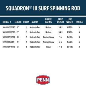 – PENN SQUADRON II 12 SPINNING ROD: Built for versatility and dependability. Surf spinning rod with premium hardware and 2 piece graphite construction.