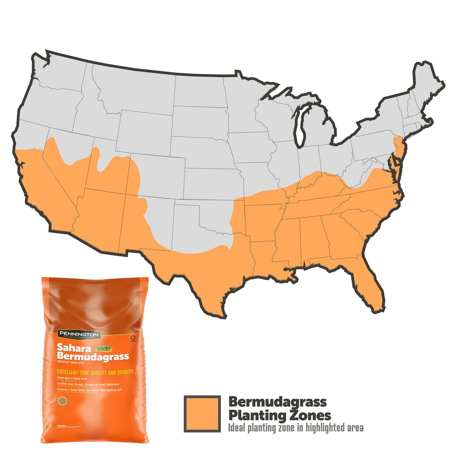 Pennington Sahara Bermudagrass Grass Seed is a hardy variety of drought-tolerant Bermudagrass that has been bred to grow finer and greener than other common grasses. Bermuda is best adapted to southern zones. It is extremely durable and holds up well to heavy foot traffic. It grows well in sunny areas but is not very shade-tolerant. It produces a thick, dark green, self-repairing growth for your lawn that is 99% weed-free.