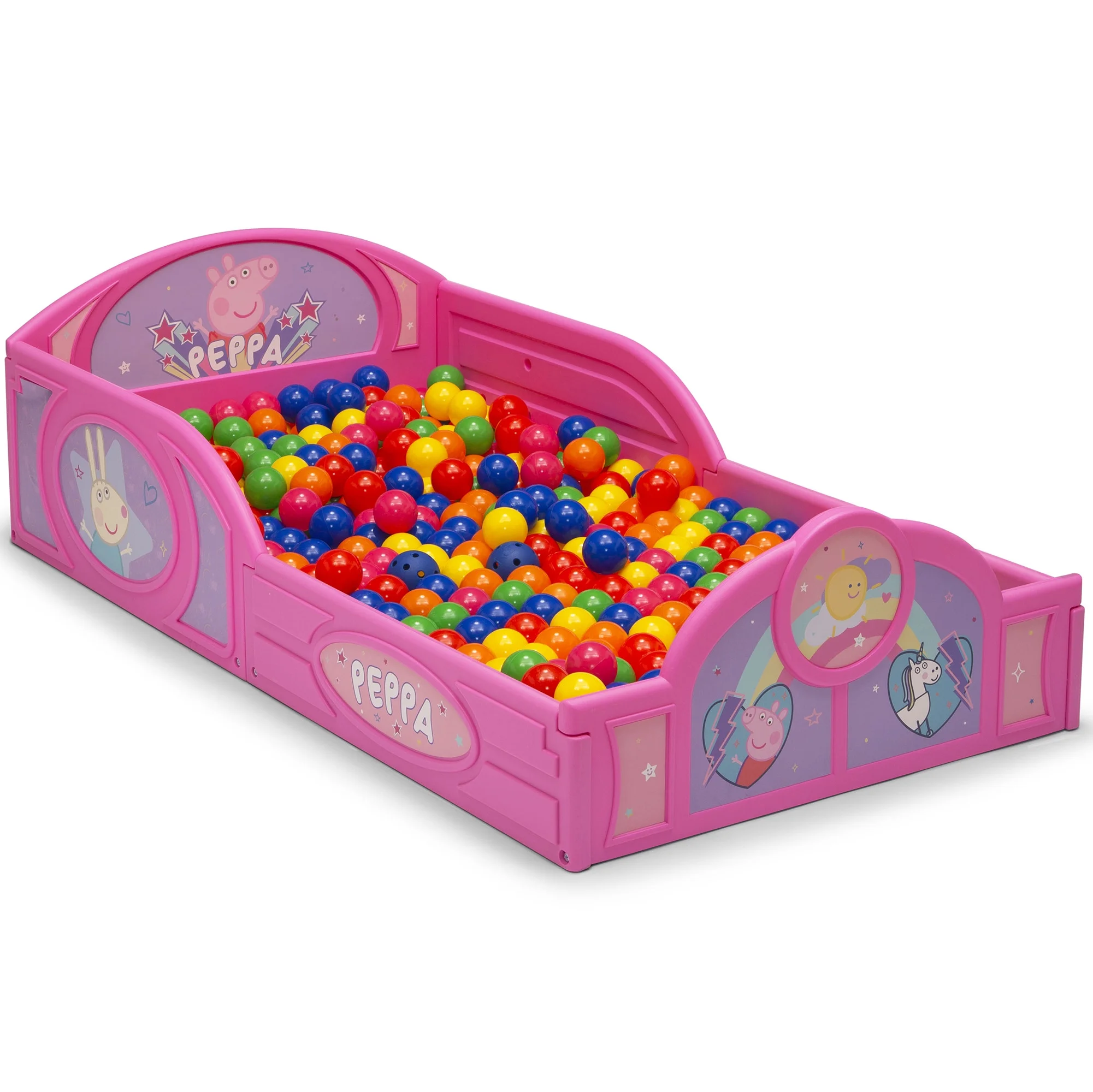 Oh! Your little one will go hog wild for this Peppa Pig Plastic Sleep and Play Toddler Bed by Delta Children! Featuring colorful decals of Peppa, Rebecca Rabbit, and Suzy Sheep, this kids toddler bed will inspire the sweetest dreams. The bed’s low mattress height and built-in guardrails make it the best option for your child’s first big-kid bed, giving them the independence they crave while keeping them safe throughout the night. And that’s not all, the bed’s versatile plastic frame can also be used as a play enclosure or a ton of other fun things, like a ball pit (play balls not included). Get this toddler bed today and bring home the magic of Peppa Pig!