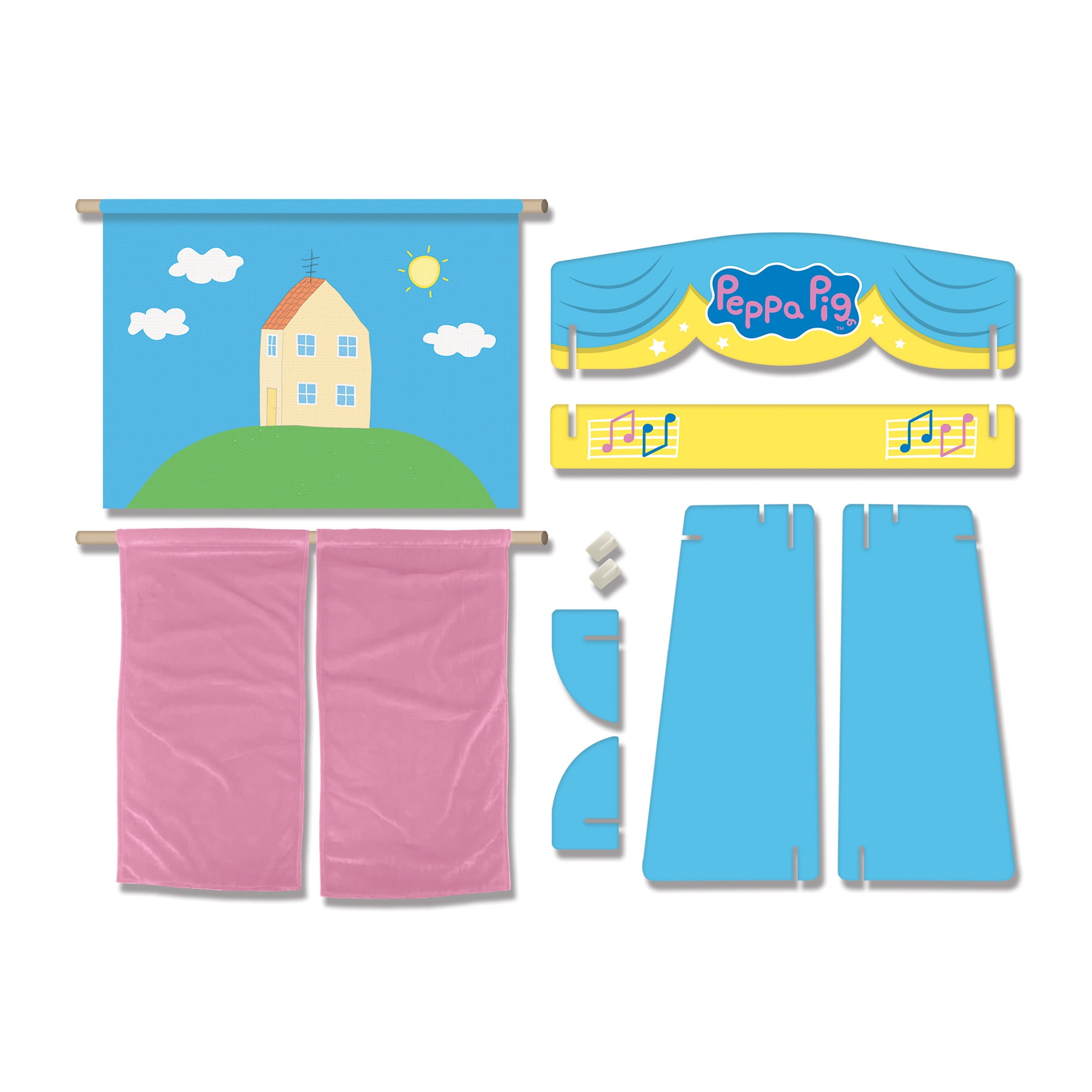 Let your child’s imagination come to life with the Peppa Pig Wood Theatre with 4 Puppets! Includes four soft and cuddly hand puppets, featuring fan-favourite characters Peppa, George, Mummy and Daddy Pig. Sized perfectly for little hands, the tabletop theatre is two feet wide and comes with a real working curtain and two backdrops to inspire countless stories and performances. Assembling the theatre is a breeze, making it the perfect choice for busy parents. A fun way to spark your child’s creativity, it helps develop important skills like motor skills, hand-eye coordination, communication skills, and self-confidence. Made from soft and durable plush material. You can trust that this toy is made to the highest quality standards, with a focus on nurturing young minds and hearts. Suitable for all children ages 3 and up. The Peppa Pig Puppet Theatre is sure to provide hours of entertainment and imaginative play.