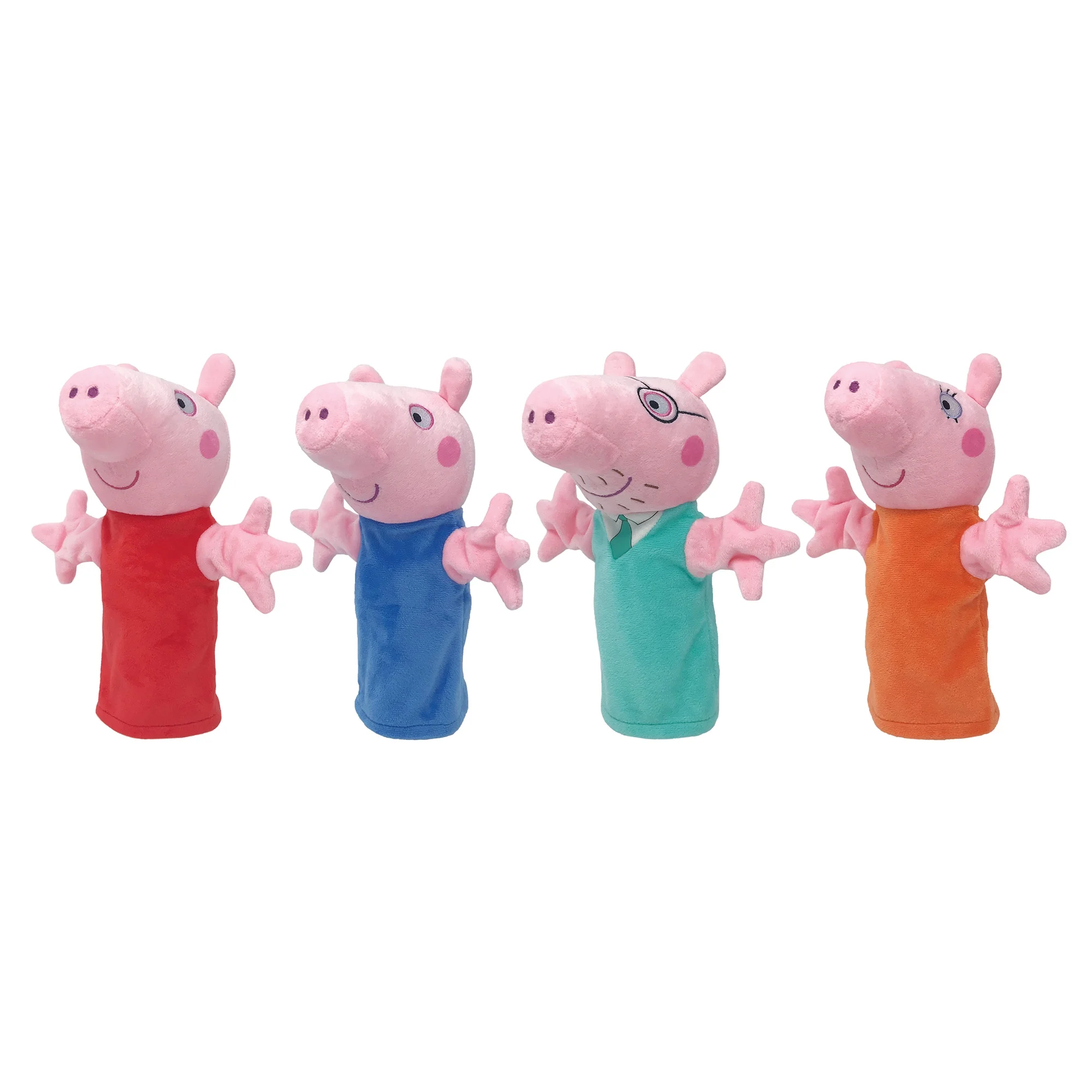 Join in the fun of Peppa Pig characters with these soft and cuddly hand puppets. The Peppa Pig Wood Puppet Theater includes four hand puppets, Peppa Pig, Borther George, Mummy and Daddy Pig. Designed especially for little hands, this tabletop theater, almost 2 feet wide, allows the star in your child to come to life. The Theater has a real working curtain, 2 backdrops to inspire many stories and much more. It’s super easy to assemble! This hand-puppet set has been sized to fit children and most adults. Kids learn motor skills, hand-eye coordination, communication skills, self-confidence, and more.