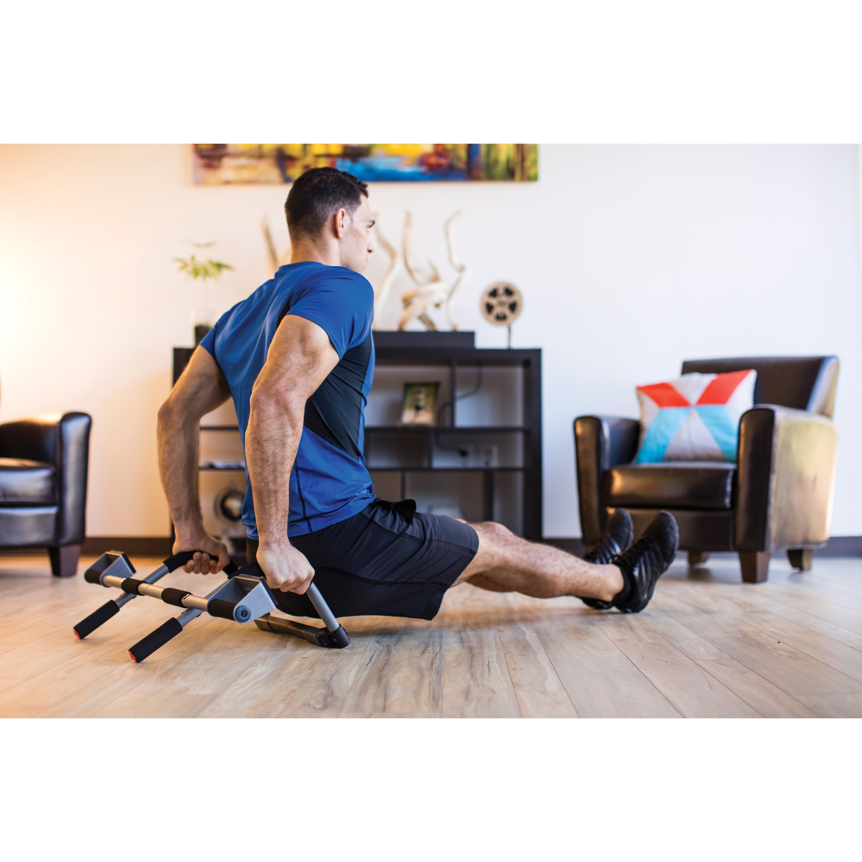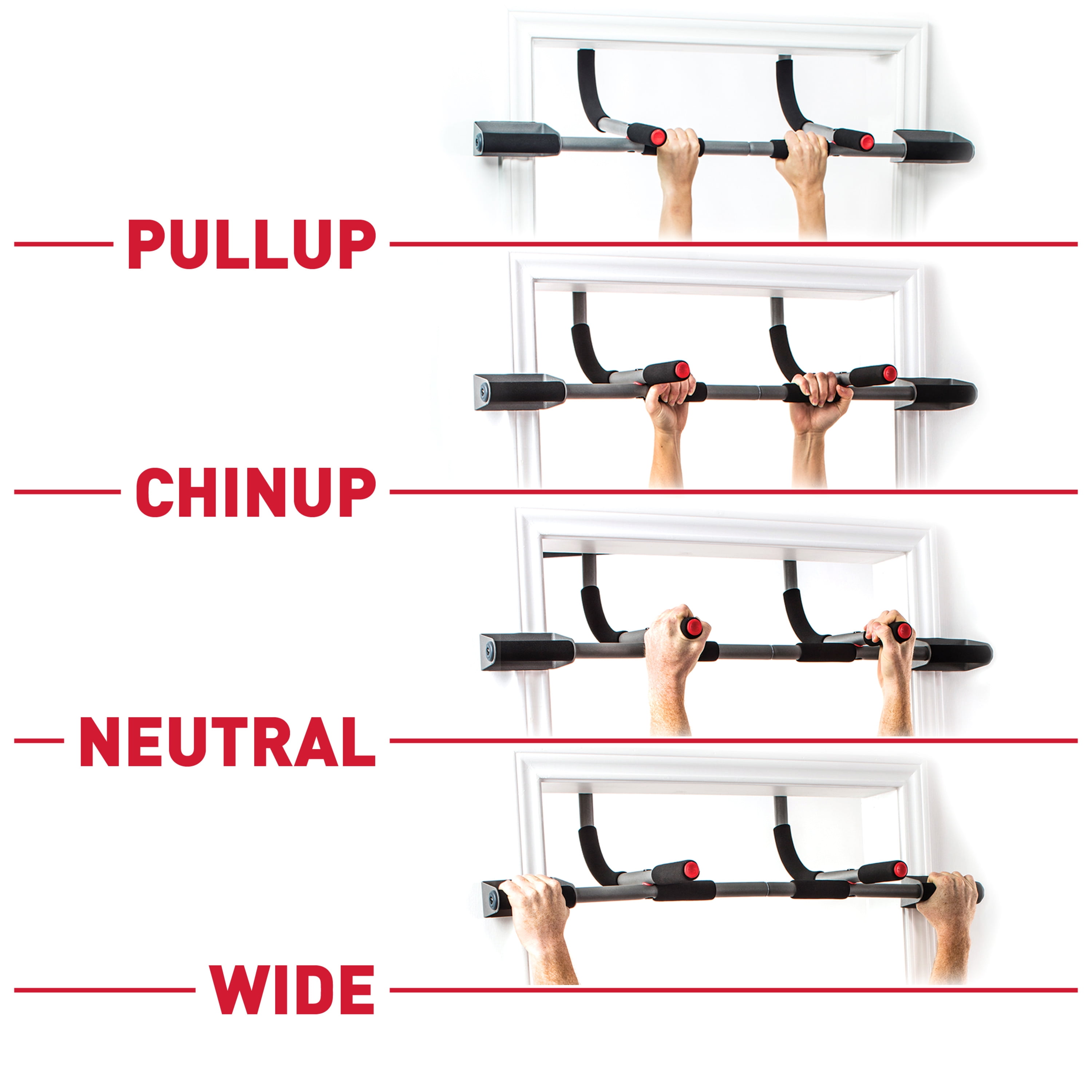 PORTABLE GYM: Portable gym that can be used as a doorway pull up bar or for sit-ups, pushups, and dips; 300 pound weight capacity MULTIPLE GRIP OPTIONS: Extra wide handles for 3 grip options: close, normal or hammer grip pullups; padded handles ensure comfort for sit-ups, pushups and dips VERSATILE: When turned over, use padded handles for sit-ups, pushups and dips Patented door frame guard and two-way adjustable design; fits door frames up to 33″ wide and up to 6″ deep DIMENSIONS: Assembled dimension are: 15 x 38 x 14 “