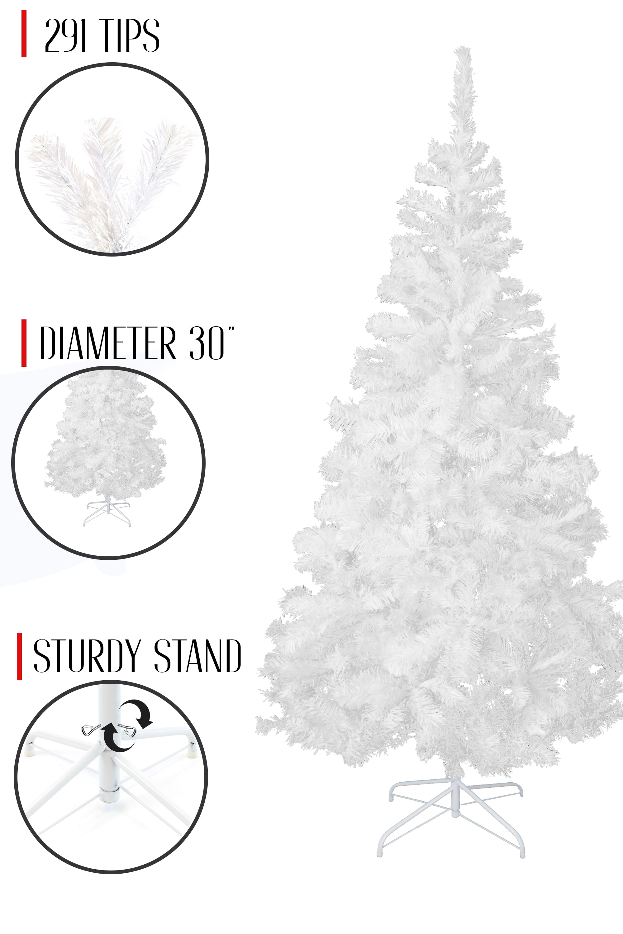 PHOL1016 Features Beautifully crafted with 291 PVC tips Built with hinged branches for easy storage Includes heavy duty metal stand Product Type: Artificial Leaf/Needle Color: White Tip Material: PVC (polyvinyl chloride) Frame Material: Metal Number of Items Included: 2 Stand Included: Yes Tree Family: Spruce trees Number of Tips: 291 Holiday Theme: Yes Seasonal Theme: Yes Frame Material Details: Cast iron Holiday: Christmas Season: Winter Dimensions Tree Height – Top to Bottom: 48” Tree Depth – Front to Back: 28” Tree Width – Side to Side: 28”