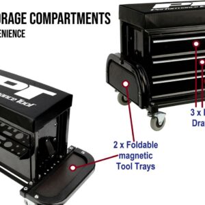 - Creeper Seat with 3-drawer mechanics tool box and 2-foldable magnetic tool trays