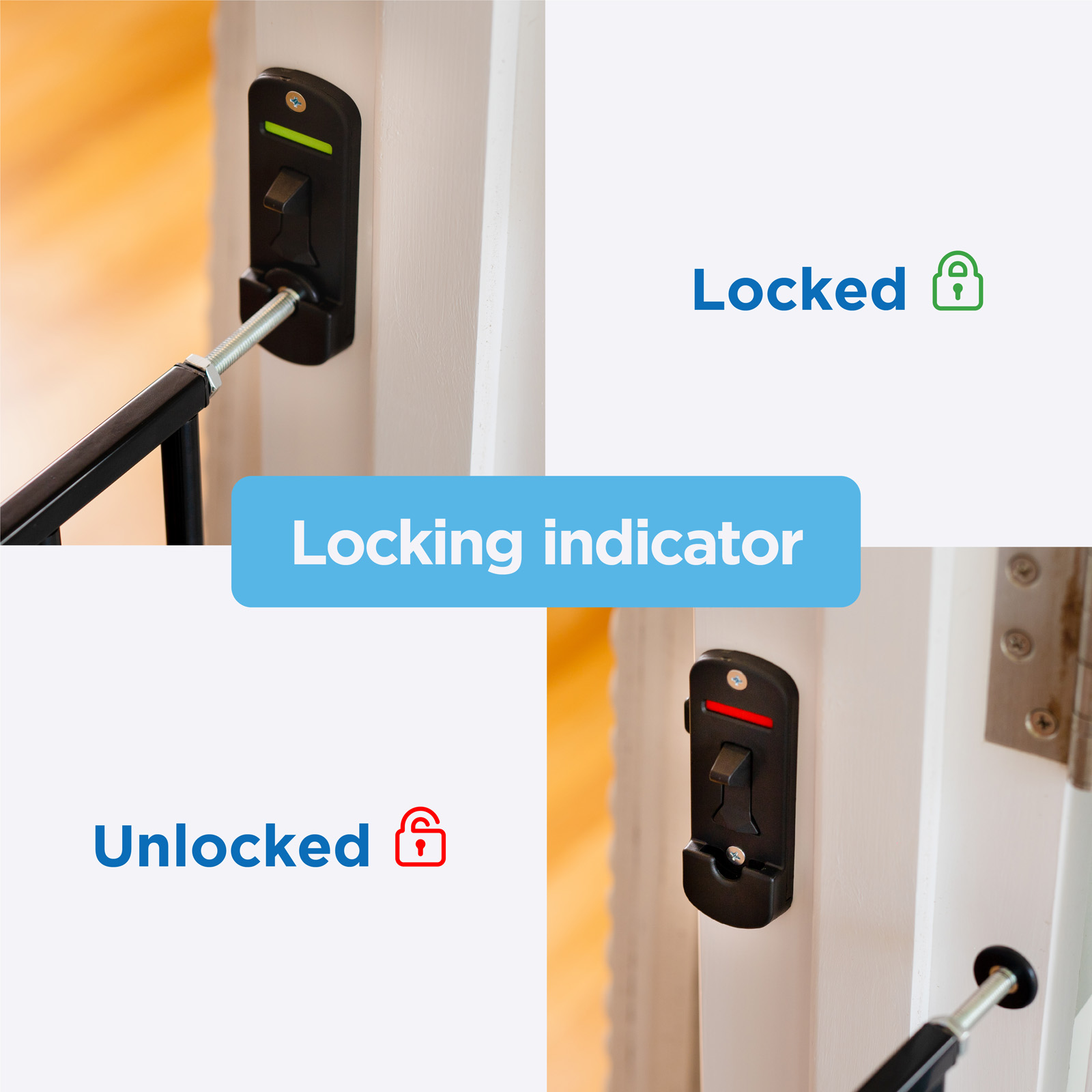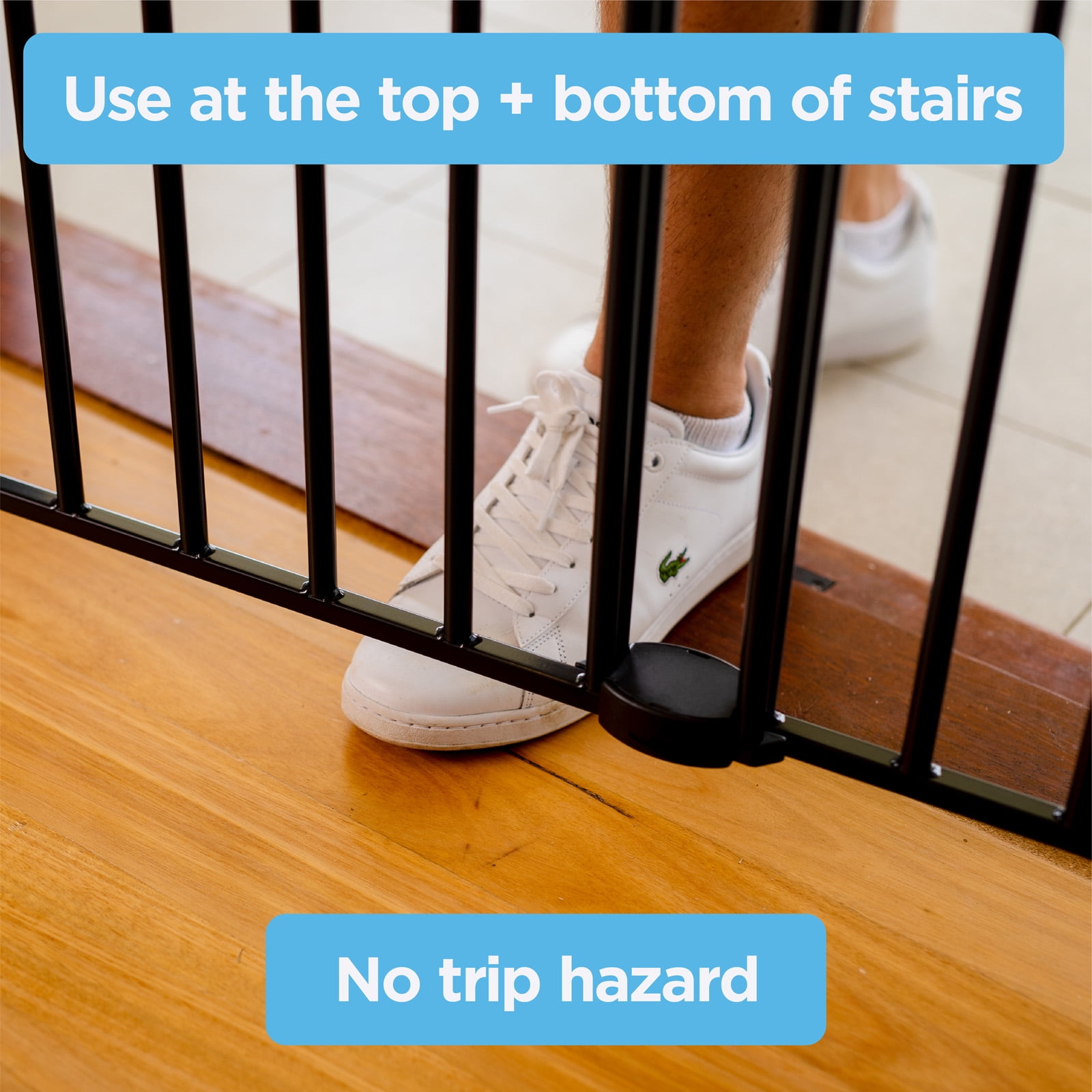 The Perma Child Safety Black Extra Tall & Wide Superior Swing Gate suits openings 32.3” – 55.9” wide and is 36” tall. Suitable for infants 6-24 months and pets 10-40 pounds, this hardware mounted gate securely mounts to the wall instead of resting on the floor like other baby gates creating a trip-hazard free installation. The integrated 2-way swing direction control is ideal for making a safe, closed off environment to play. The secure handle allows for easy one-handed operation and has a built in red/green locking indicator. Worry less with ultimate safety, all Perma Child Safety baby gates are tested to the highest safety standards, meeting or exceeding both ASTM or EN standards.