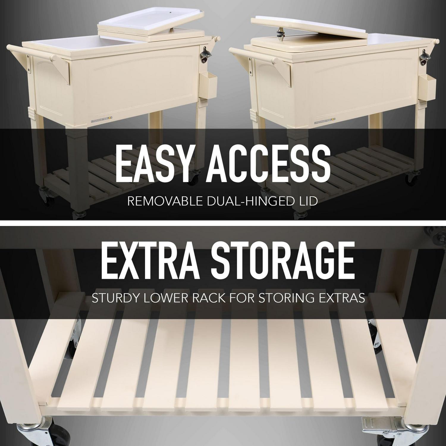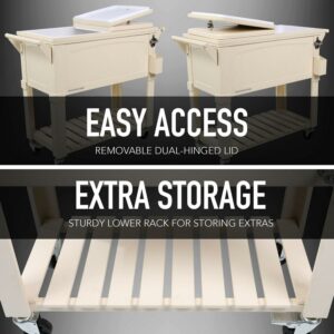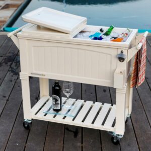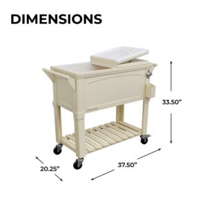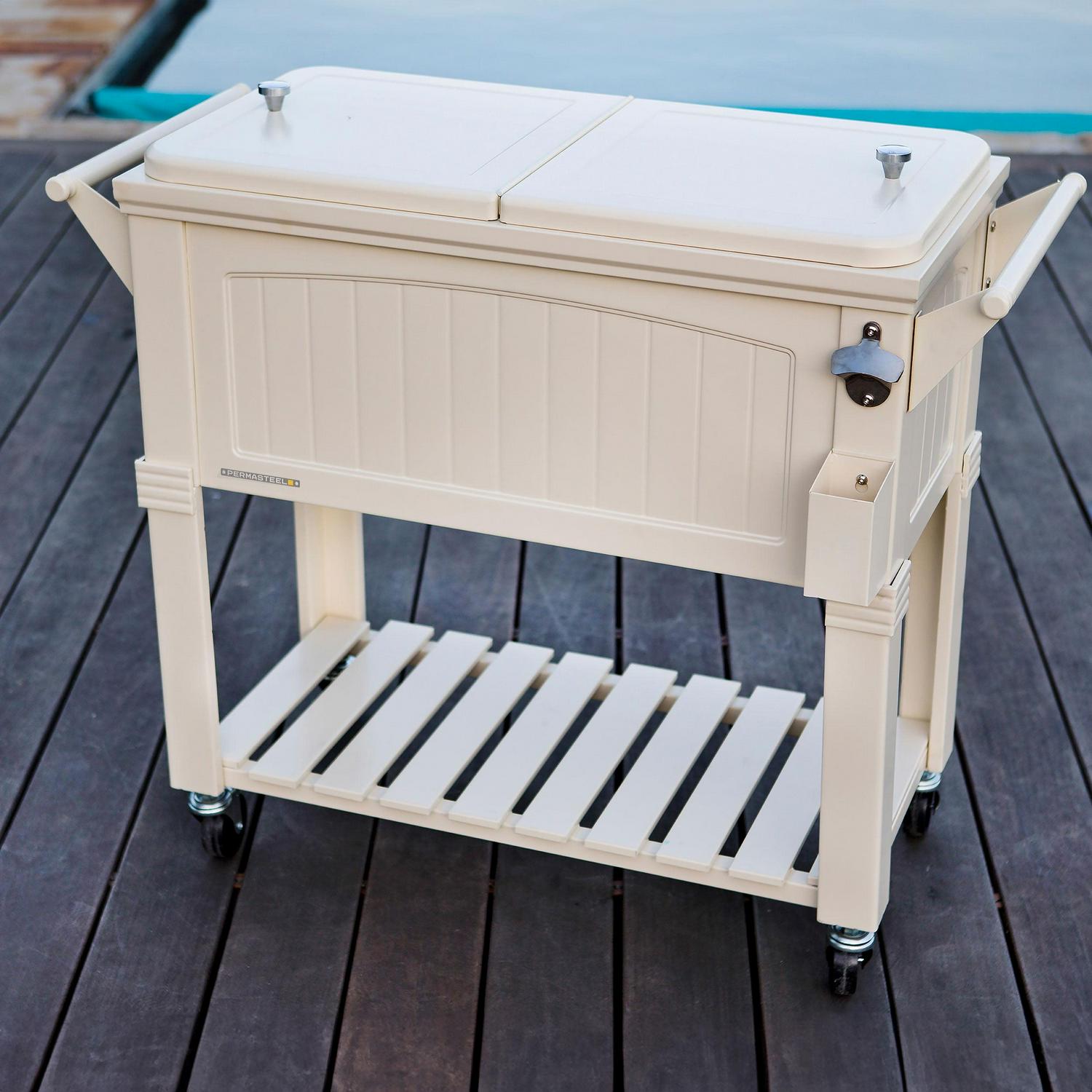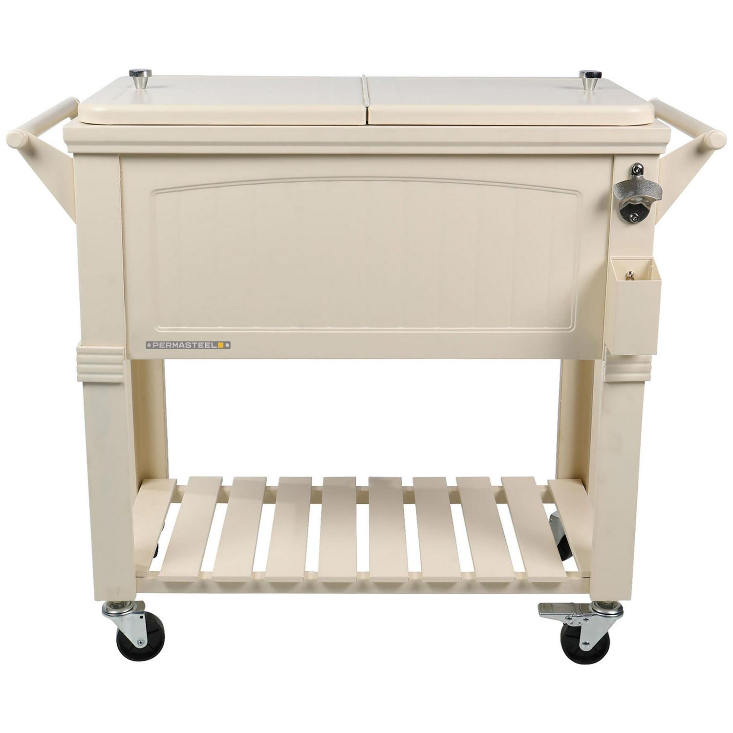 Permasteel 80-Qt Antique Outdoor Steel Patio Cooler on Wheels, Rolling Cooler Cart, Wooden Teak Style, Cream