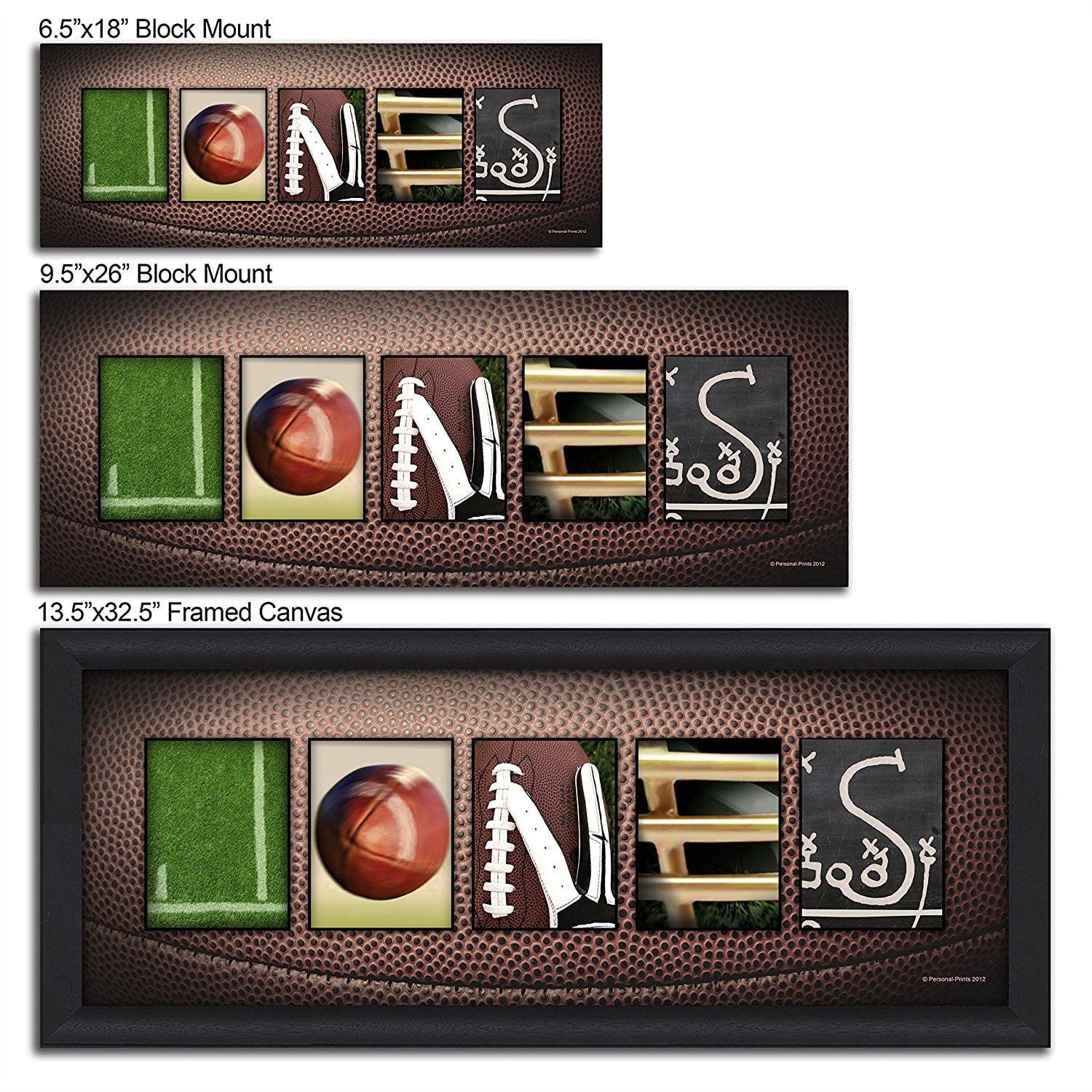 Personalized with your name and customized with your choice of photos, this stunning work of wall art is created using hi-res photography of footballs, fields, goal posts, etc! Display on the wall your passion for everything football. From the photography to publishing to shipping, everything is hand crafted in house at a family owned and operated Colorado art studio. Comes ready-to-hang as a frameless wood block mount or a framed canvas giclée. Each print also includes a certificate of authenticity. This custom art is as unique as he is and a perfect gift for a boy s room, for him, for the holidays, for the home, for the football player, for the football enthusiast, for the man cave, or even for the office. Wood Block Mount: Our wood block mount is a contemporary and frame-less way to have your print displayed. The image is professionally sealed behind a glossy artist s laminate atop a 3/8 thick wooden block using an acid-free adhesive. The sides of the block are black and comes ready to hang on the wall. Framed Canvas Giclee: Published as a giclee on fine art canvas and finished in a custom wood frame, this personalized canvas wall art is coated with a UV resistant spray and, like all canvas art, does NOT require glass. Framing is done in-house using acid free archival materials. Comes ready to hang and enjoy!