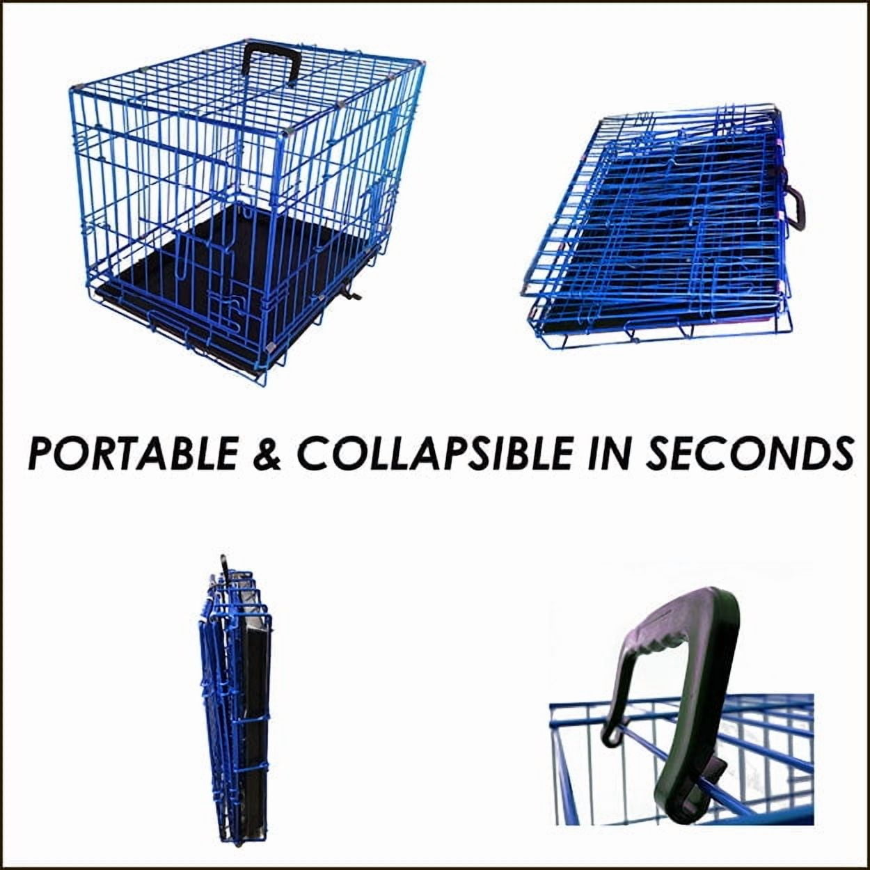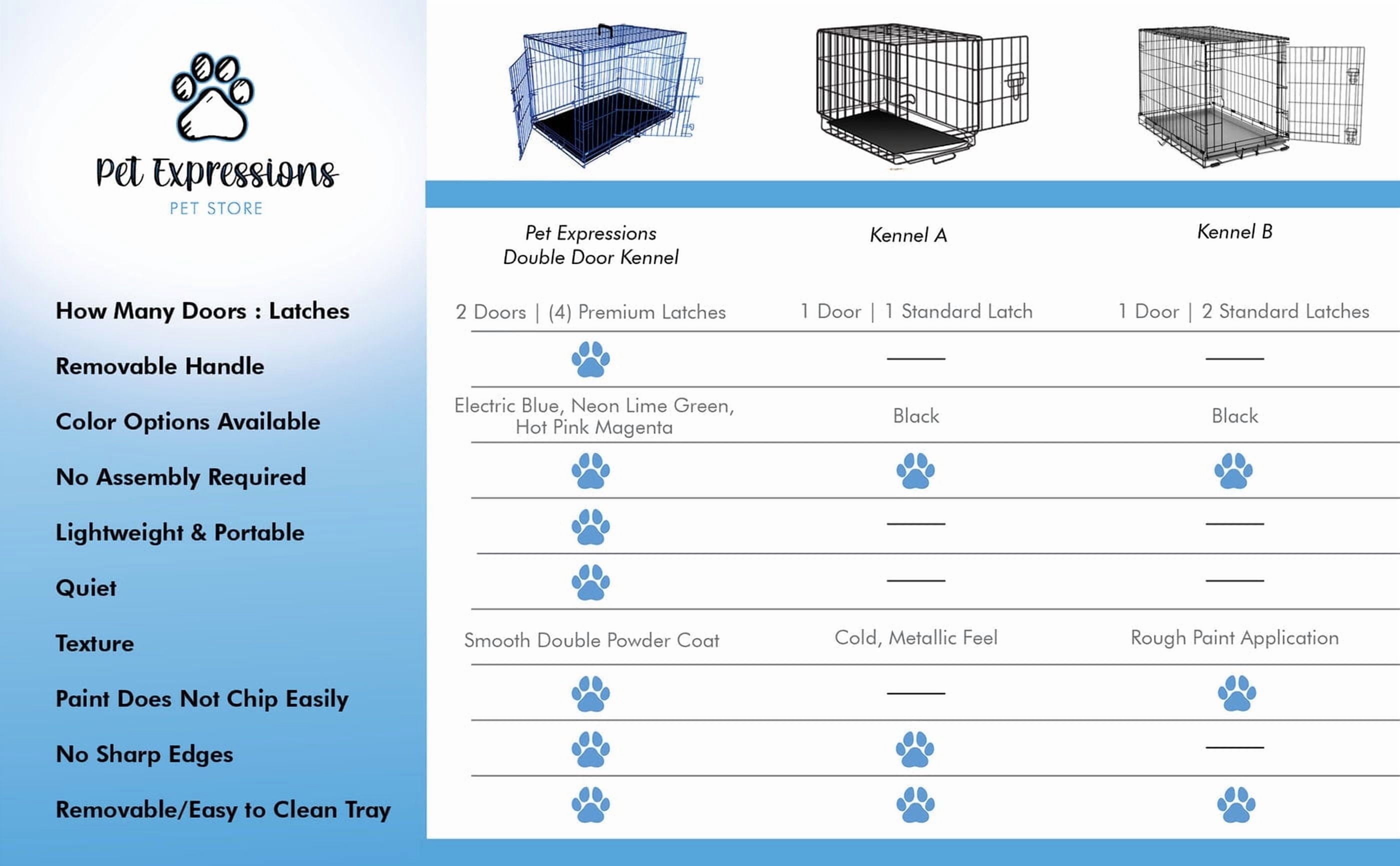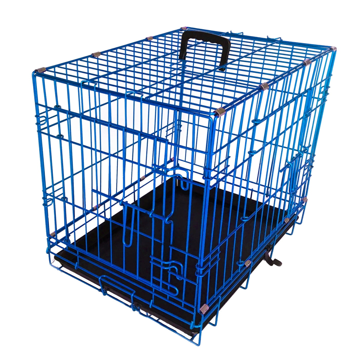 Pet Expressions Double Door Pet Crate| Keep your pet safe with our Pet Expressions Wire dog kennel. This kennel features double doors for your convenience with a front and side door that latch with not only two side bolt latches, but also requires you to lift the door as well, offering extra protection to help keep your pet from those occasional escapes. Our kennels are also equipped with a leak proof heavy duty plastic pan that is removable for easy cleaning and a detachable handle. Made of sturdy wire and with a double coating for a bright vibrant blue color, this kennel is perfect for any pet that likes to scratch, bite or try and dig their way out. Collapsible and foldable for easy storage and transportation.