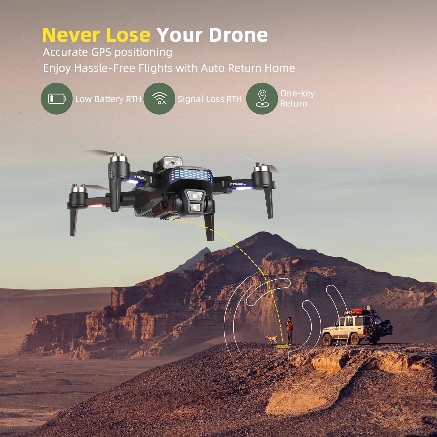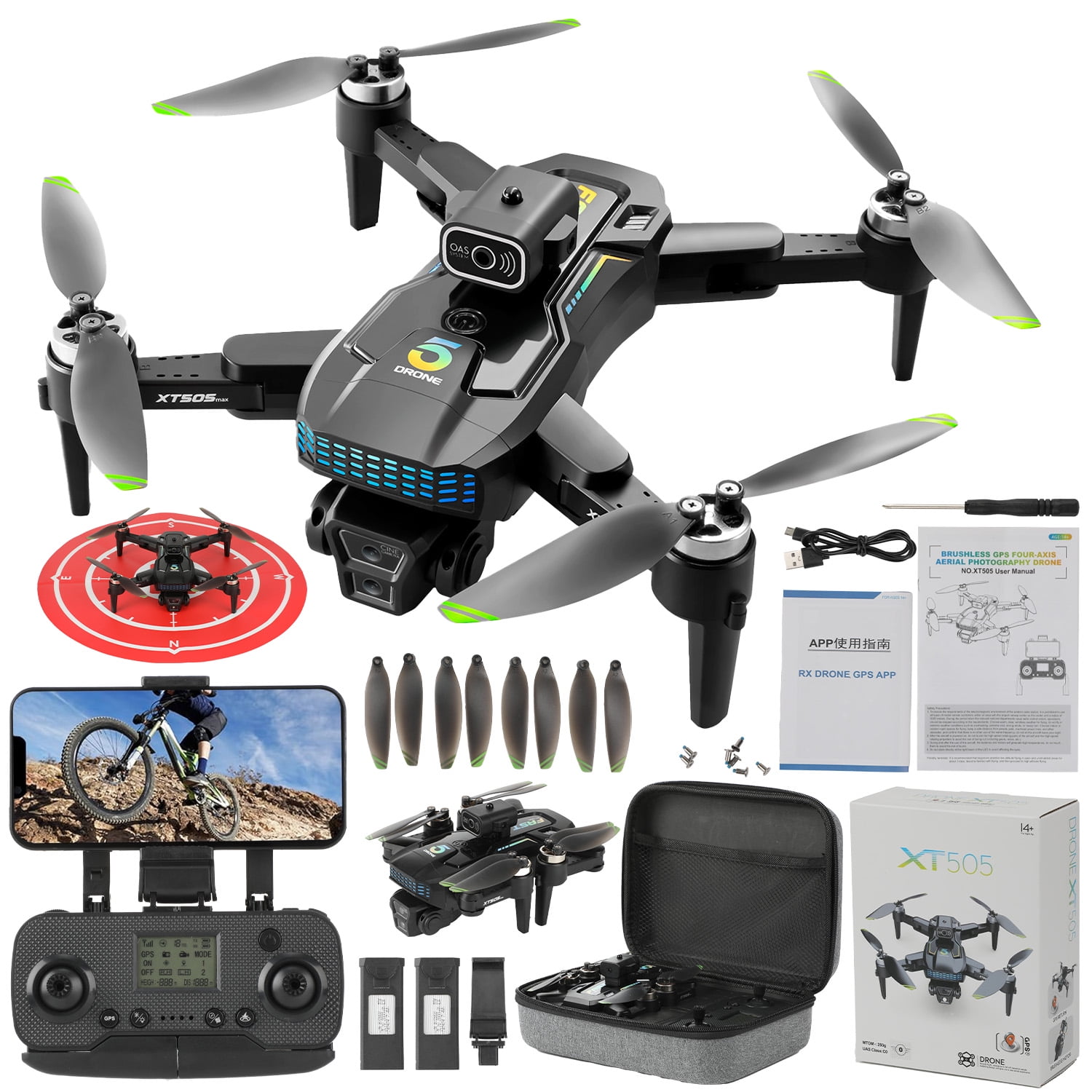 Discover the ultimate aerial photography experience with our advanced drone. Capture stunning 4K photos and videos from any angle with dual high-definition lenses and EIS electronic stabilization. Enjoy peace of mind with reliable GPS positioning and safety features like one-click return and low battery return. Fly longer with up to 40 minutes of flight time, thanks to high-capacity batteries. Unleash your creativity with smart flight modes and customizable routes via the APP. Powered by durable brushless motors, our drone ensures a powerful and safe flying experience. Specifications: Product size: Folding: 14 * 10 * 7.5CM Open: 26.5 * 23.5 * 7.5CM Receiving frequency: 5G Packaging size: 24.5 * 19 * 9 CM Drone weight: 184 grams Body battery: 3.7V 2000Mah Charging time: 120 minutes Usage time: 20 minutes Remote control battery: 3.7V 500MAH rechargeable Motor model: 1503 brushless motor Resolution: 4K Pan tilt configuration: servo motor electric adjustment Return distance: 1.2 kilometers Flight distance: 1.2 kilometers Package list: 1 x XT505 RC quadcopter 1 x remote control 1 x 3.7V 2000mAh lithium battery 4 x spare propellers 1xUSB charging cable 1x screwdriver 2 x manual 1x Helipad 1x Carrying Case