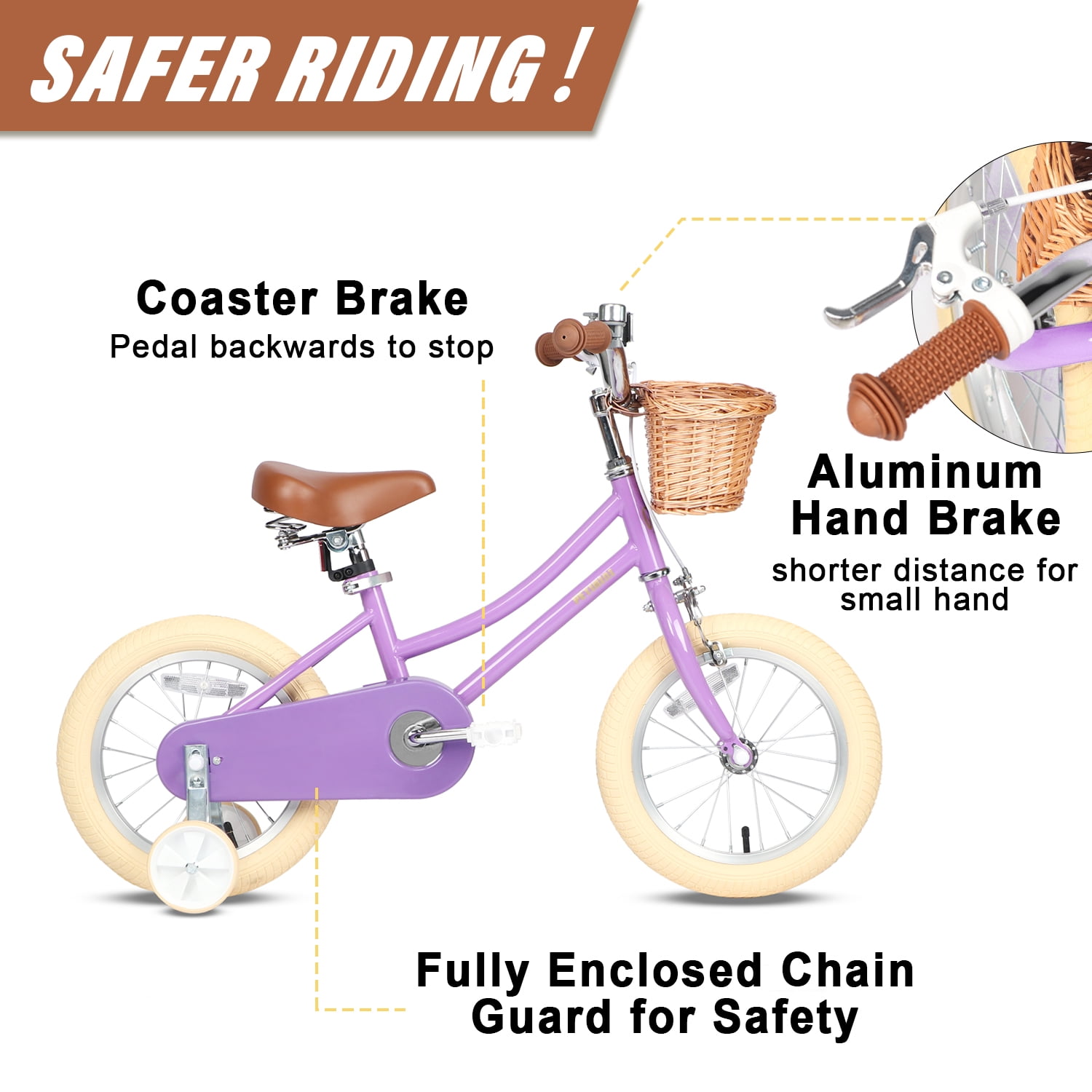 【DESIGNED FOR CHILDREN】- Short-reach brake levers, lower stand-over height, protective stem pad and removable training wheels make it fun and safe for kids learning to ride a pedal bike. The height of Seat and handlebar can be adjusted, the bike will grow with your little one. 【SAFE & DURABLE】- Coaster brake makes it easy to learn. Enclosed chain guard prevents your little one touching the chain. Durable hi-ten steel construction provides long-lasting reliability, backed by a LIFETIME warranty on the frame. 【LOVELY COMPONMENT】 – Soft handlebar grips, reflectors and a bell are included. The extremely cute wicker basket to let the kids pack stuffed animals or snacks. 【EASY TO INSTALL】- The bike is 85% assembled and comes with the basic assembly tools and only a few parts need to be added to the bike, which takes approximately 20 minutes. 【PLEASE CHECK THE SIZE】- The 12” bike is designed for children 1 – 4 years old or 32 – 38 inches tall. The 14” bike is designed for children 3 – 5 years old or 35 – 43 inches tall. The 16” bike is for children 4 – 8 years old or 40 – 51 inches tall. The 18” bike is for children 5 – 9 years old or 45 – 56 inches tall. The 20” bike is for children 6 – 12 years old or 50 – 62 inches tall.