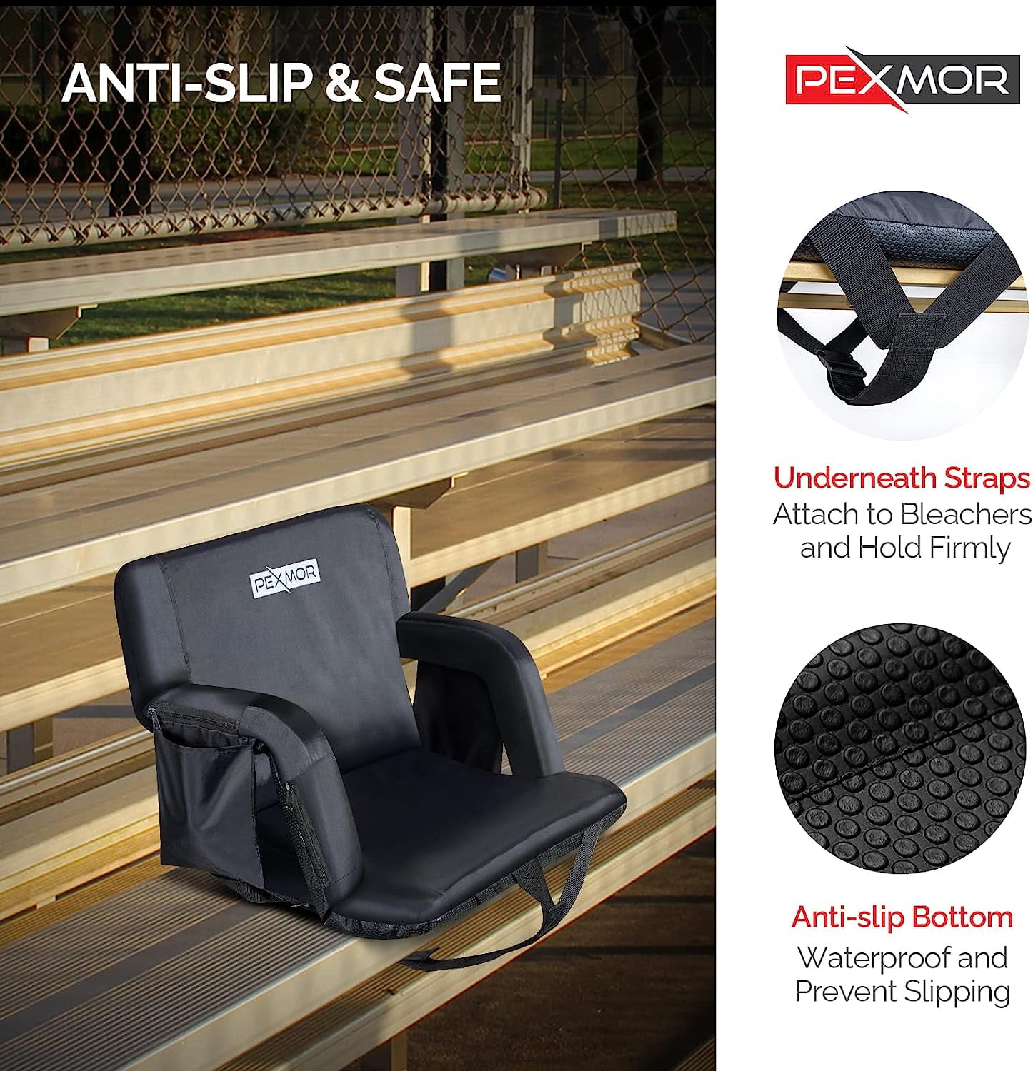 Heated Pad works for Winter while suitable for Summer if no power bank connected. Ideal for beach or park. Ours seat is REAL Extra Wide, whose width is 25 inch. Compared with others’ standard 21 inch, ours are more spacious and comfortable. This Stadium Seat weighs 9.9 pounds each and can support up to 330 pounds. Not only suitable for bleachers, but also ensure you have the best seat in the house no matter where the party takes you. There’s seat strap which could be fixed under the bottom of the bleacher to hold you in place. (Bottom is designed to be anti-slip and waterproof. The seating will be dry and safe.) The chair sets up in a matter of seconds and also has a pocket on the right side to hold your key/phone/drinks/snacks. The bleacher alone was hard and had no back support. Howevere, once you’re shifted into the Stadium Seat you’ll have a softer surface to sit on and some nice back support. Attention: The seat needs to be unfolding when being transported in carrying bag. Please carefully see the dimension of portable bag which is almost as large as seat in unfolding status.
