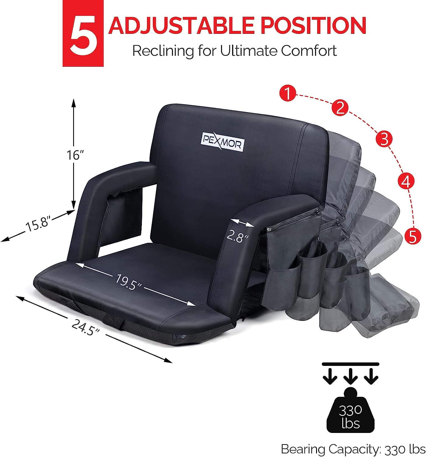 PEXMOR 2-PACK 25” Heated Stadium Seat for Bleachers with Back Support & Carrying Bag, 3 Level Heating Back & Bottom, 5 Reclining Chair w/Armrest Detachable Pocket, USB Battery Excluded