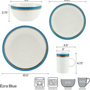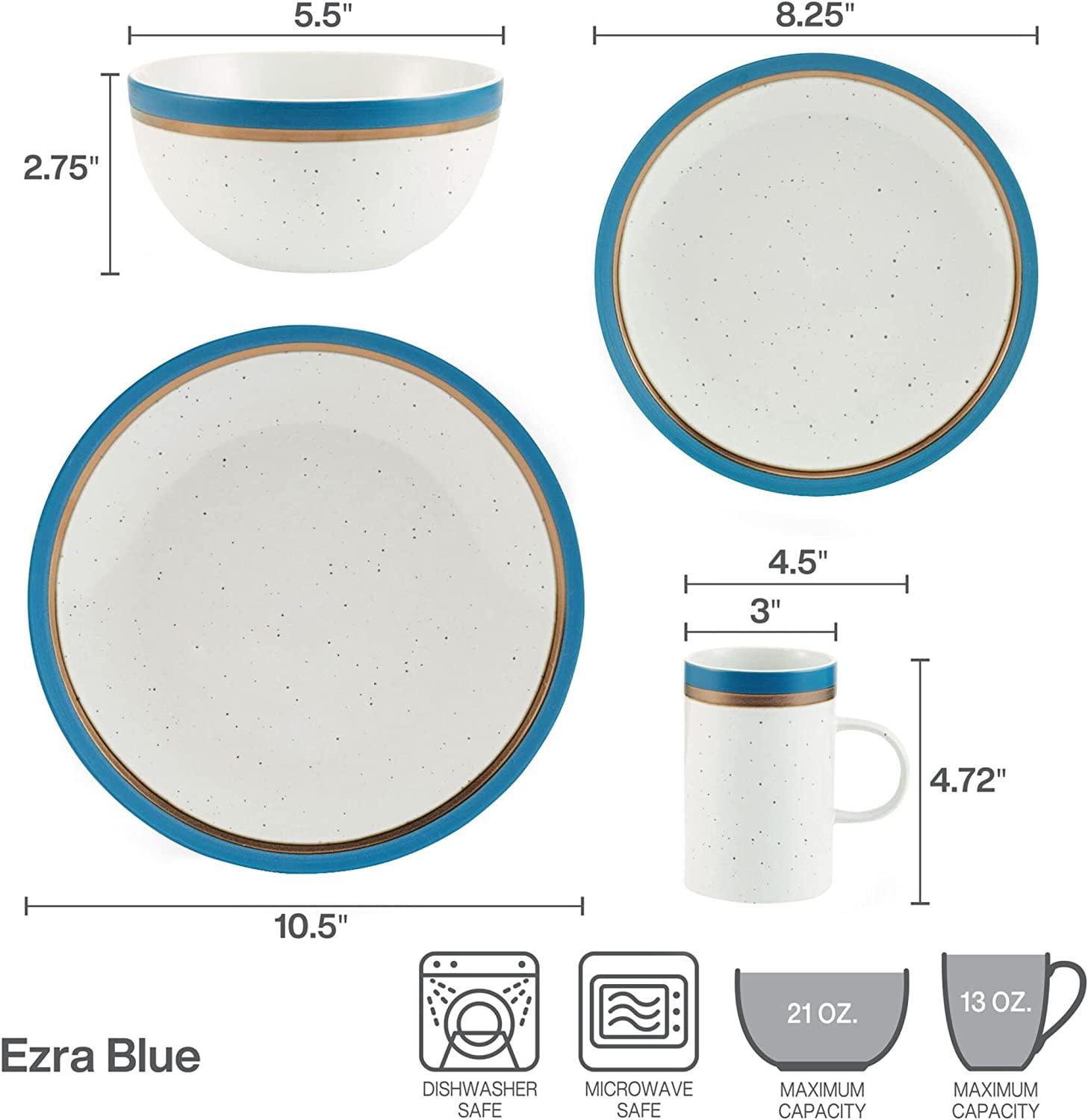 Bold and vibrant, this Pfaltzgraff 16-Piece Ezra Dinnerware Set brings modern allure to any dining occasion. Made of high-quality stoneware for strength and durability, these coupe-shaped pieces in deep, dark blue with metallic rims add a burst of color to your tabletop. 16-piece set, service for 4, includes 4 each of: 10-1/2 inch dinner plate, 8-1/4 inch salad plate, 21-fluid ounce cereal bowl measuring 5-1/2 inches tall with a 5-1/2 inch diameter, and 12-fluid ounce mug measuring 4-1/2 inches tall with a 3-inch diameter. Microwave and dishwasher safe.