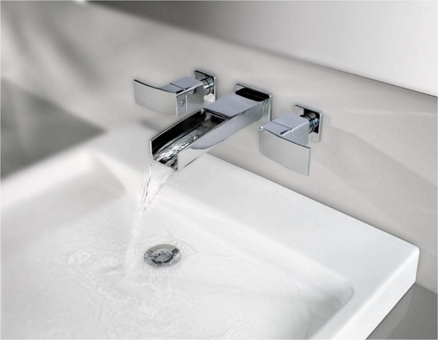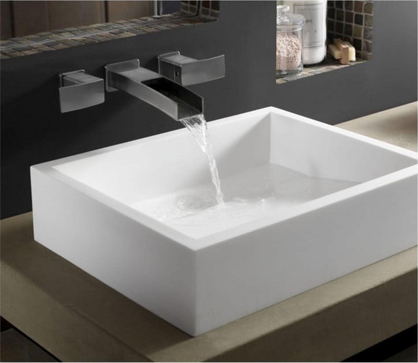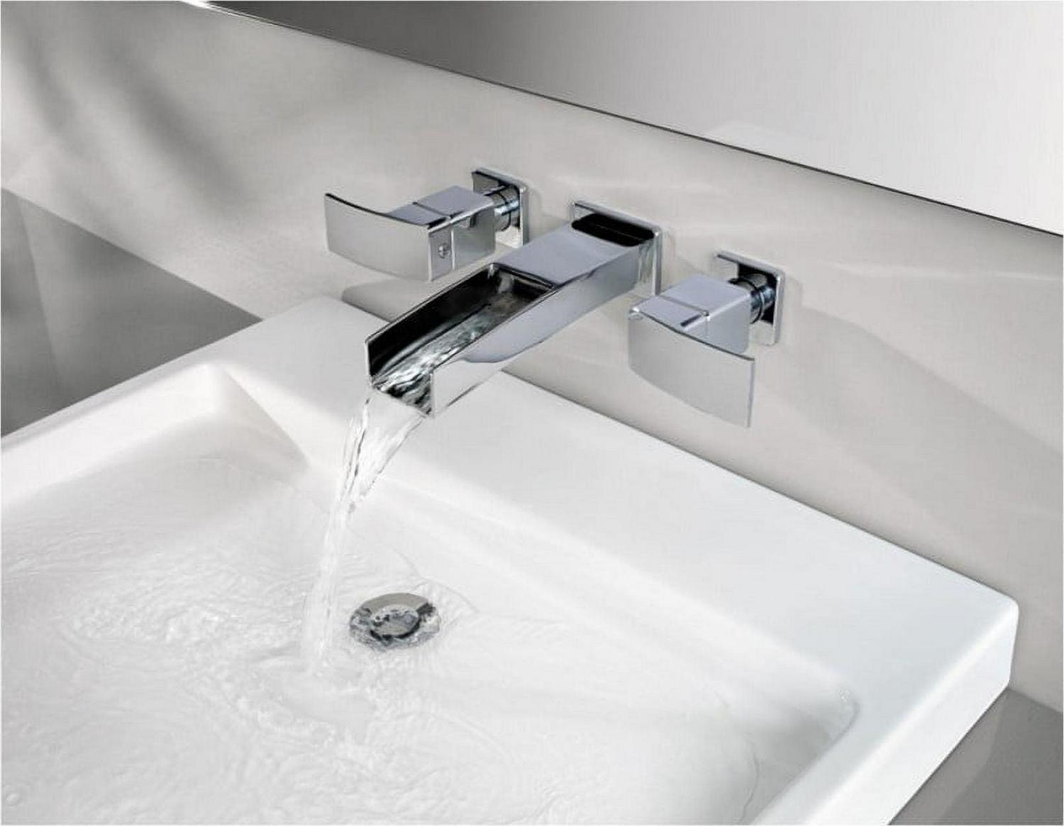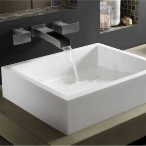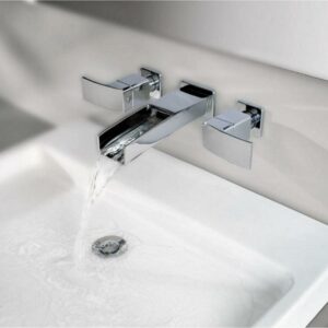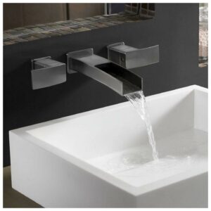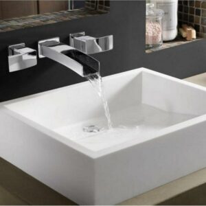 – Square modern bath faucet with wall mount installation and waterfall spout
