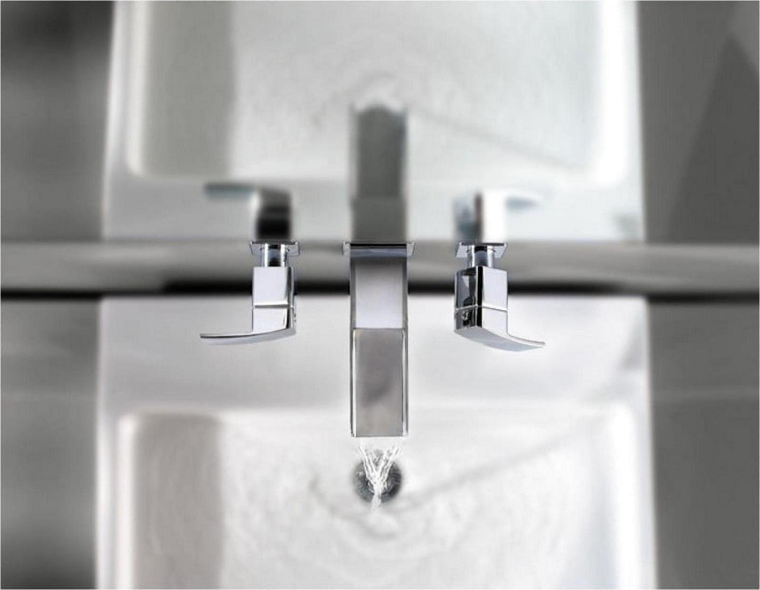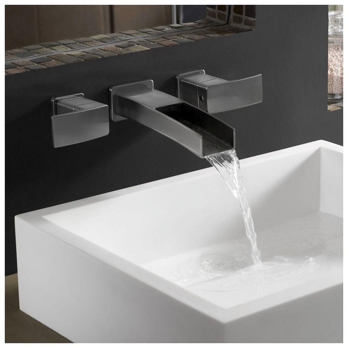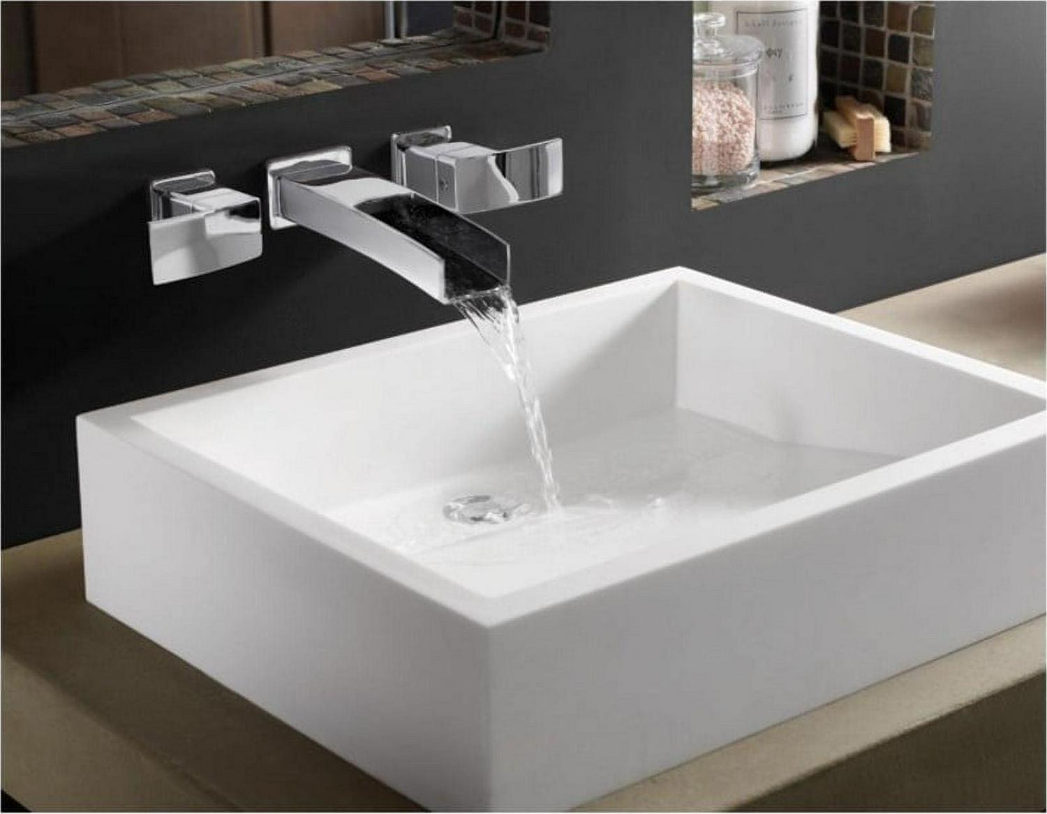 – Square modern bath faucet with wall mount installation and waterfall spout
