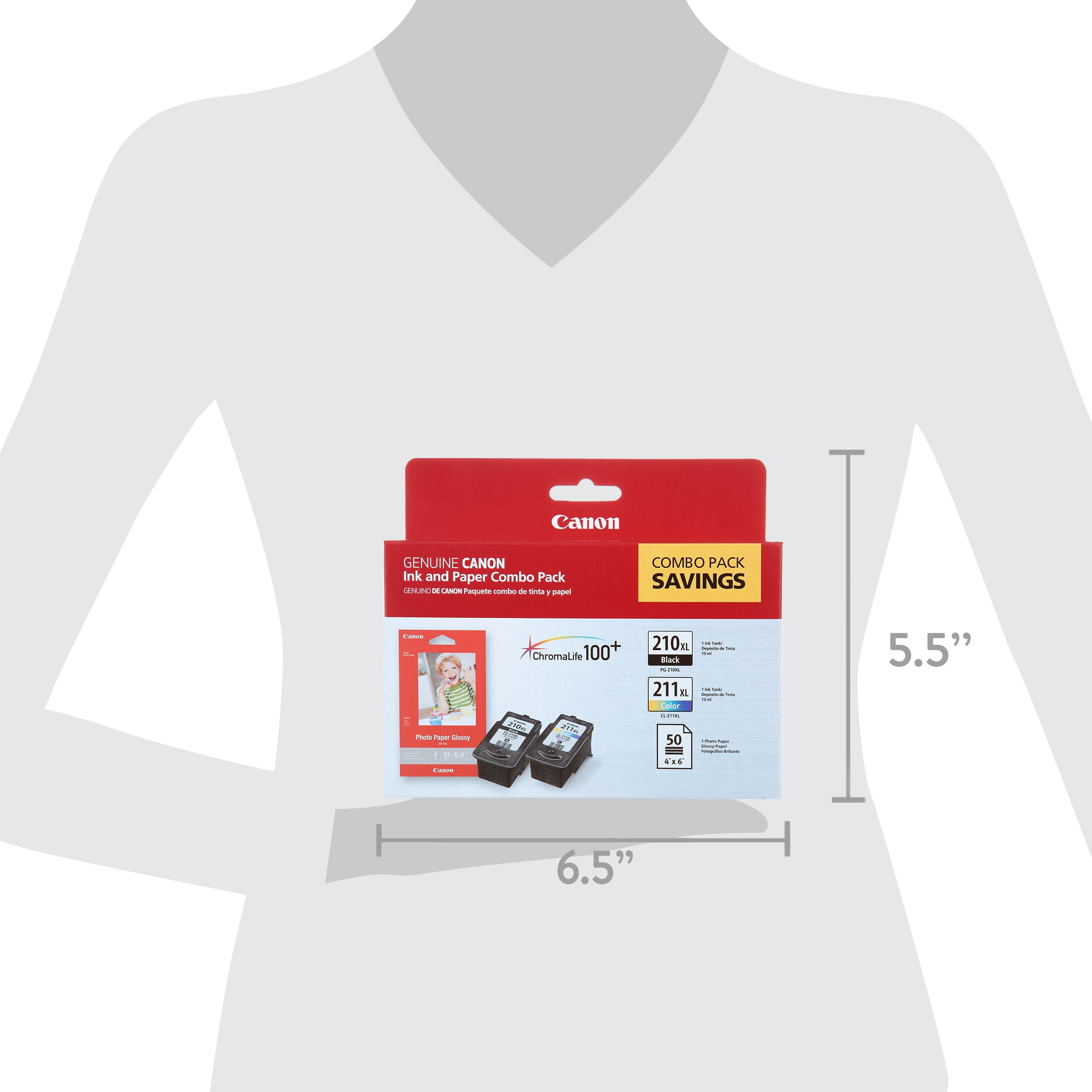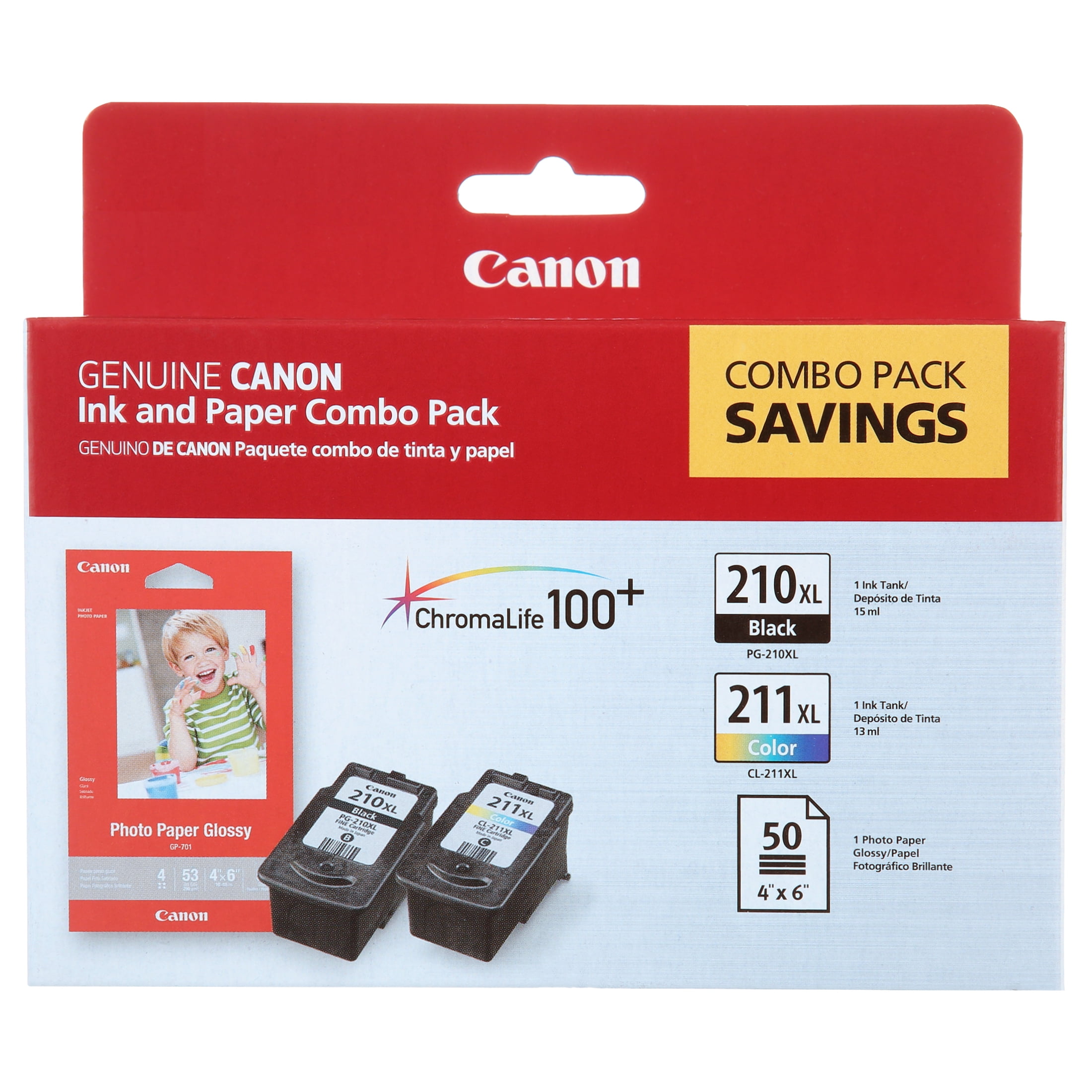 This special Extra-Large Canon combo pack is for the serious photo printer. Includes one PG-210 XL Pigment Black Ink Cartridge, one CL-211 XL Color Ink Cartridge and a 50 sheet pack of 4″ x 6″ genuine Canon Photo Paper Glossy photo paper. Genuine Canon XL ink cartridge means high capacity, which means more ink for more prints
