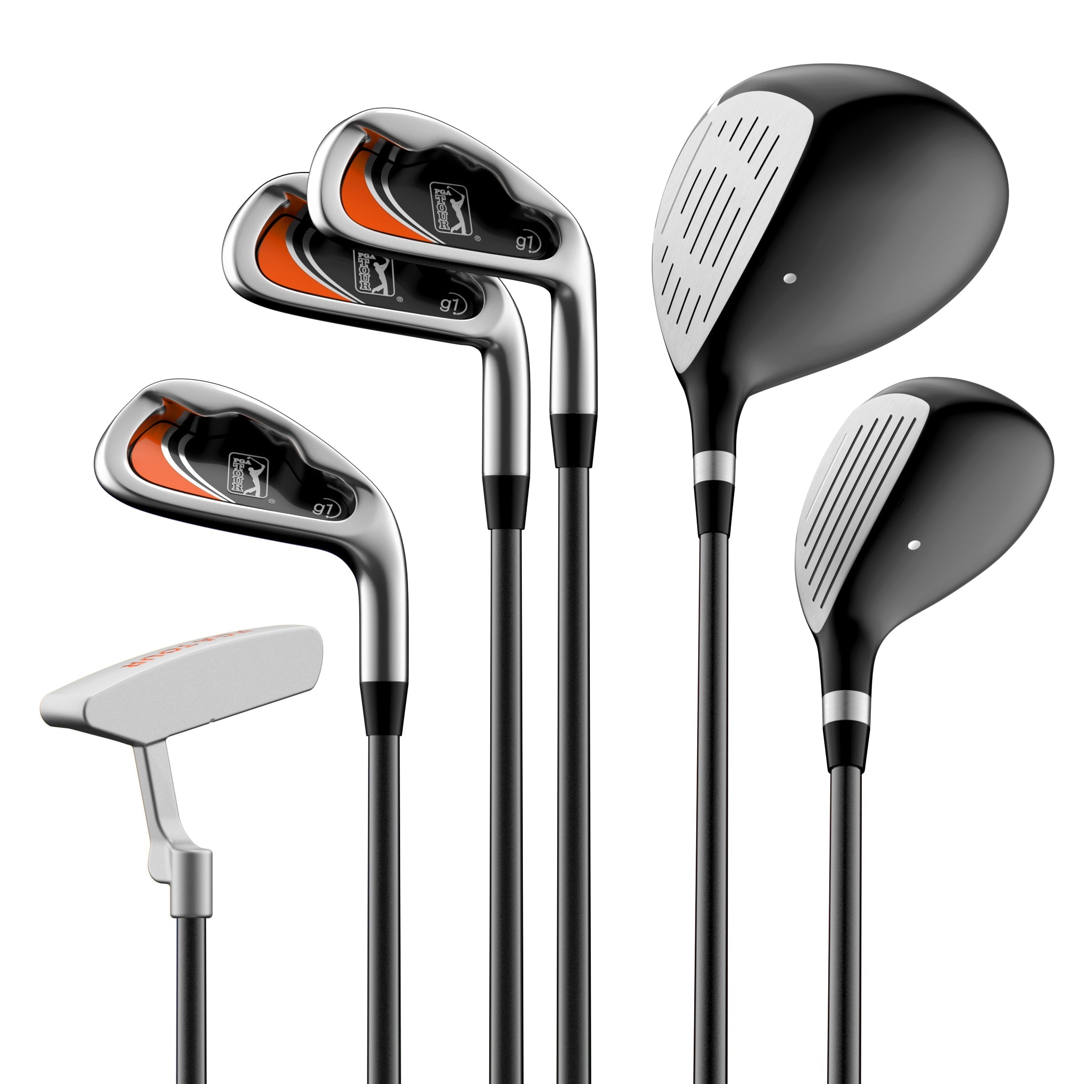 Includes a PGA Tour GS1 Driver, Driver Headcover, Hybrid, Hybrid Headcover, 5 Iron, 7 Iron, Sand Wedge, and Mallet Style Putter, Stand Bag with Adjustable Carry Straps, and Rain Cover Right Handed Dexterity Titanium Alloy and Fiberglass Shaft Large pockets available for additional storage Non-Slip Grip on all GS1 Clubs Unisex Perfect for your child golfer Additional Kids Golf Club Set Sizes Available