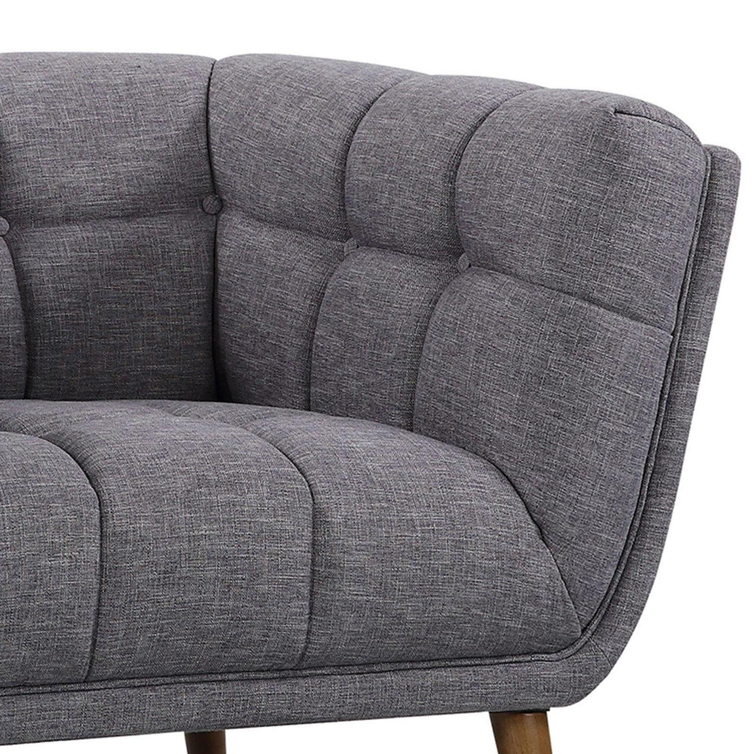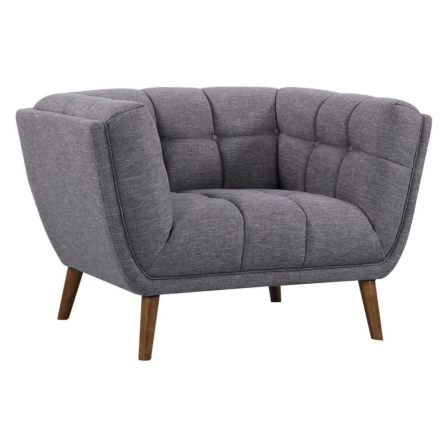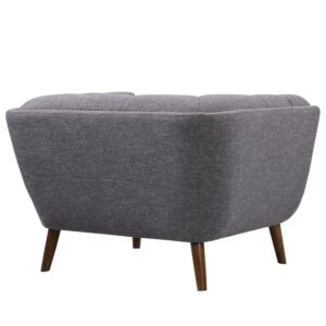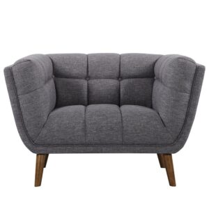Beautifully crafted with the perfect blend of chic style and luxurious comfort, the Armen Living Phantom Club Chair lends a mid-century modern aesthetic to your home’s décor. Sink into the wrap-around design of this cozy, fashionable chair that boasts an evenly balanced silhouette with the arms and back at the same height. Solidly constructed from a wooden frame, this dark gray cloth chair is button-tufted for the ultimate in plushness. Pair with other pieces in the Phantom collection for a complete look.
