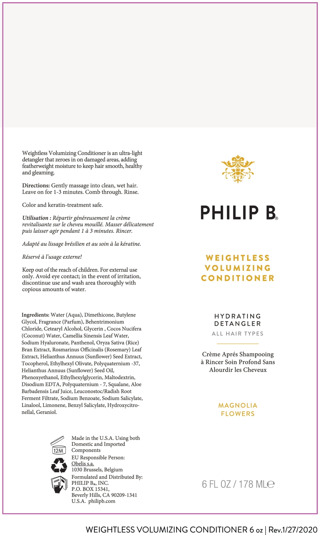 Philip B Weightless Volumizing Adult Conditioner, Magnolia Flower, 6 fl oz Active botanical agents (Rosemary, Sunflower, Aloe) provide hair with essential moisture for effortless styling Infused with Magnolia Flower for a happy, fresh scent A perfect daily conditioner for the whole family Zeroes in on damaged areas Keep hair fine and smooth