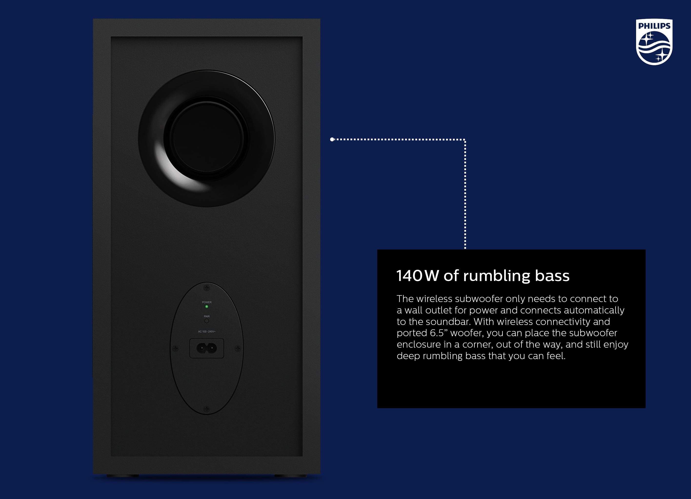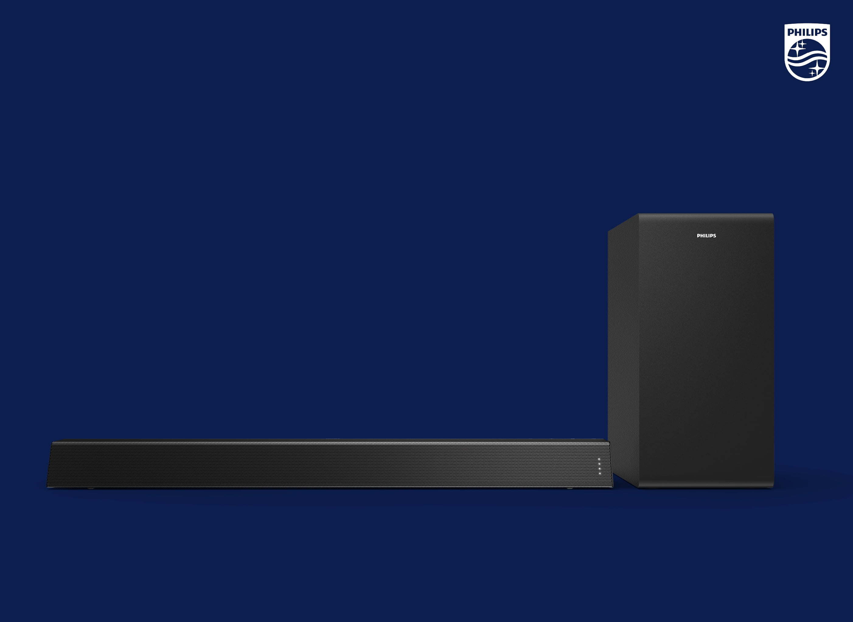 Enhance your audio experience, whether for your Philips TV or ANY TV. Thundering explosions. Crystal clear dialogue. This powerful 300W output soundbar with wireless subwoofer puts you in the thick of the action. With Dolby Audio, every movie you watch and every soundtrack you love will sound clearer, deeper, closer. It boasts a clean yet distinctive look and a low profile that’s designed to fit into any home setting. You can mount it on a wall with the included wall brackets, or slide it discreetly under the TV. And the setup is extremely simple. If you connect the soundbar to your TV via HDMI ARC, audio will be played from your soundbar, and you can control the volume of your favorite shows directly from your TV remote. No extra remote needed.