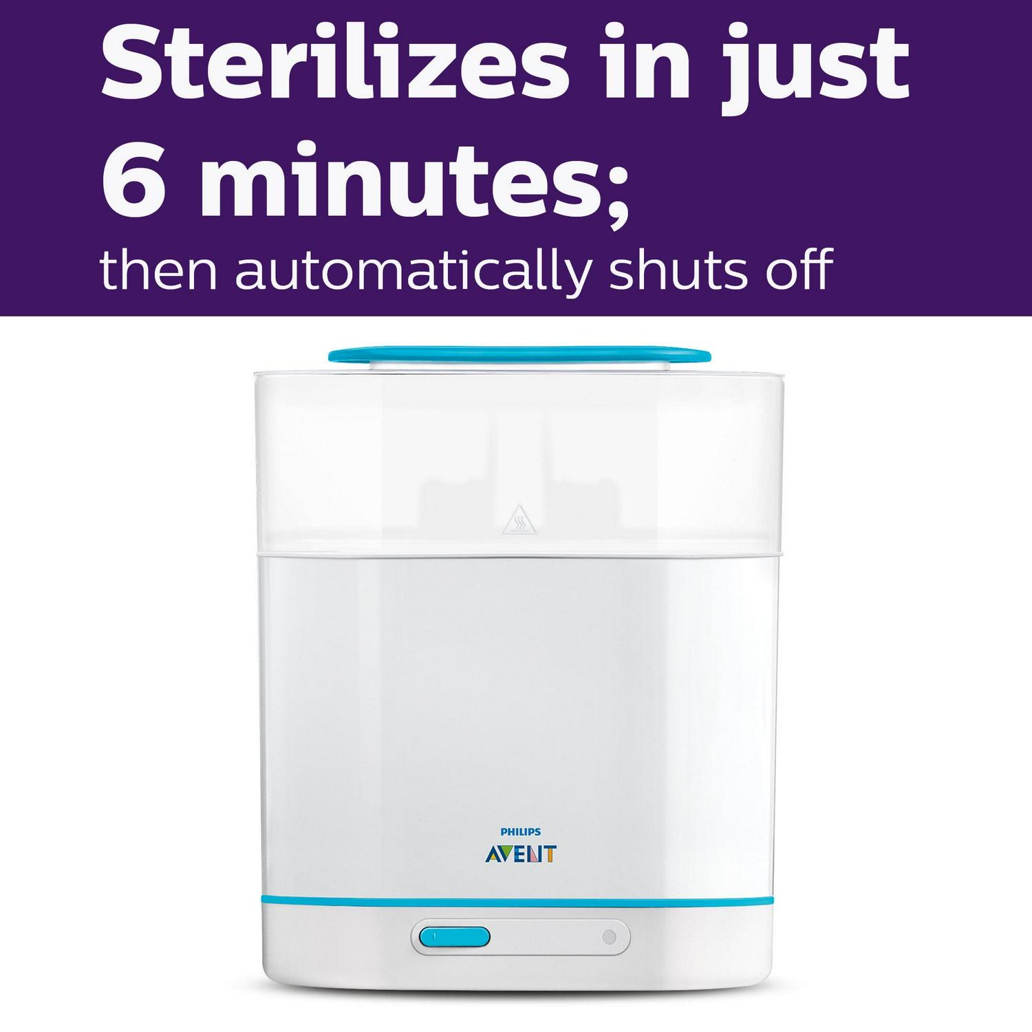 - Sterilizes in just 6 minutes; then automatically shuts off for energy savings and safety