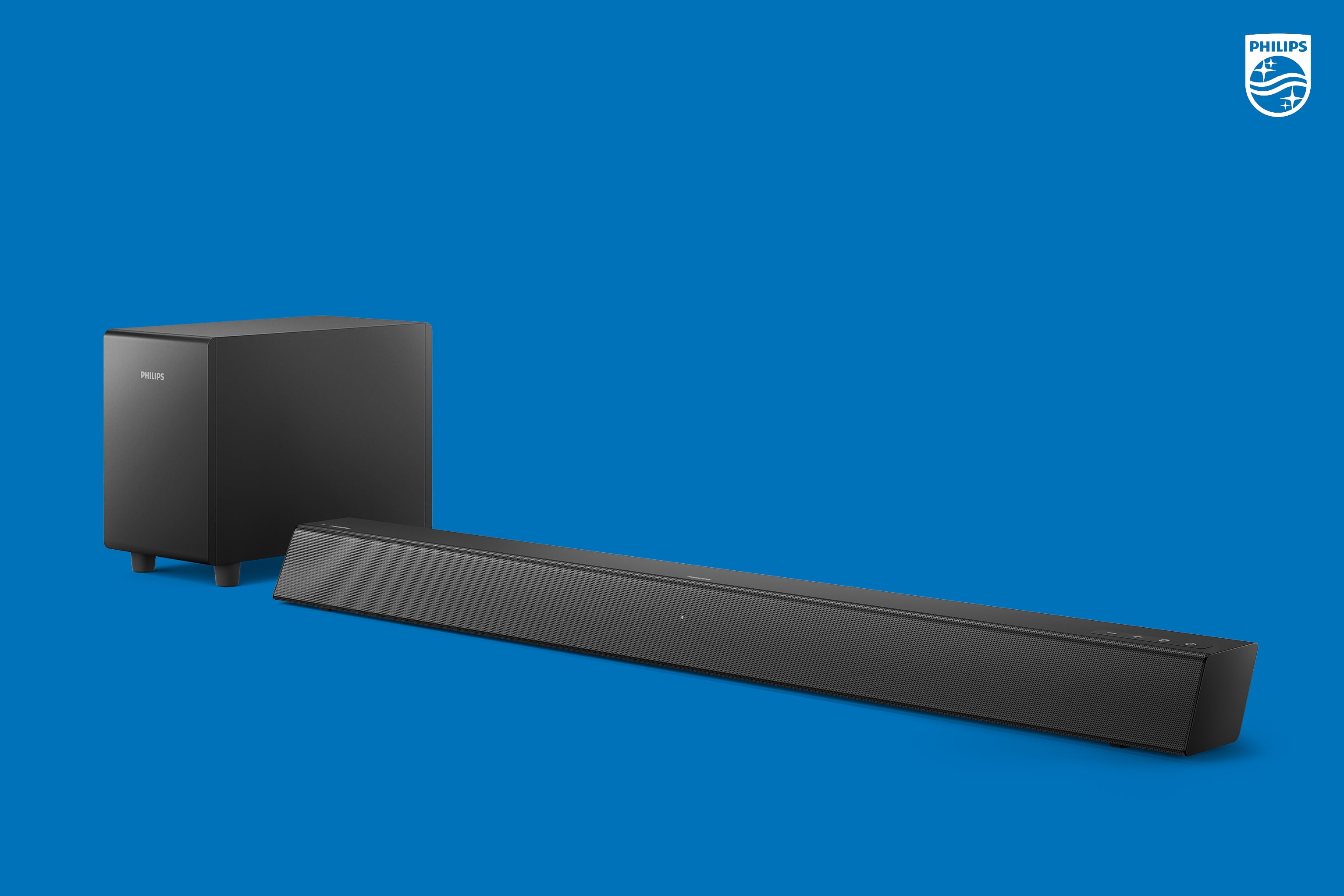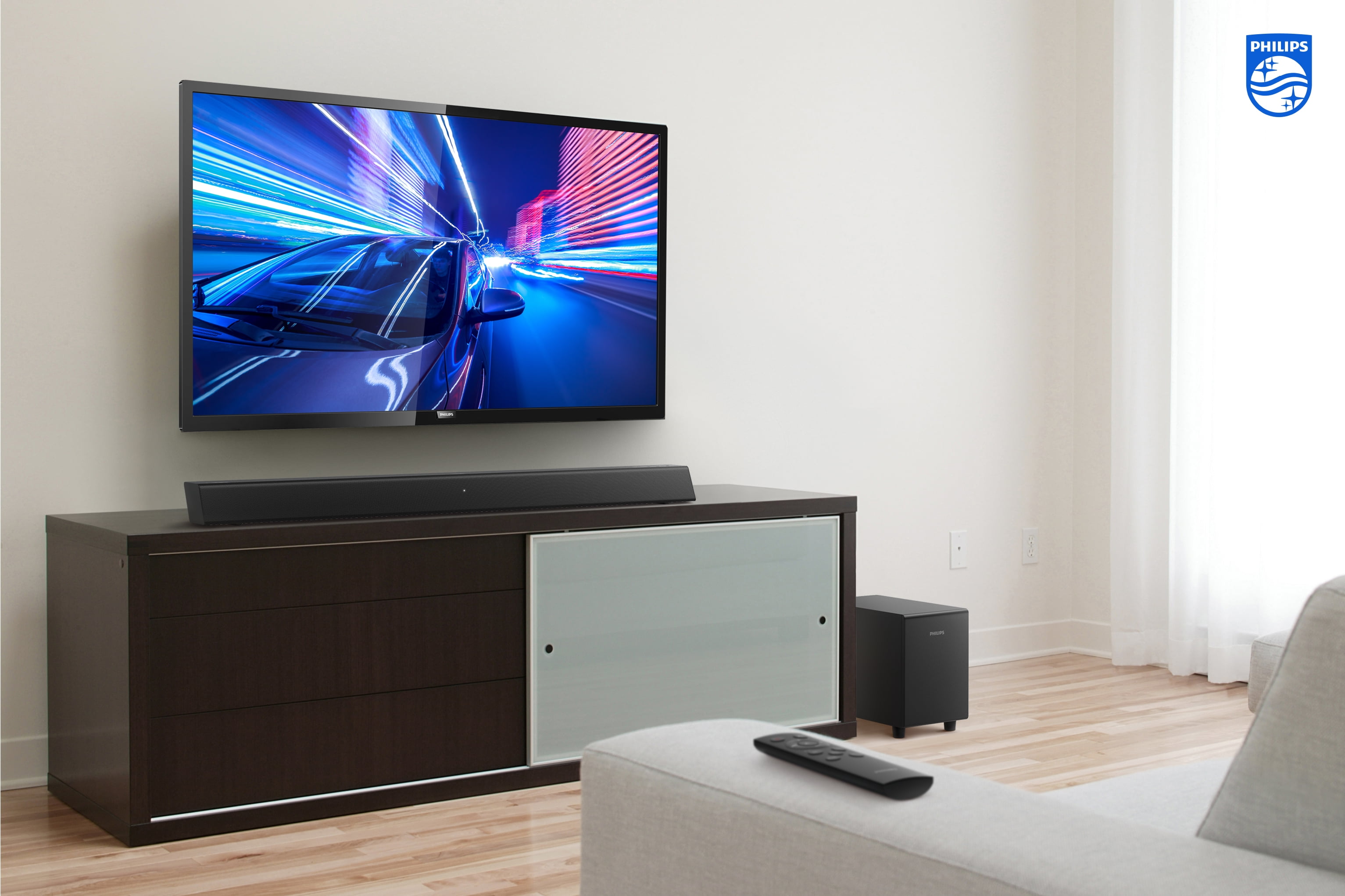 LEVEL UP YOUR TV SOUND: Experience the crackle of laser fire and the roar of the crowd. With 2.1 channels, enjoy new levels of sound for your favorite movies and shows. This powerful 140 W soundbar system makes everything louder, clearer, and deeper. The 40 W wireless subwoofer lets you truly feel the bass, whether you’re listening to music or watching an action-packed movie. SET UP YOUR SOUND MODE: Press EQ on the remote control to select music, movie, or news mode, optimizing the sound for whatever you’re watching. Whatever you love, it will sound louder and clearer through this soundbar. SIMPLE SETUP, EASY CONTROL: You’ll enjoy a simple setup, easy access to sound settings, and compatibility with any Roku TV™ remote. Say goodbye to hunting for multiple remotes—this soundbar connects to your TV via HDMI ARC (the updated version), allowing you to control the soundbar with the same remote you use for your TV. MULTIPLE CONNECT SOURCES: Easily pair the soundbar via Bluetooth with your smartphone or tablet, connect a wired music source via aux-in, or enjoy a home theater experience with your TV or video device through optical input or HDMI ARC. GEOMETRIC DESIGN: Crafted from durable metal grille, this soundbar features a unique slanted design and a low profile. The sleek design of the powerful subwoofer makes it easy to hide. For placement, the included wall brackets offer versatile options. You can place it on your TV stand, mount it on the wall, or set it on any flat surface. What’s in the box: 1. PHILIPS sound bar speaker 2. Other accessories: Remote control (with battery) , Power cord, Wall mount bracket, Quick start guide and Worldwide warranty leaflet