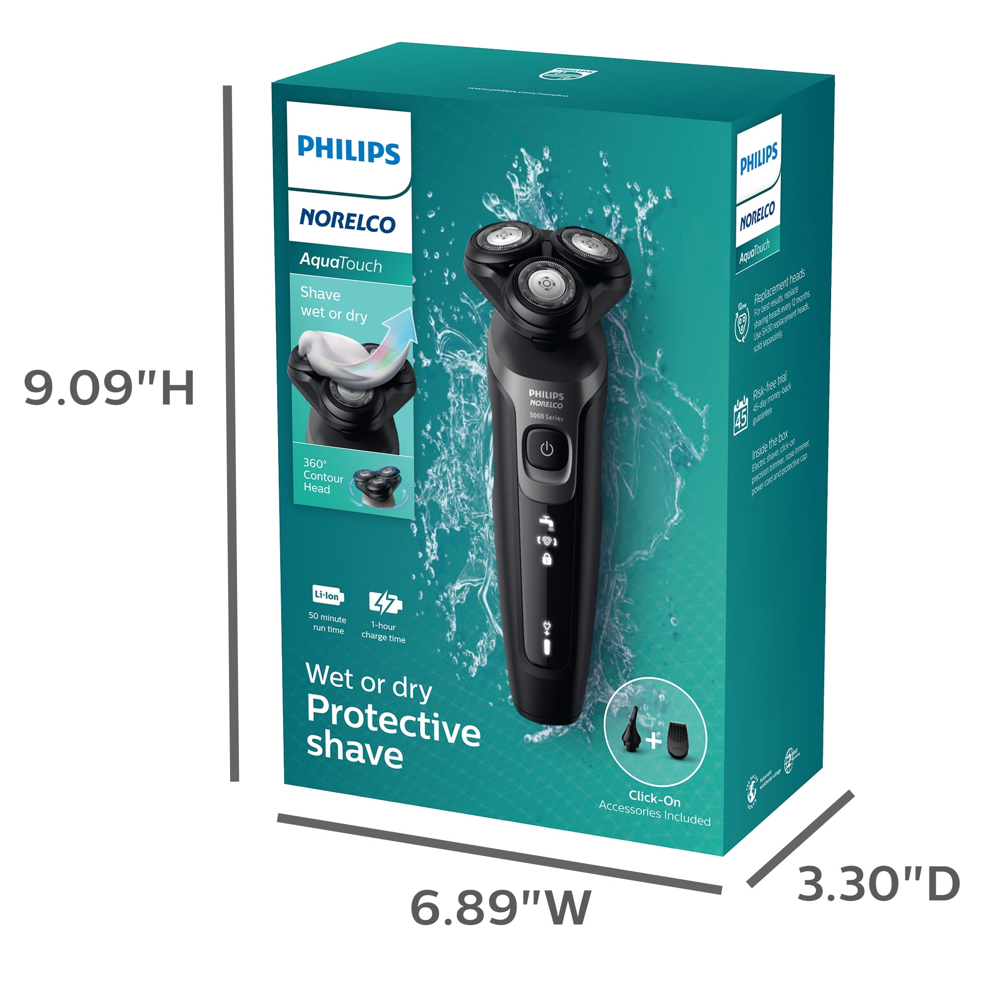 The Philips Norelco AquaTouch shaver protects your skin while you enjoy a refreshing shave. ComfortCut blades deliver a clean, comfortable shave. Rounded blade caps shield 27 self-sharpening blades to gently cut hair just above skin level. Get a convenient dry shave or a more refreshing wet shave with gel or foam – even in the shower. All your trimming essentials in one kit : Click-on the skin-friendly precision trimmer to finish your look – ideal for maintaining your mustache and trimming your sideburns. Plus click-on nose trimmer to get tidy unwanted hair. You’ll have up to 50 minutes of run time – that’s about 14 shaves – on a 1 hour charge. This shaver operates in cordless mode only.