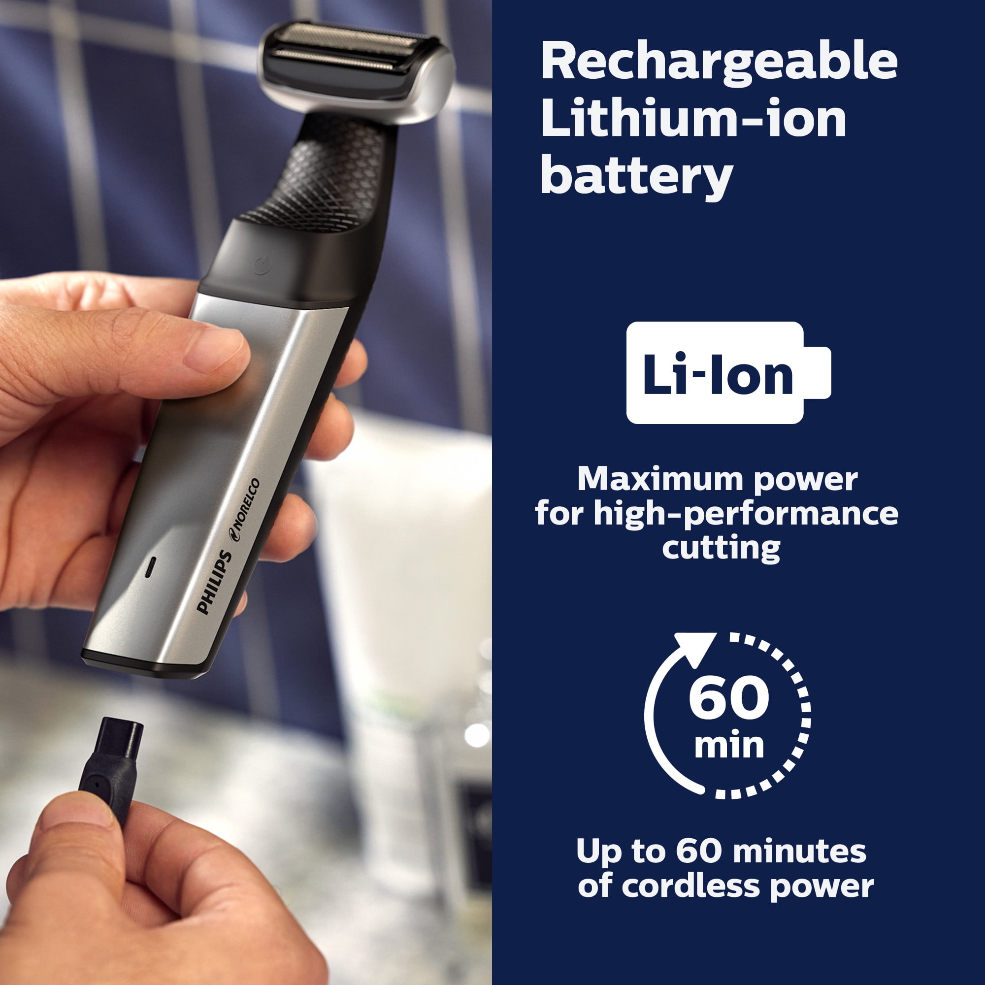 Shave or trim any area on your body, including hard to reach areas like your back, shoulders, chest, abs, underarms, arms, groin area and legs using the extra long attachment. Blades designed to be comfortable and efficient. Rounded tips make smooth contact with your skin and allows you to shave or trim in any direction which takes care of long and short hairs. Showerproof design with ergonomic rubber grip for better control when wet. Easy to clean and maintain by running the detachable blade cartridge under water for a quick rinse. Powered by Lithium-ion battery technology that allows for up to 1 hour of run time on only a 1 hour charge.
