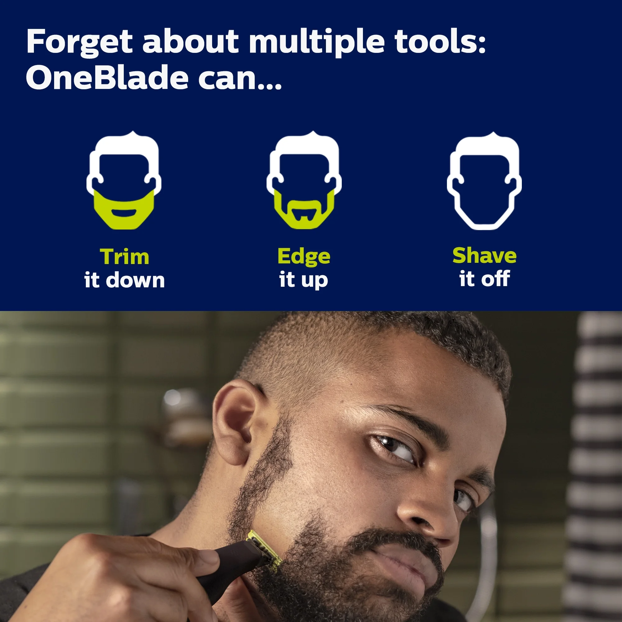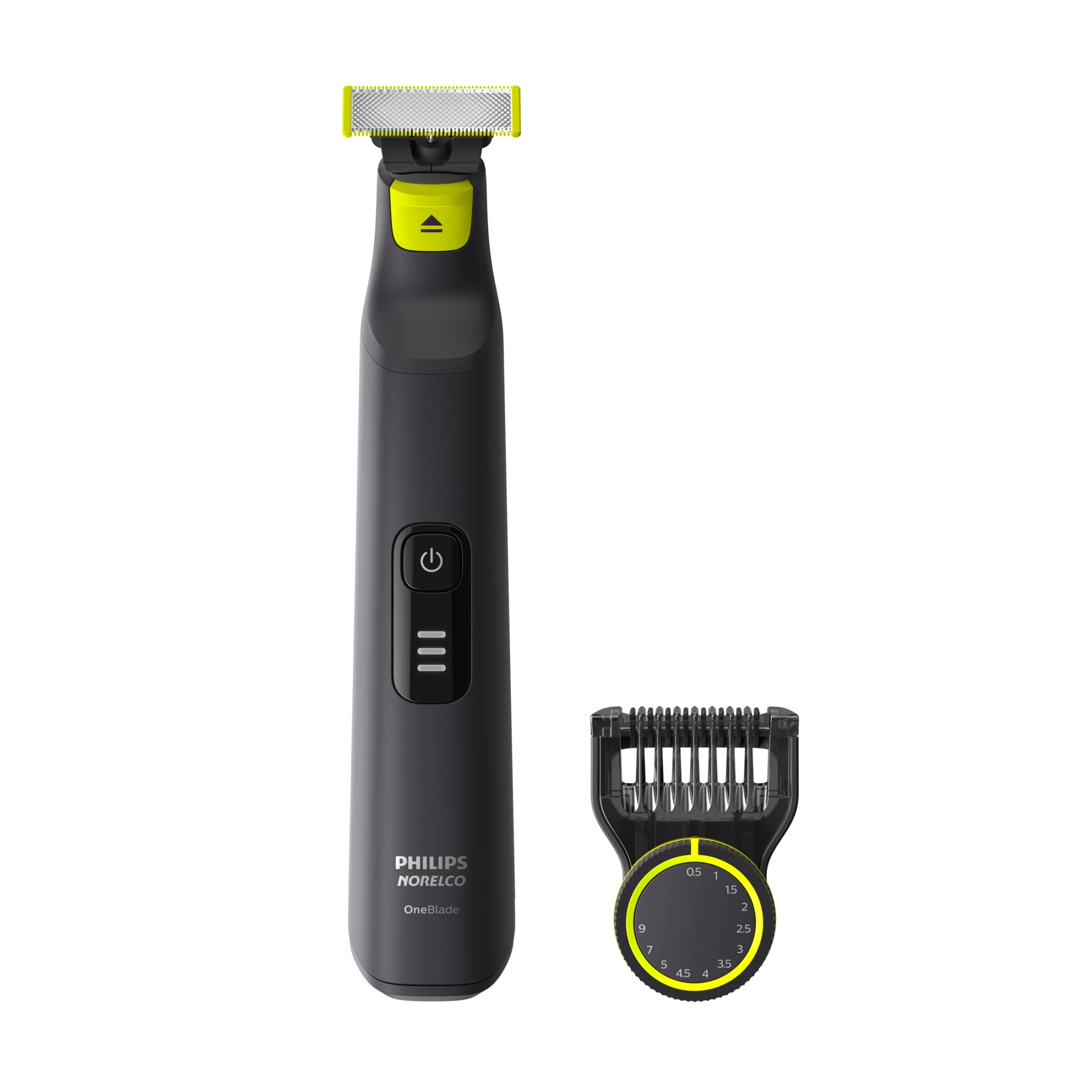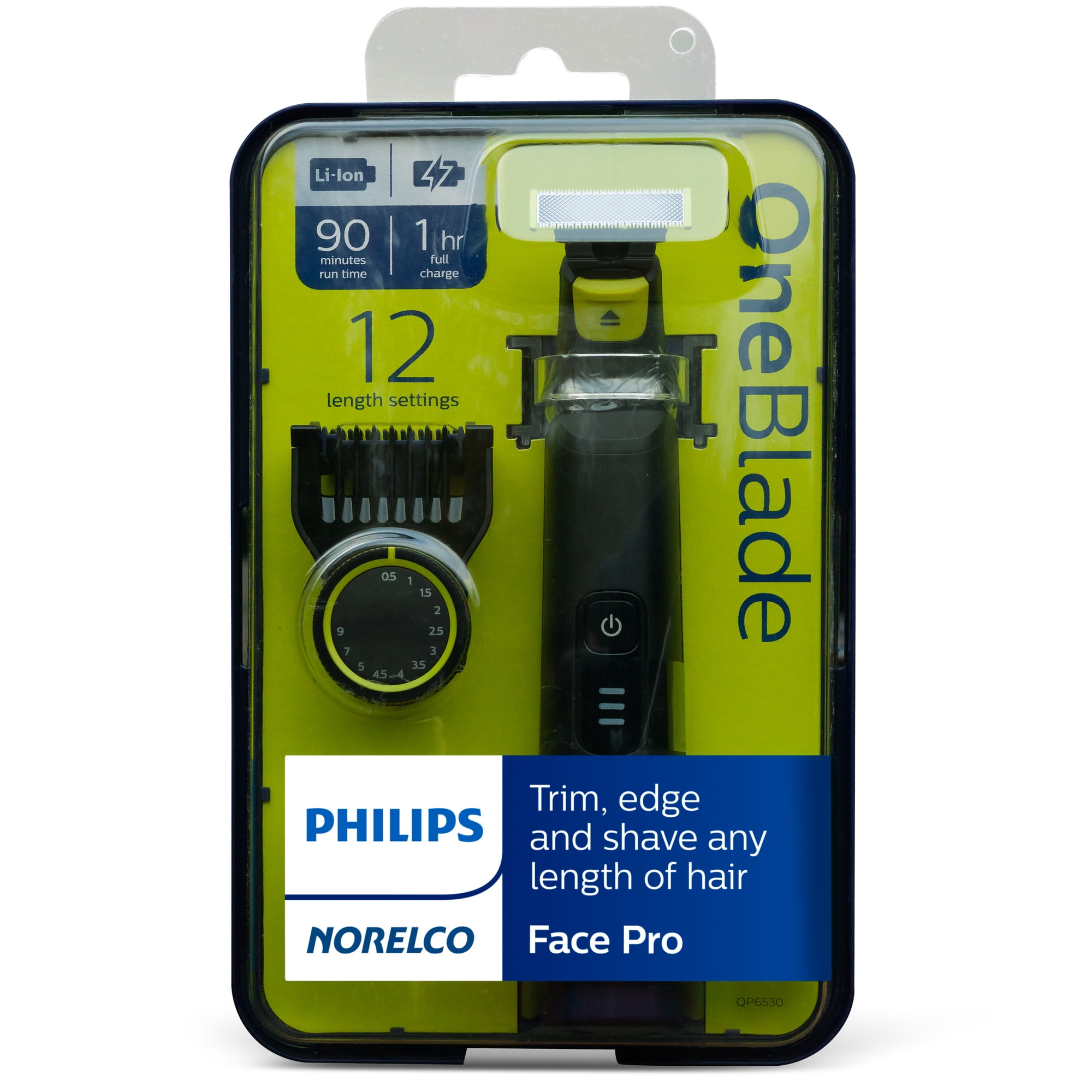 Trim, edge and shave any length of hair. Designed to cut hair, not skin. Philips Norelco OneBlade Pro is a revolutionary hybrid styler that can trim, shave and create clean lines and edges, on any length of hair. Forget about using multiple steps and tools. OneBlade does it all. Philips Norelco OneBlade has a revolutionary technology designed for facial styling and body grooming. It can trim, edge and shave any length of hair. Its dual protection system – a glide coating combined with rounded tips – makes shaving easier and comfortable. Its shaving technology features a fast-moving cutter (200x per second) so it’s efficient – even on longer hairs. The versatile 12-length precision trimming comb offers length settings from 0.5 to 9 mm, giving you an even trim at exactly the length you want. OneBlade is water resistant, so it is easy to clean: just rinse it under the tap. You can shave wet or dry, with or without foam – whichever you prefer. Rechargeable Li-Ion battery delivers 90 minutes of constant styling power after a 1 hour charge. The blades are designed for lasting performance. For optimal performance, you will only need to replace each blade every 4 months (For best shaving experience. Based on 2 full shaves per week. Actual results may vary.).* Replacement is easy and hassle free. 1 blade, 1 handle with LED display, 1 12-length comb, power cord and protective cap