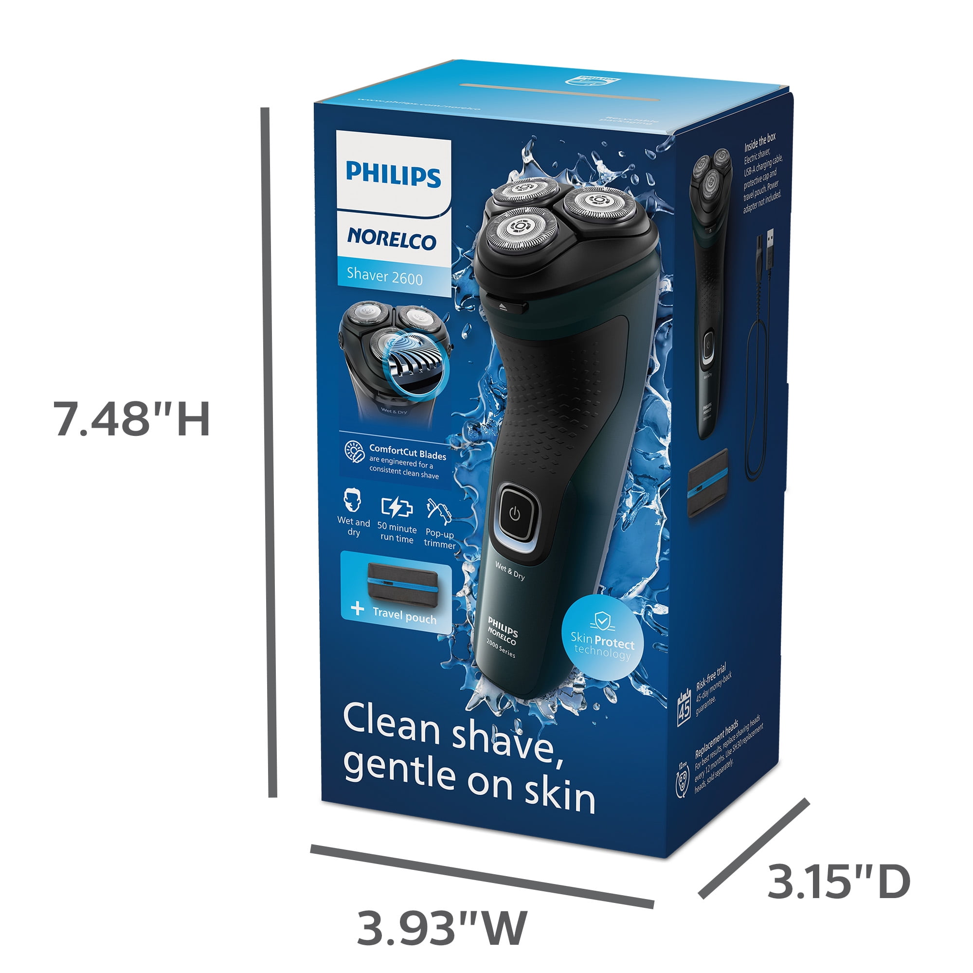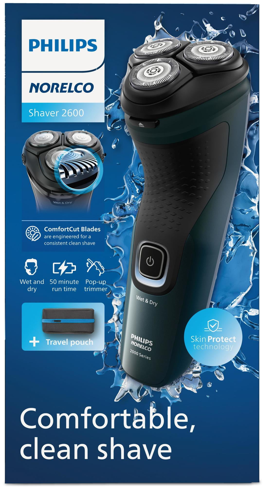 Experience a comfortable, clean shave every day with 27 self-sharpening ComfortCut blades and SkinProtect Technology. Includes a convenient travel pouch. Electric shaver, storage pouch, power cord (wall adapter not included) and protective cap
