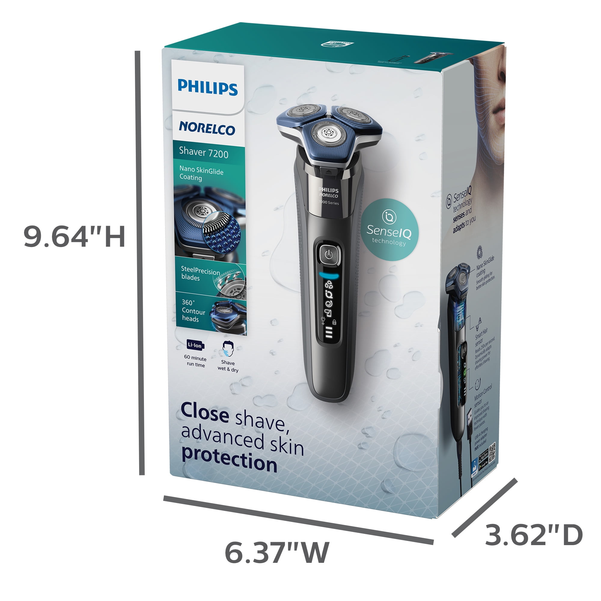 The Philips Norelco Shaver 7200 glides smoothly over your skin, while cutting each hair close – even on 3-day beards. Equipped with SenseIQ technology, the shaver senses, adapts and guides on the correct motion, for better skin protection. Electric shaver, protective cap, cleaning brush, and USB-A charging cable (wall power adapter not included)