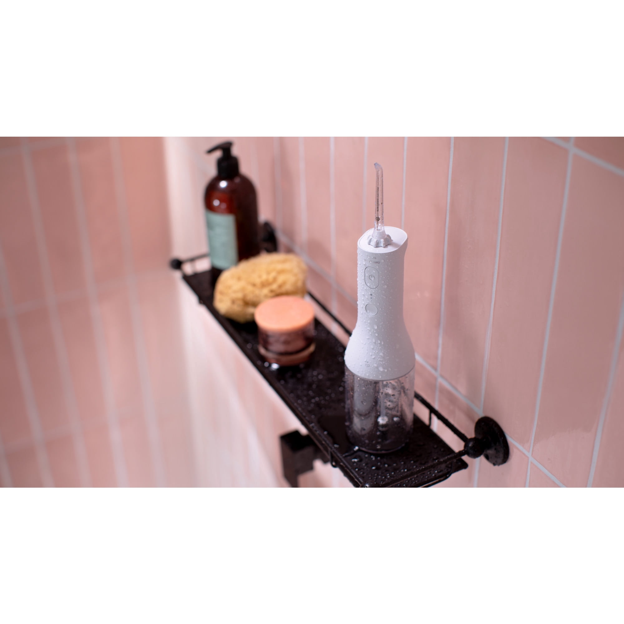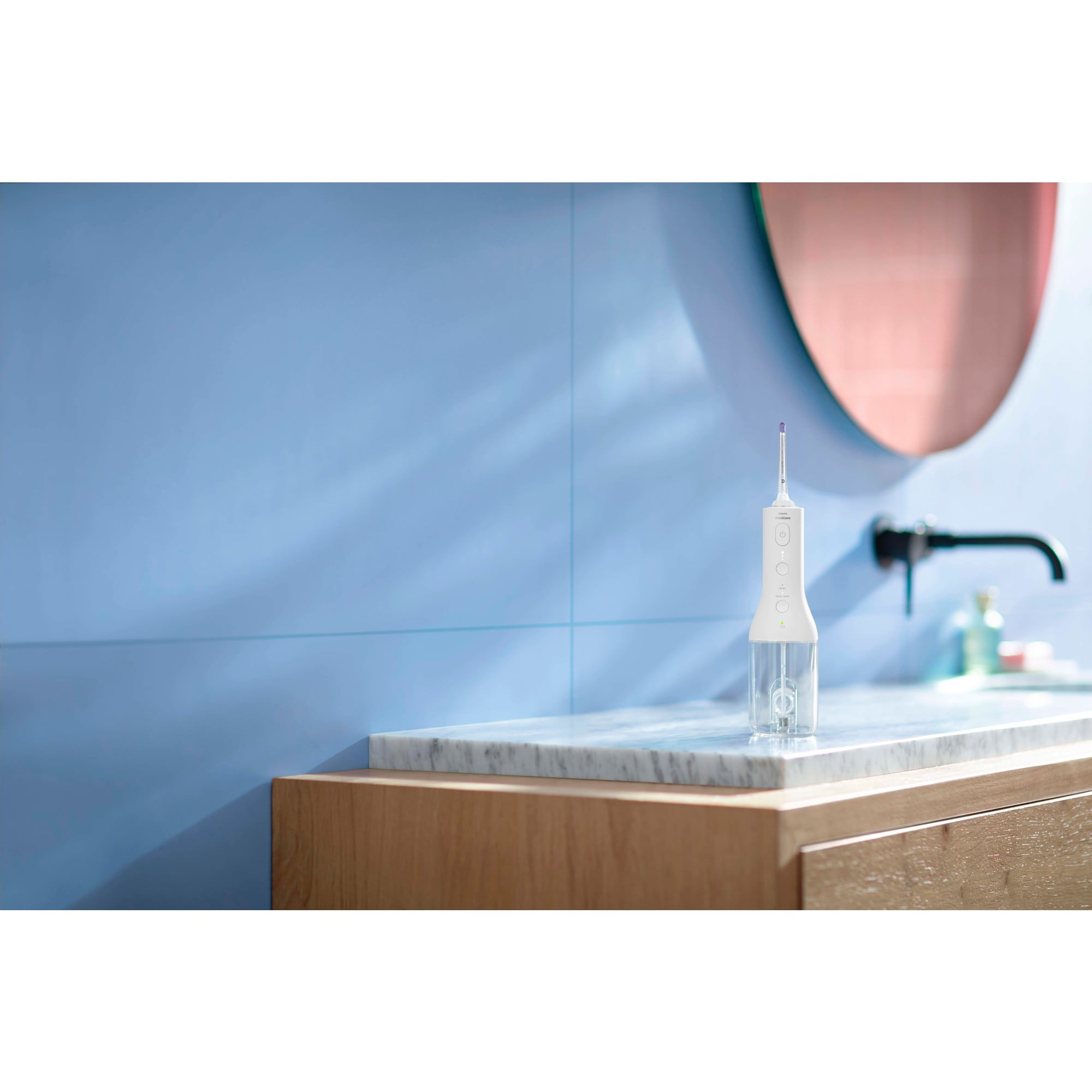 Achieve optimal dental hygiene and oral care with the Philips Sonicare Cordless Power Flosser 3000. This advanced water flosser is designed to deliver a deep clean that’s perfect for spot cleaning by being up to 150% more effective than floss in improving gum health.¹ Enjoy effective water flossing every day: the innovative Quad Stream technology generates four wide streams of water that penetrate deep between teeth and along the gums, covering up to 9x the surface area of single stream flossers⁴ and enhancing oral hygiene. With a slim cordless design and a 14-day battery life, it ensures convenience and flexibility for your oral care routine, allowing use both at home and for travel. Access hard-to-reach areas with a nozzle that rotates 360 degrees, so that you can use the device in any orientation and reach any corner of your mouth. Get a thorough 360 clean in just 60 seconds from start to finish. The whisper-quiet operation maintains a peaceful environment. This portable flosser fits comfortably in your hand, and its lightweight design makes it easy to maneuver. When you purchase this product, you receive one white Sonicare flosser, equipped with two flossing modes and three pressure settings to cater to your unique needs. The set includes two nozzles: a Quad Stream nozzle and a Standard single stream nozzle. ¹ Between teeth, after two weeks, in patients with moderate to severe gingivitis, when used with Quad Stream nozzle on high setting with a manual toothbrush vs. using manual toothbrush with string floss. ²In a lab study (actual results may vary) with Quad Stream nozzle (in clean mode, setting 3), in the deepest 2mm of a 6mm periodontal pocket model. ³ When used with Quad Stream nozzle on high setting with a manual toothbrush in patients with moderate to severe gingivitis. ⁴ vs. Waterpik 660, in a lab study, actual results may vary. ⁵ In an in-vitro study, results may vary. ⁶ based on 1 flossing session per day lasting 1 minute Comes with 1x cordless flosser, 1x standard nozzle, 1x Quad Stream nozzle, 1x USB-A charging cable, 1x wall adapter