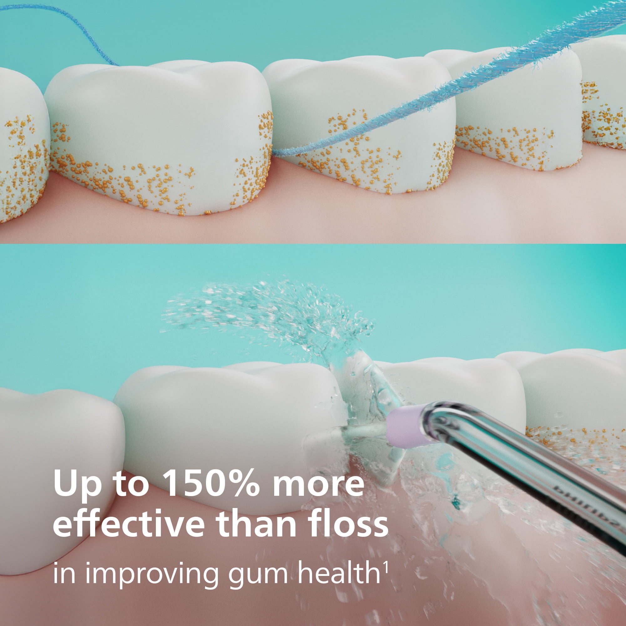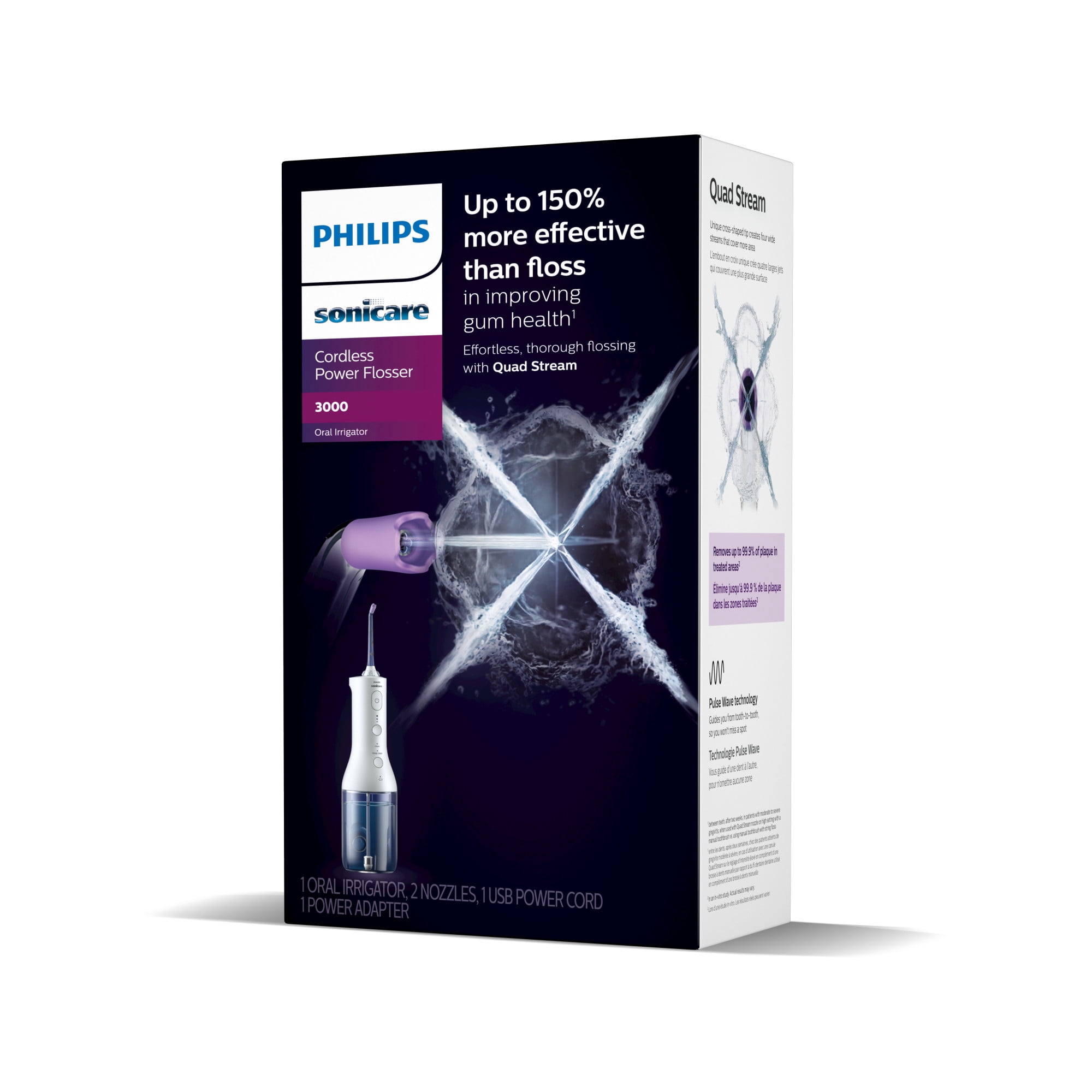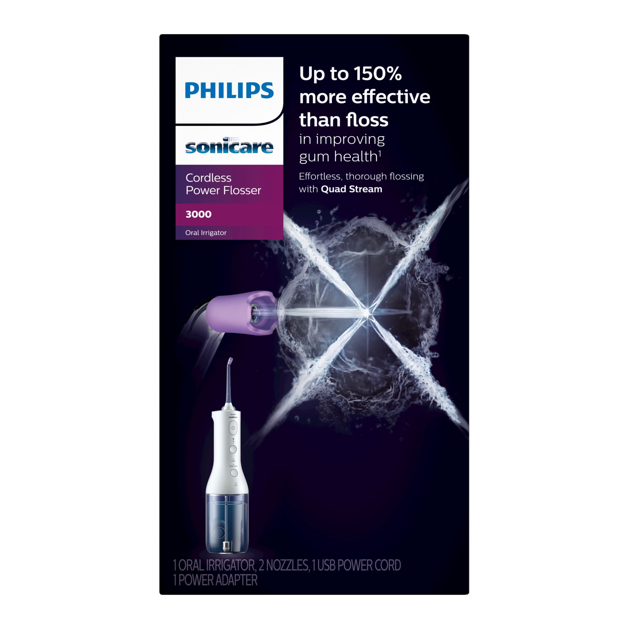Improve gum health in 2 weeks: Philips Sonicare cordless water flosser is up to 150% more effective than floss in improving gum health¹ ; it also removes up to 99% of plaque from below the gumline² Quad Stream technology delivers four wide streams of water that penetrate deep between teeth and along the gumline, covering 9x the surface area of single stream flossers⁴ Cordless convenience: this electric flosser is lightweight, portable, and easy to use; reservoir capacity of 8 fl oz holds enough water for a 1-minute clean without refilling Customized flossing: Clean mode uses constant water pressure, briefly pausing the flow every 15s so you can move the device, while Deep Clean with Pulse Wave technology guides you from tooth to tooth Nozzles rotate 360 degrees to access hard-to-reach areas: F1 Standard for a powerful clean between teeth and F3 Quad Stream that separates flow into 4 jets to cover more area for a thorough clean Floss for up to 14 days on just one charge: convenient charging with the included USB-A cable and wall adapter The set includes: 1x cordless water flosser, 1x standard nozzle, 1x Quad Stream nozzle, 1x USB-A charging cable, 1x wall adapter