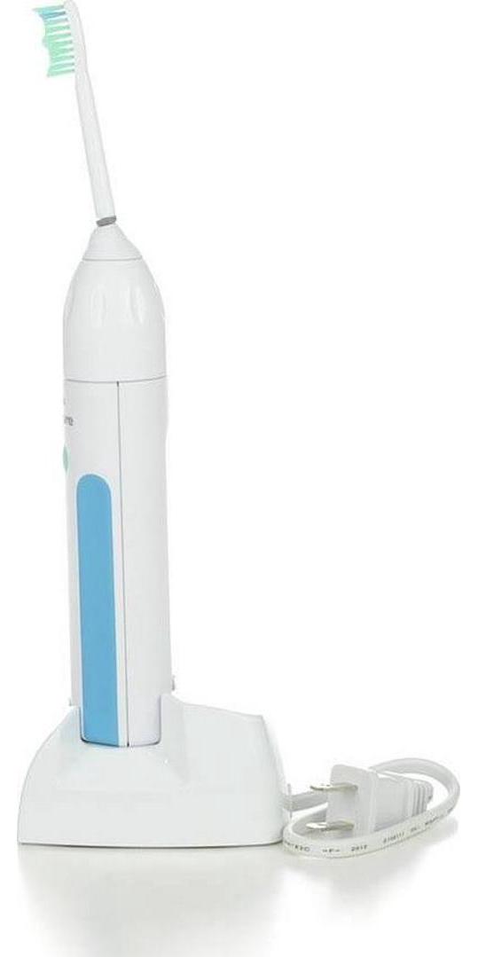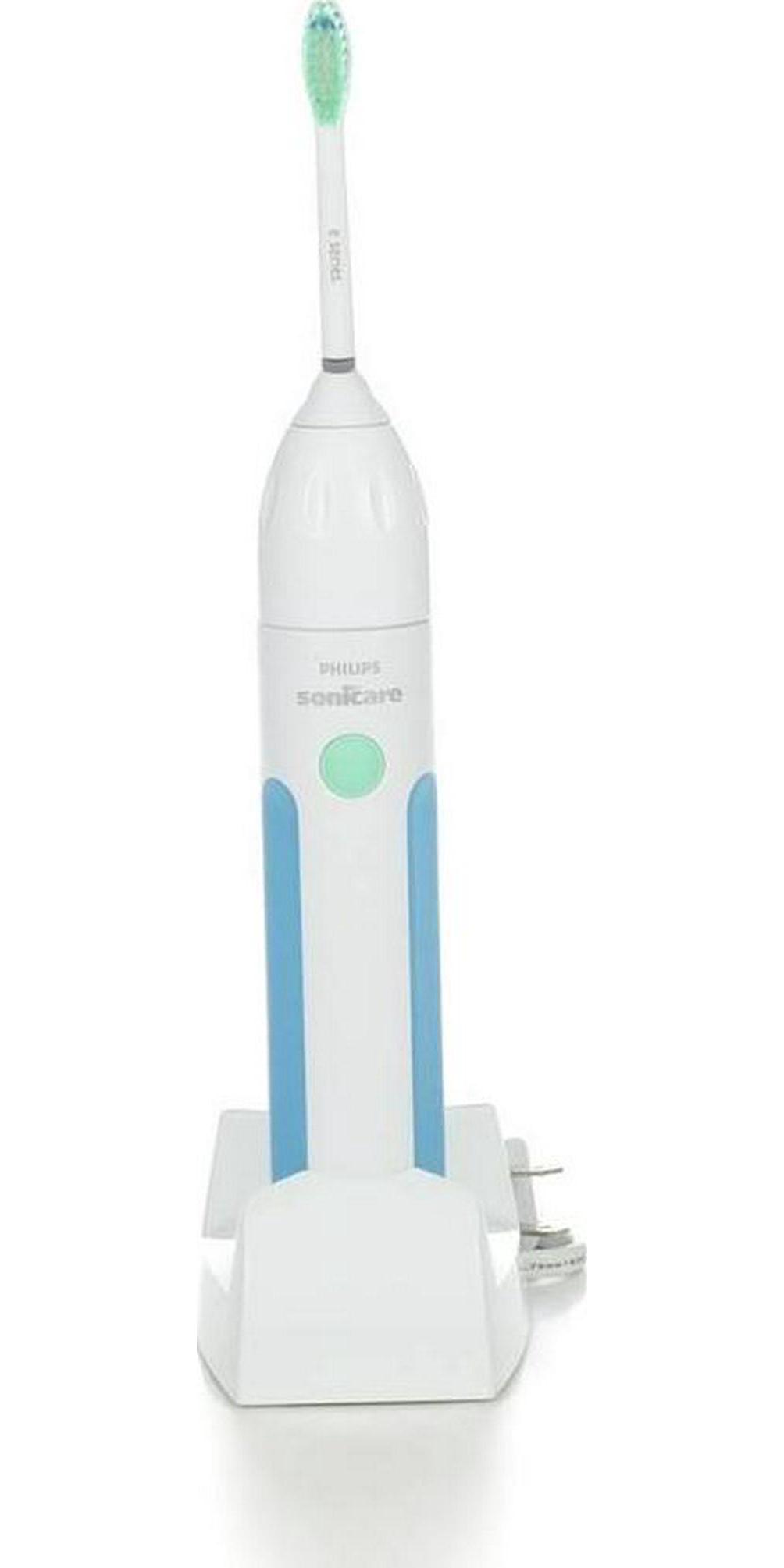 Philips Sonicare Essence Rechargeable Sonic Toothbrush has a 2 Minute Timer that helps ensure dental professional recommended brushing time. The soft grip helps you better control your Sonicare toothbrush and adds comfort. The uniquely angled brush head neck of this toothbrush head makes it easier to reach back teeth, removing plaque in those hard-to-reach areas. It also removes up to 2 times more plaque than a manual toothbrush. Includes: 1 Charger & Soft Travel Case. 2 Year Limited Warranty.