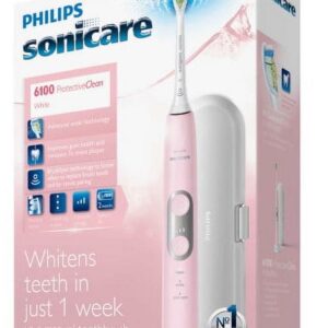 ProtectiveClean 6100 rechargeable electric toothbrush delivers up to 100% less stains in just 7 days to whiten your teeth in just 1-week vs a manual toothbrush. It has a pressure sensor that protects teeth and gums from excess brushing pressure. Brush heads wear out over time. Our BrushSync technology tracks how long you have been using your DiamondClean brush head and how hard you have been brushing. It will beep to inform you when to replace your brush head. Customize your own brushing experience with intensity settings and your choice of 3 modes: Clean, White and Gum Care. The easy-start feature slowly increases the power of the brush as you get used to the Sonicare experience and the smartimer encourages a full 2 minutes brushing time as recommended by your dental professional. The battery charge indicator light lets you know when it is time recharge; 2 week battery life. The kit includes 1 ProtectiveClean 6100 handle, 1 DiamondClean brush head, 1 charger, 1 travel case