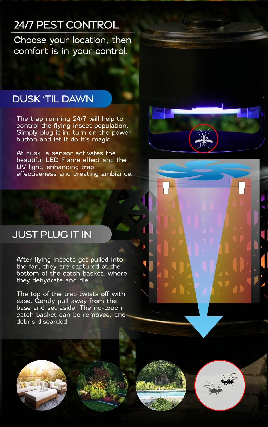 The PIC Insect Killer Vacuum Trap with LED Flame Effect is the newest innovation from Pic Corporation. With its gorgeous unique modern window design and its 120 volts of power, this powerful bug zapper discreetly Kills Bugs on Contact. Simply plug in this electronic bug zapper and enjoy a bug-free outdoors. This weatherproof flying insect and mosquito killer can withstand wind and rain while preventing rust. This bug zapper protects a 1-acre area. With a flickering flame LED, this insect killer looks like an open flame without the hazard of one. This decorative flying insect trap even doubles as an outdoor decor statement piece! Add PIC Octenol Mosquito Lure attractant to improve device effectiveness.