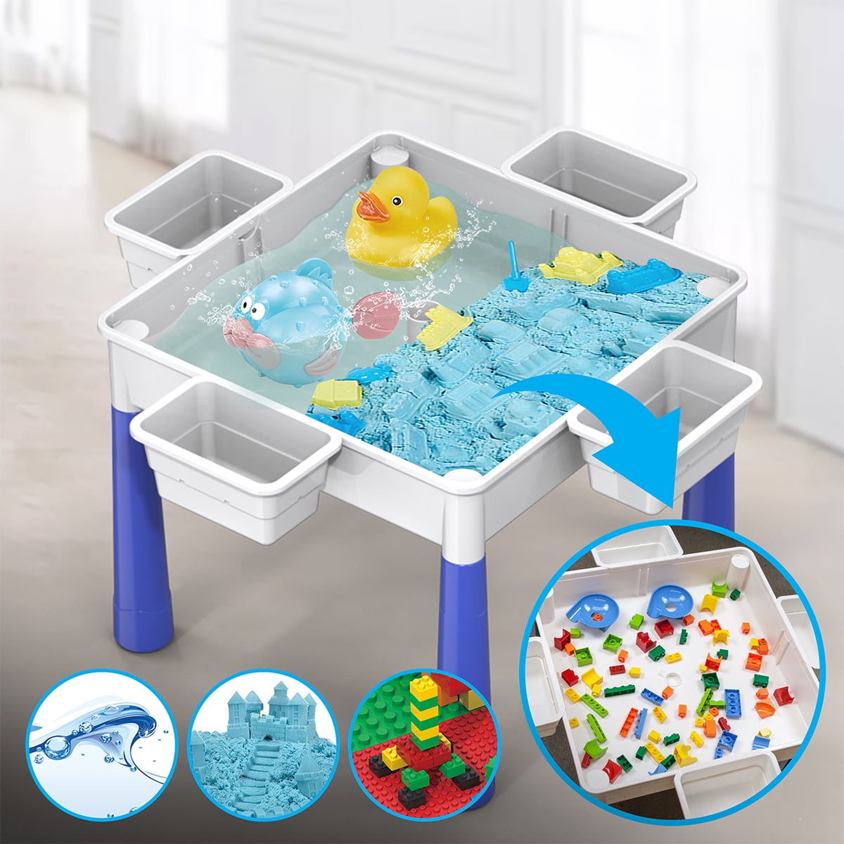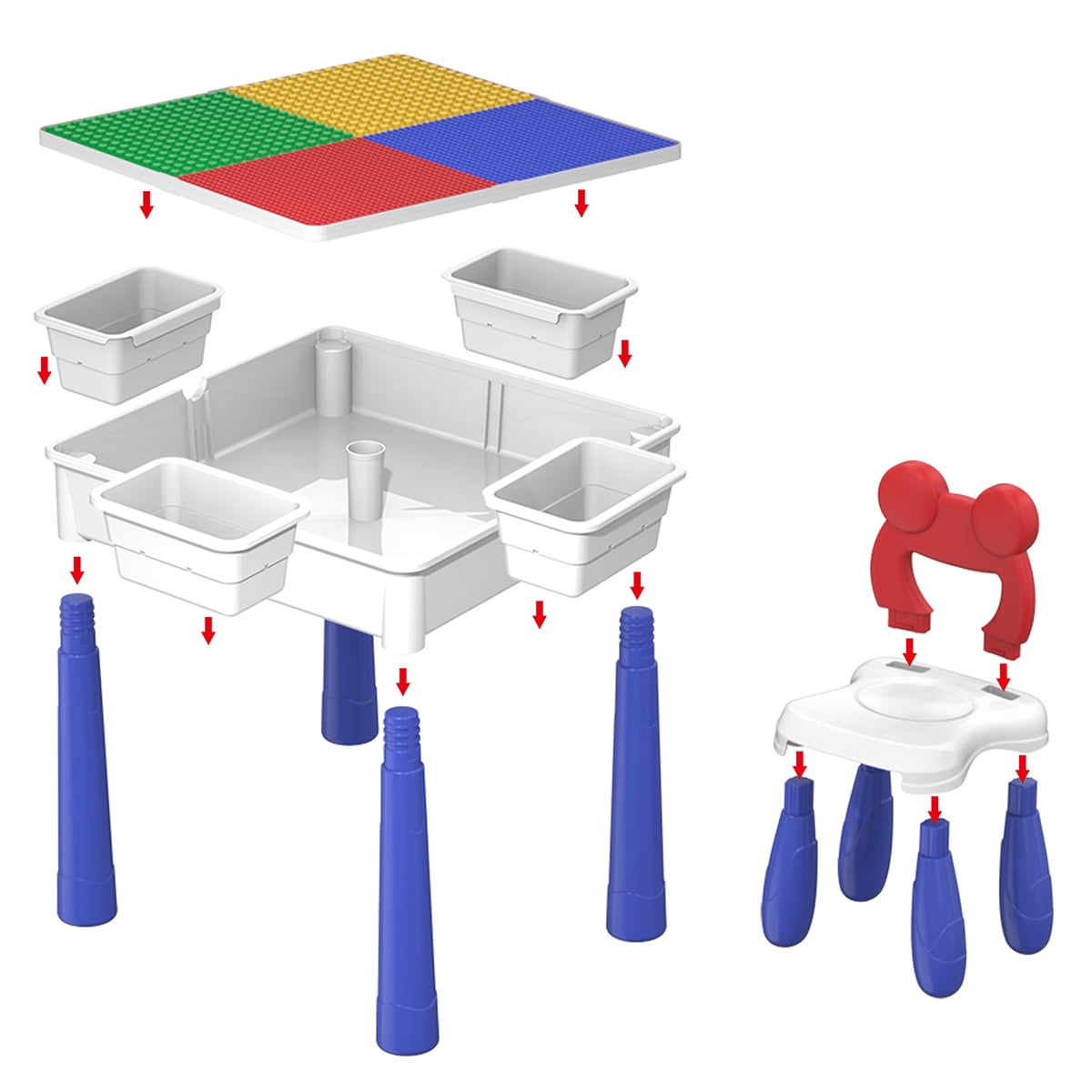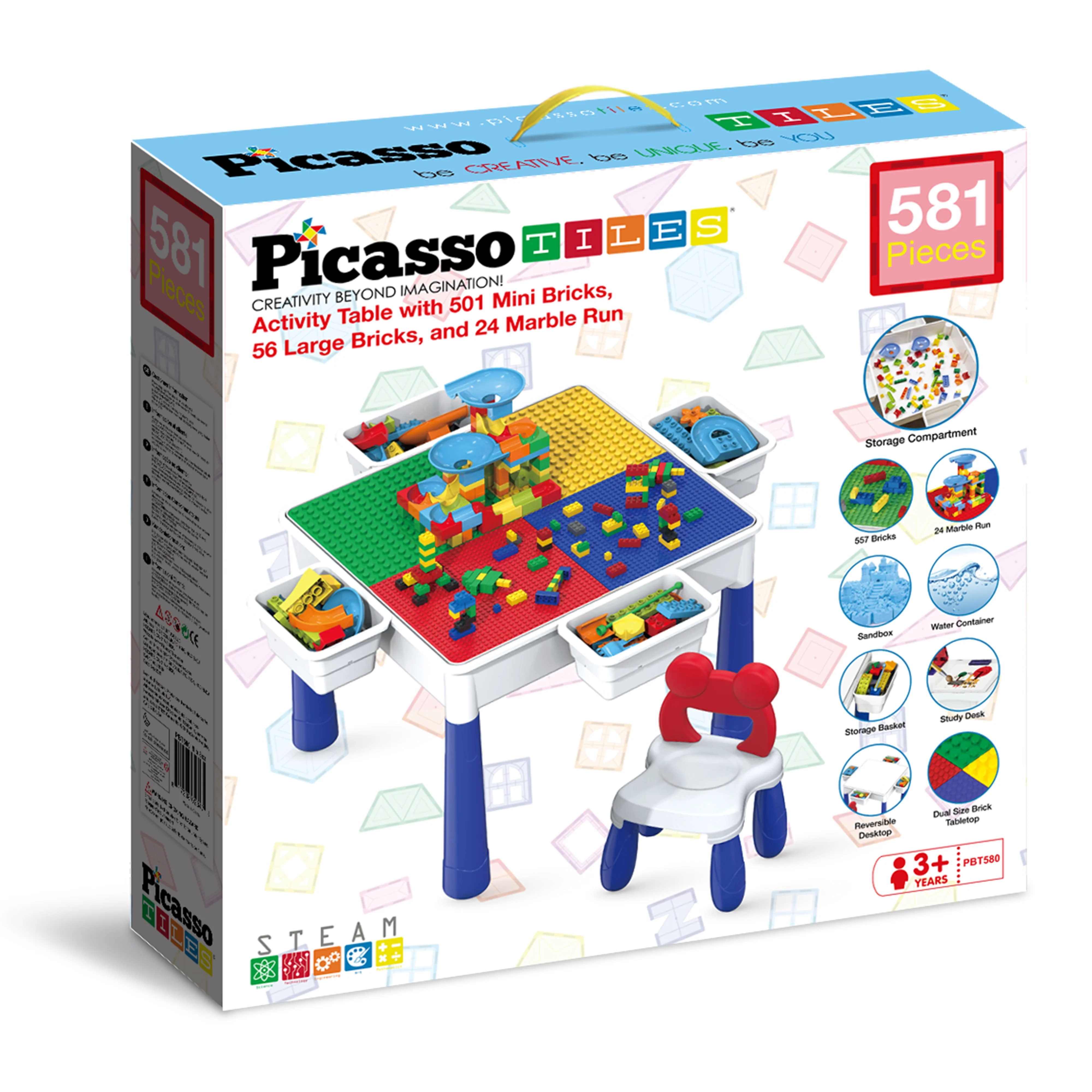 PicassoTiles PBT580 activity table transforms between a sandbox, study desk, water-tight container, marble run, and brick block playset. It features a reversible table top with dual side panels for building or flat surface activities and includes a large compartment for storage or water play. Lightweight and adjustable, it includes a kid-sized chair and supports both indoor and outdoor play, fostering creativity and STEM learning for children. The kit promotes logic training, critical thinking, problem-solving, and hand-eye coordination skills. All-in-one enables the kids to learn by intuitive play and bring out the best of all to be artistically creative. This is a very suitable educational toy for children in 3 4 5 6 7 8 and over years old.