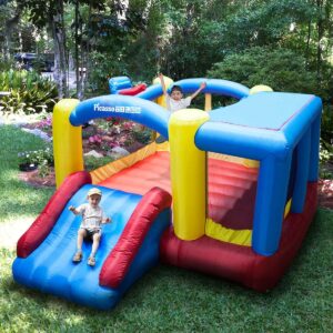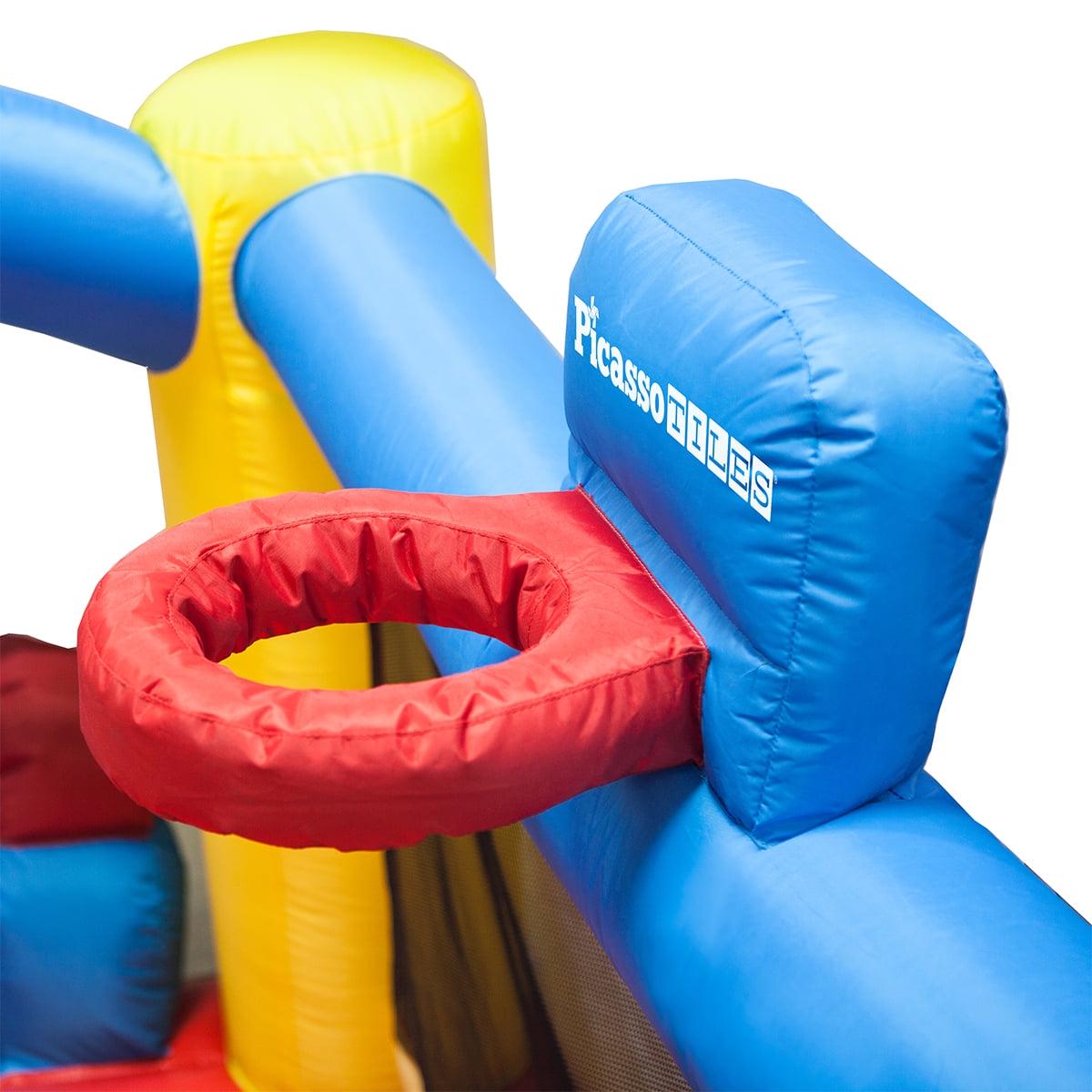 PicassoTiles KC102 Jump & Slide & Dunk Bouncing House includes built-in basketball rim and four sports balls providing children and families varieties of entertainment, outdoor recreation, and bonding time together than the traditional bouncer. It features an extended size slide, advanced basketball rim for dunking and innovative Velcro tape retractable cover design to provide the open top space or shade area in summer time. It is large enough to accommodate three children under a total of 250 lbs. Inflatable Bouncer Type: Outdoor Bounce House