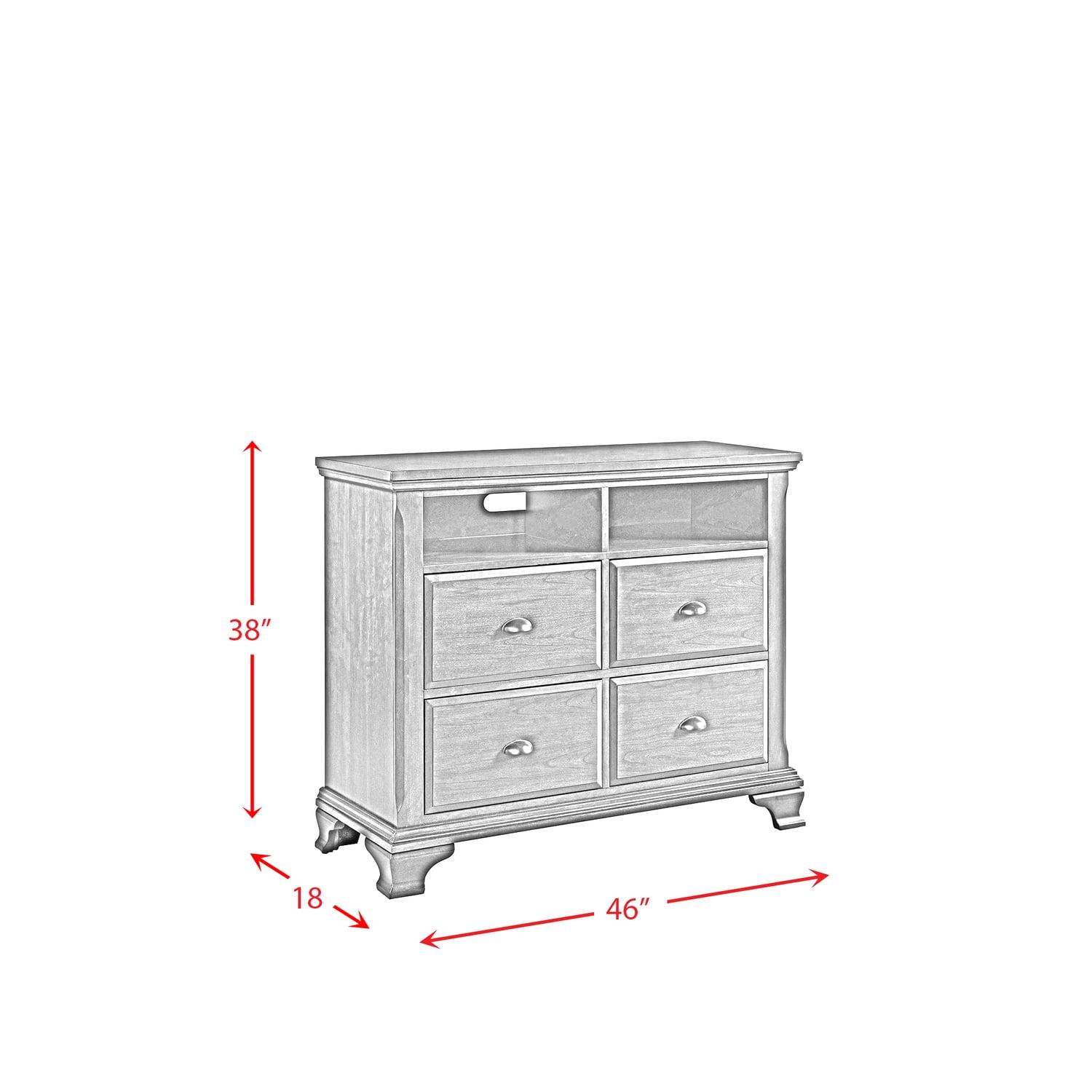 Set up an entertainment center in your living room with the Picket House Brinley Cherry TV Chest. A flat top supports your flat screen TV while two open shelves accommodate Blu-Ray and DVD players or gaming consoles. The cable management cut-outs at the back allow for easily connecting your devices to the television. Four drawers with curved handles offer space for movie discs as well as extra cables and other items. The warm finish of this cherry TV stand, as well as the curved legs and elegant, timeless style, coordinate with other the other furnishings in your space.