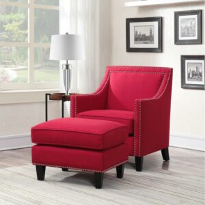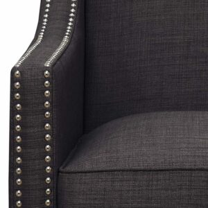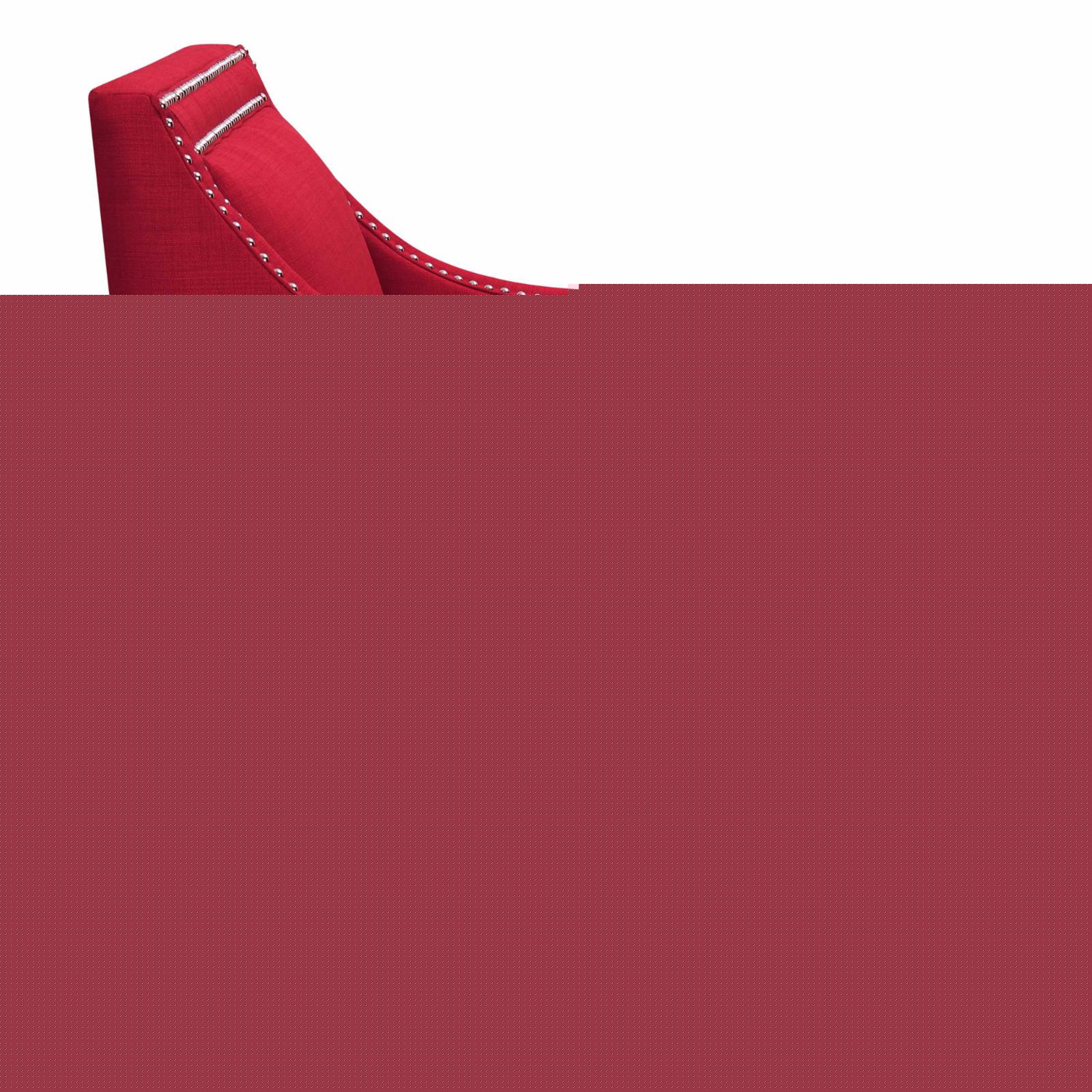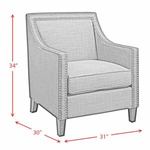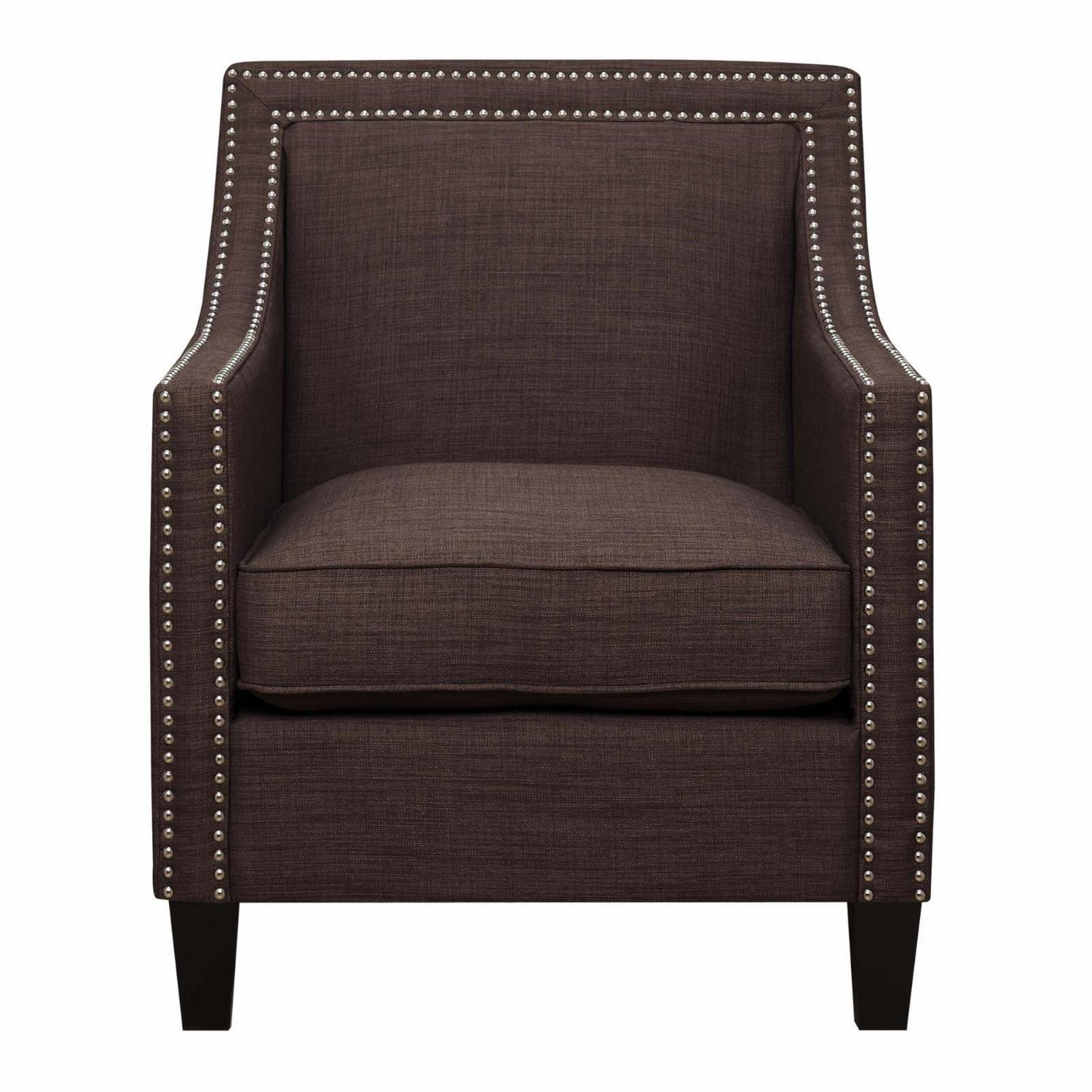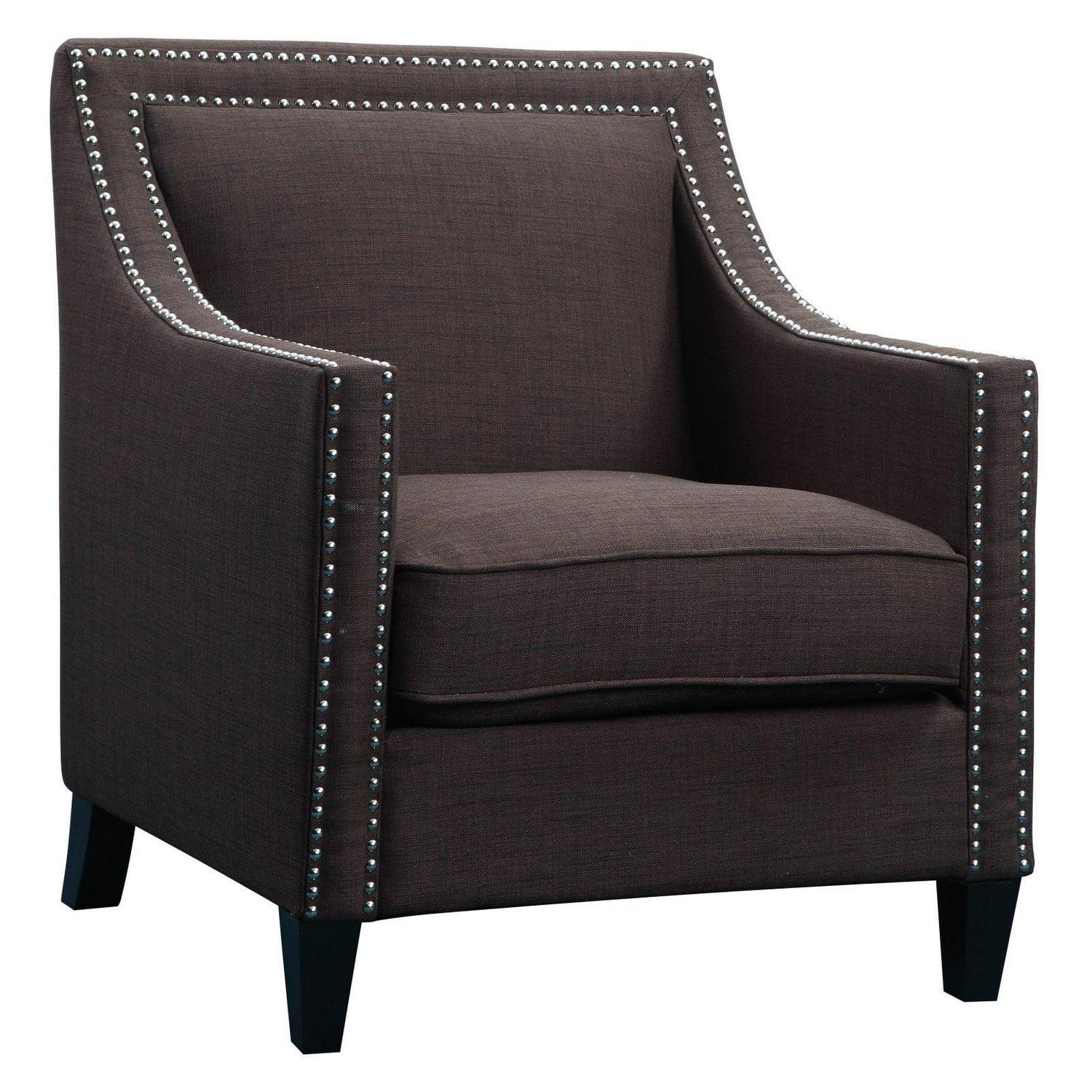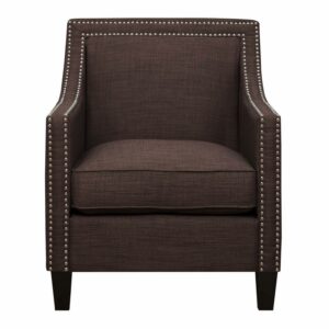The Picket House Furnishings Erica Chair with Chrome Nailhead Trim is a sophisticated design available in a variety of energetic colors to add charisma to your living room or office. This vibrant take on the traditional armchair retains its vintage flare and the quality construction that comes with it. The chair is crafted from the perfect mix of solid hardwood and MDF with pocket coils and thick foam cushioning wrapped in easy-to-clean polyester fabric. The wood legs come in a dark espresso and the trim of the chair is outlined in polished, hand-applied nail heads.