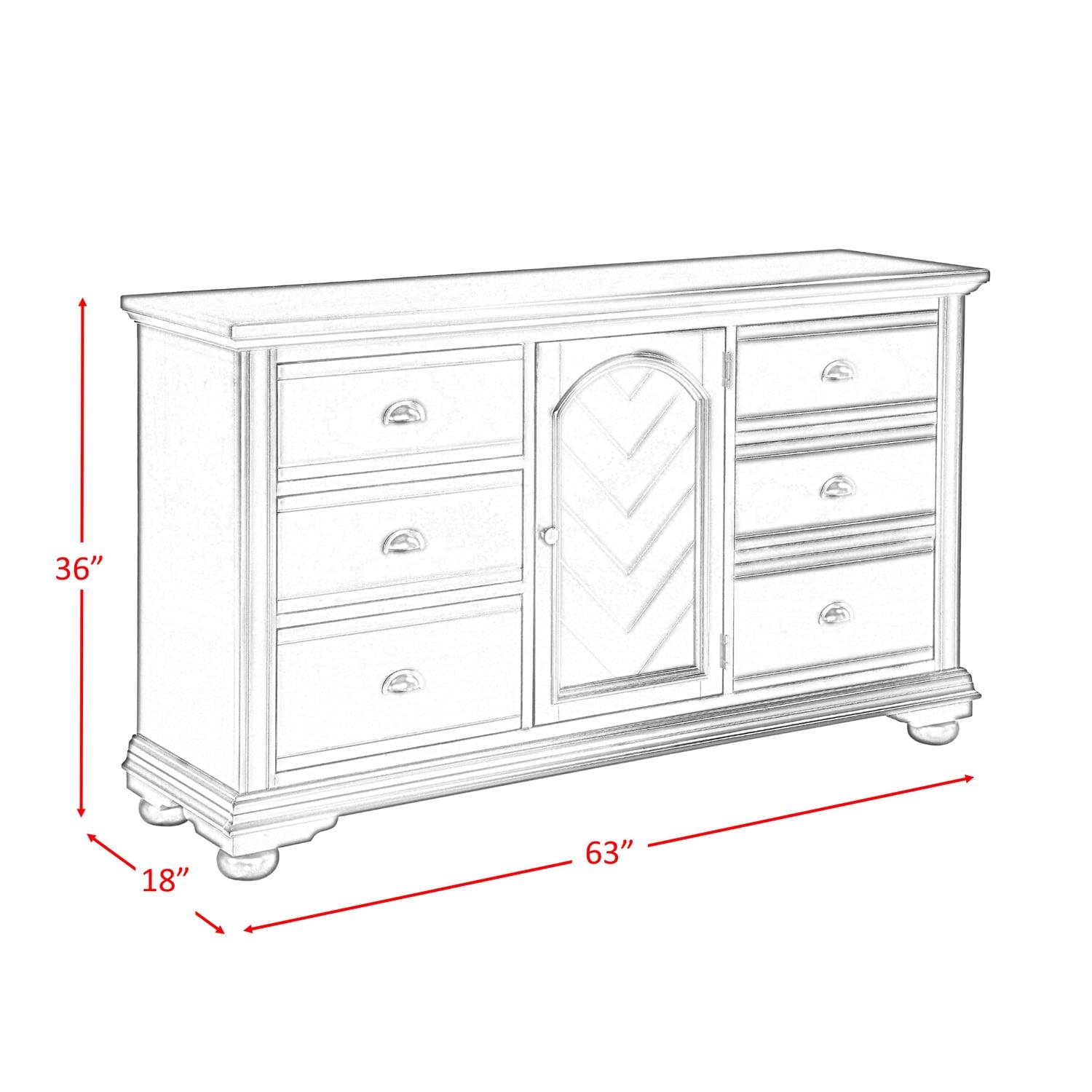 The Picket House Furnishings Addison 6-Drawer Dresser is the perfect addition to your bedroom! This dresser comes with six spacious drawers and one sizable cabinet. Inside the cabinet are two adjustable shelves, allowing you to customize your storage space. The cabinet door features chevron pattern veneers adding an extra dash of style. The bottom drawers feature a dust proofing layer to help protect your belongings. Dark metal hardware complete the drawer fronts. This dresser brings the cottage charm with its casual white finish.