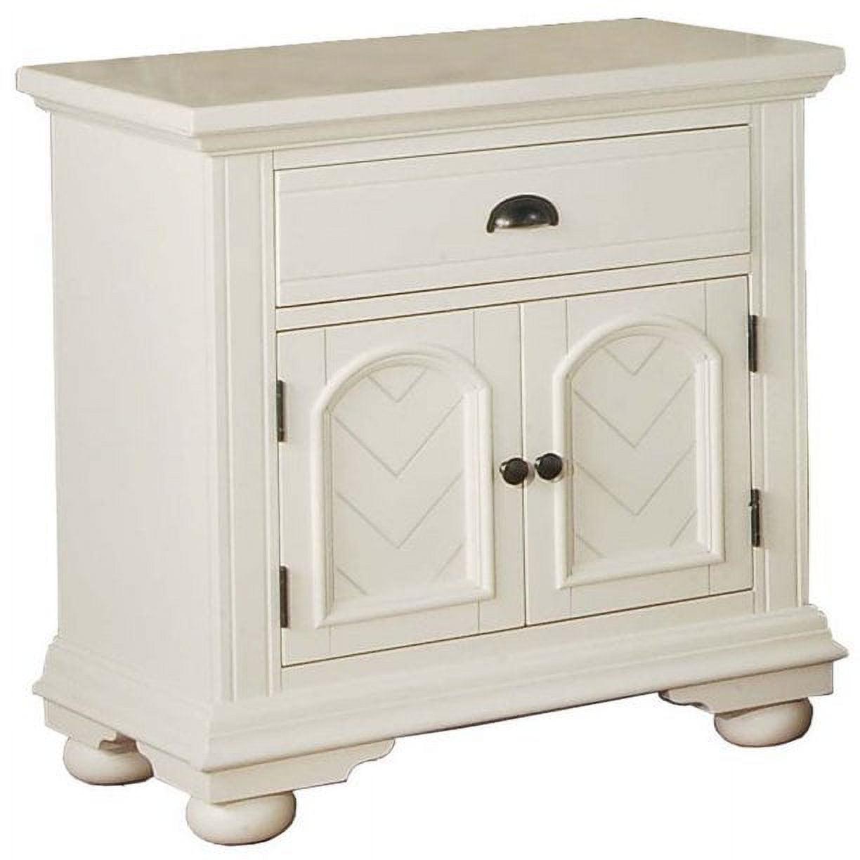 The Picket House Furnishings Addison 1-Drawer Nightstand gives your room the look and feel of cottage charm. This collection features chevron patterned veneers and ornamental molding in a casual white finish, giving this nightstand unparalleled warmth and individuality. This nightstand comes with one spacious drawer and cabinet; perfecto for storing away all of your bedside necessities and keeping them within reach. Dark metal drawer knobs and pull complement the white finish beautifully. Bevel edges and bun feet complete the look of this traditional design.