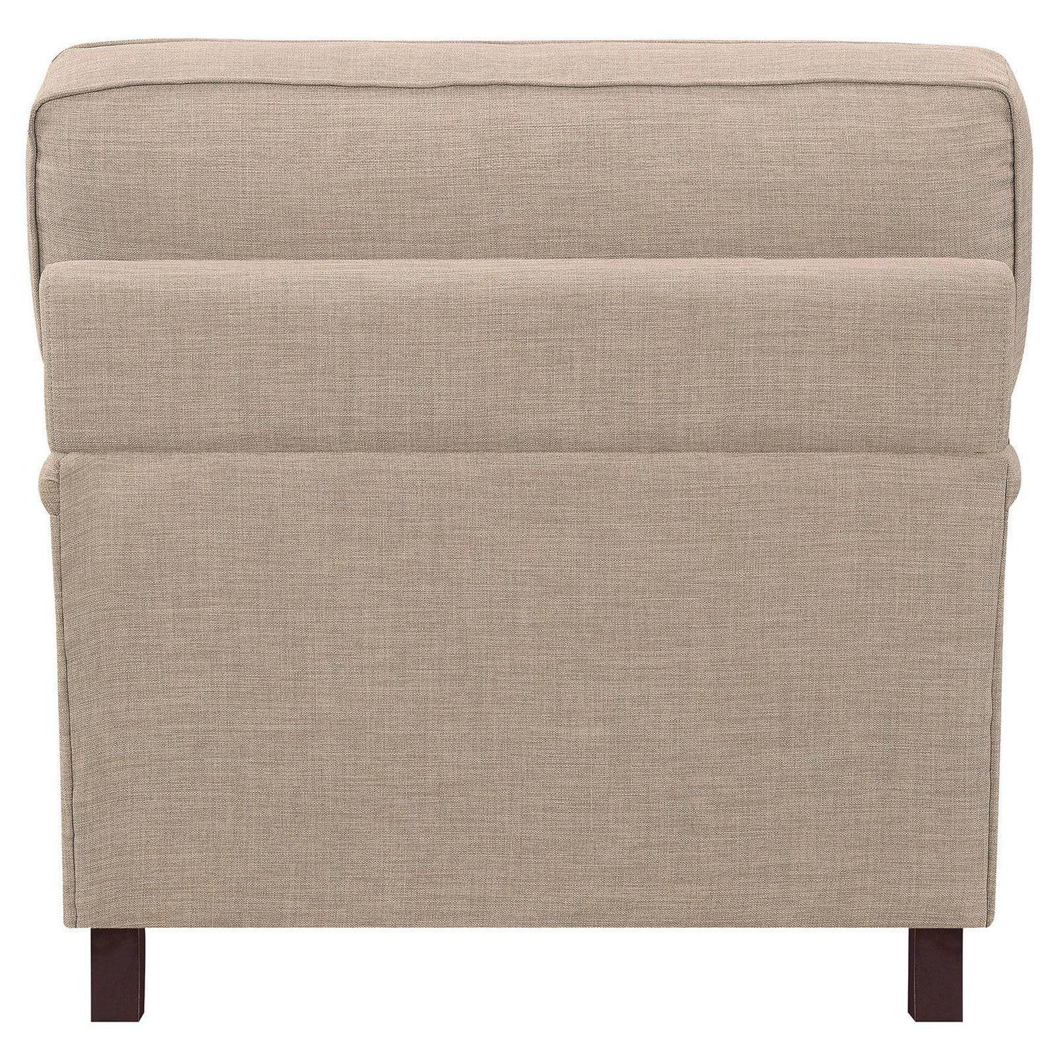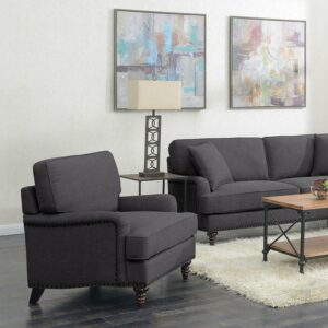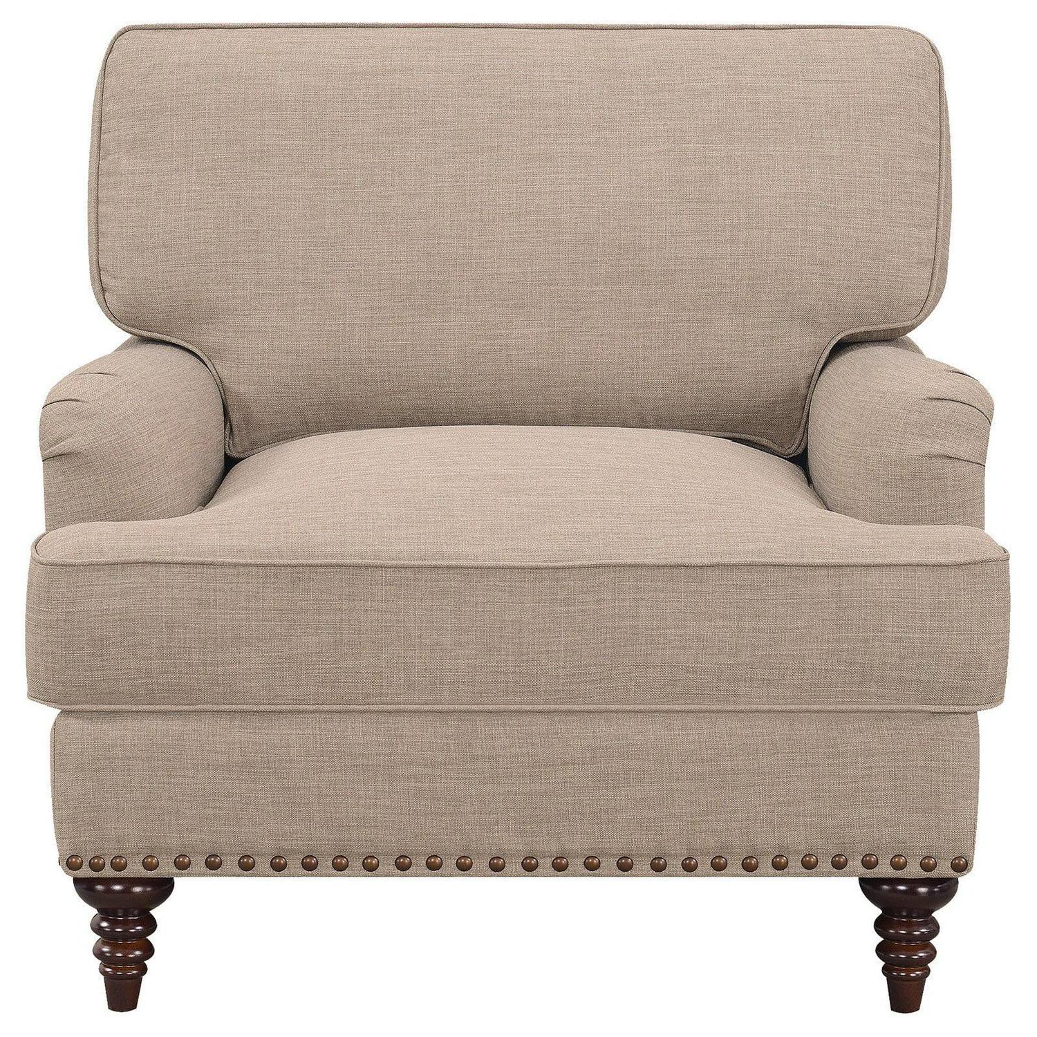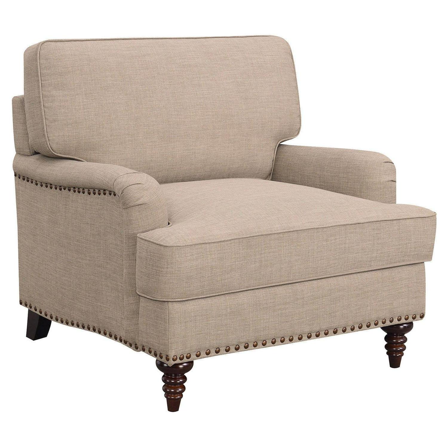 The Picket House Furnishings Cassandra Chair is the perfect addition to your home! This chair comes in a transitional color, making it easy to pair with any existing d cor. The chair features slightly rounder arms and detail piping along the cushions. Nail head trim is present along the outer edges and base of the chair, adding extra flair to this already stylish piece. The turnip style feet brings a touch of traditional style. Foam cushion filling will have you never wanting to leave, making it the perfect choice for your living room!
