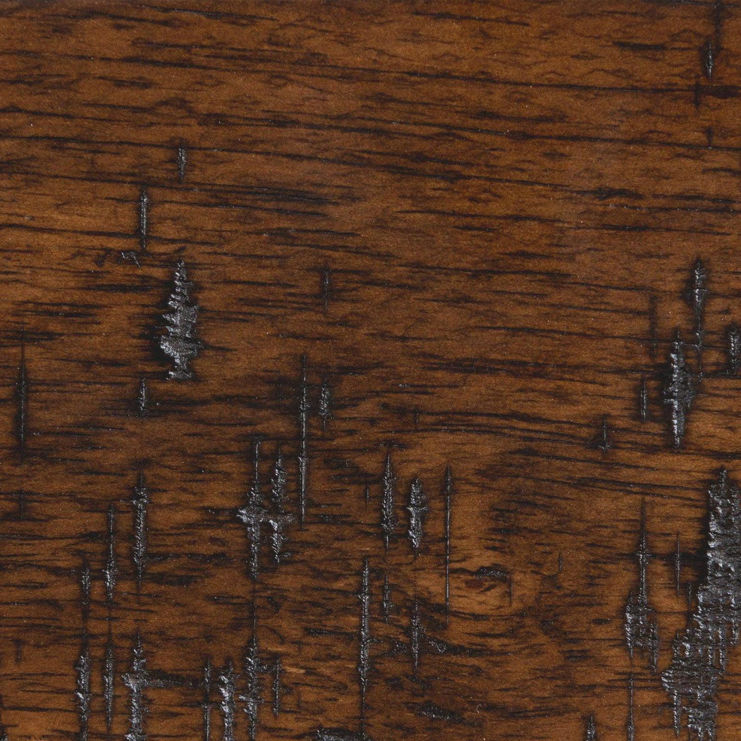 - Dark taupe fabric and physically distressed walnut wood finish