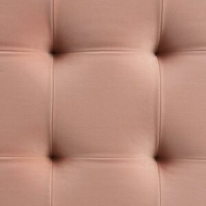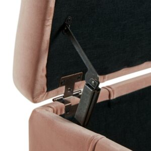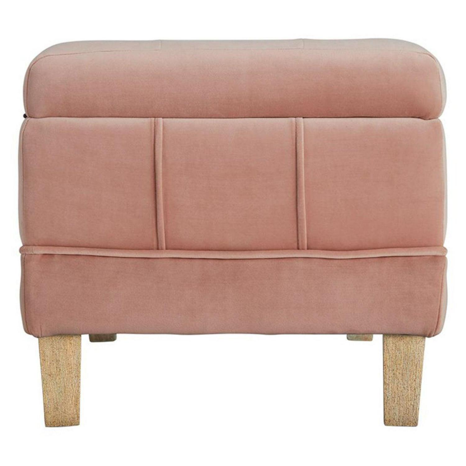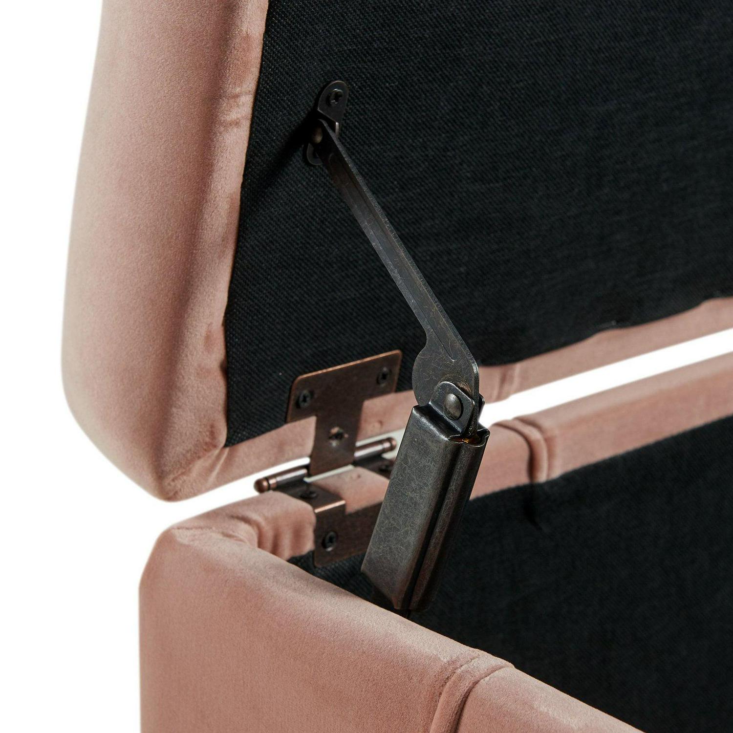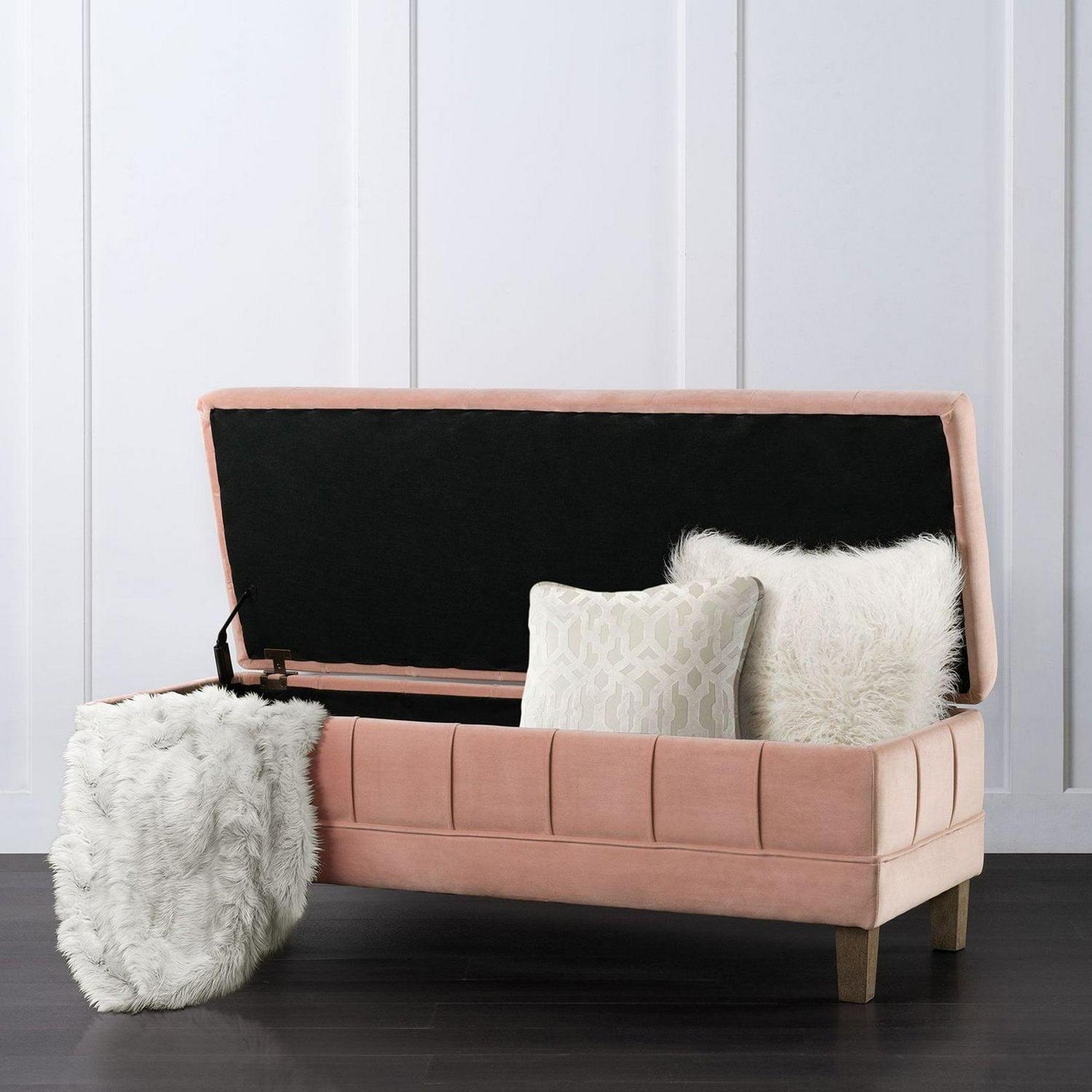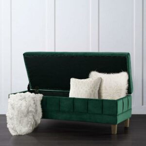 One of the best things about the stylish Picket House Furnishings Jude Tufted Velvet Bedroom Bench is that the top may be flipped open to reveal hidden storage for your extra blankets and pillows. This bedroom bench features a foam padded seat you may use to put your shoes on every morning. The engineered wood and rubberwood frame is upholstered with polyester in your choice of available color. The round and tapered legs paired with the tufted and stripe design complete the elegant look of this bench.